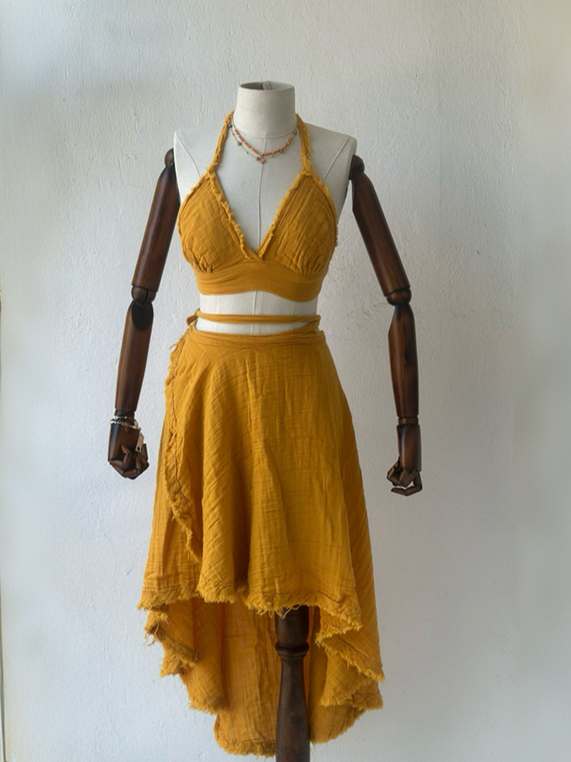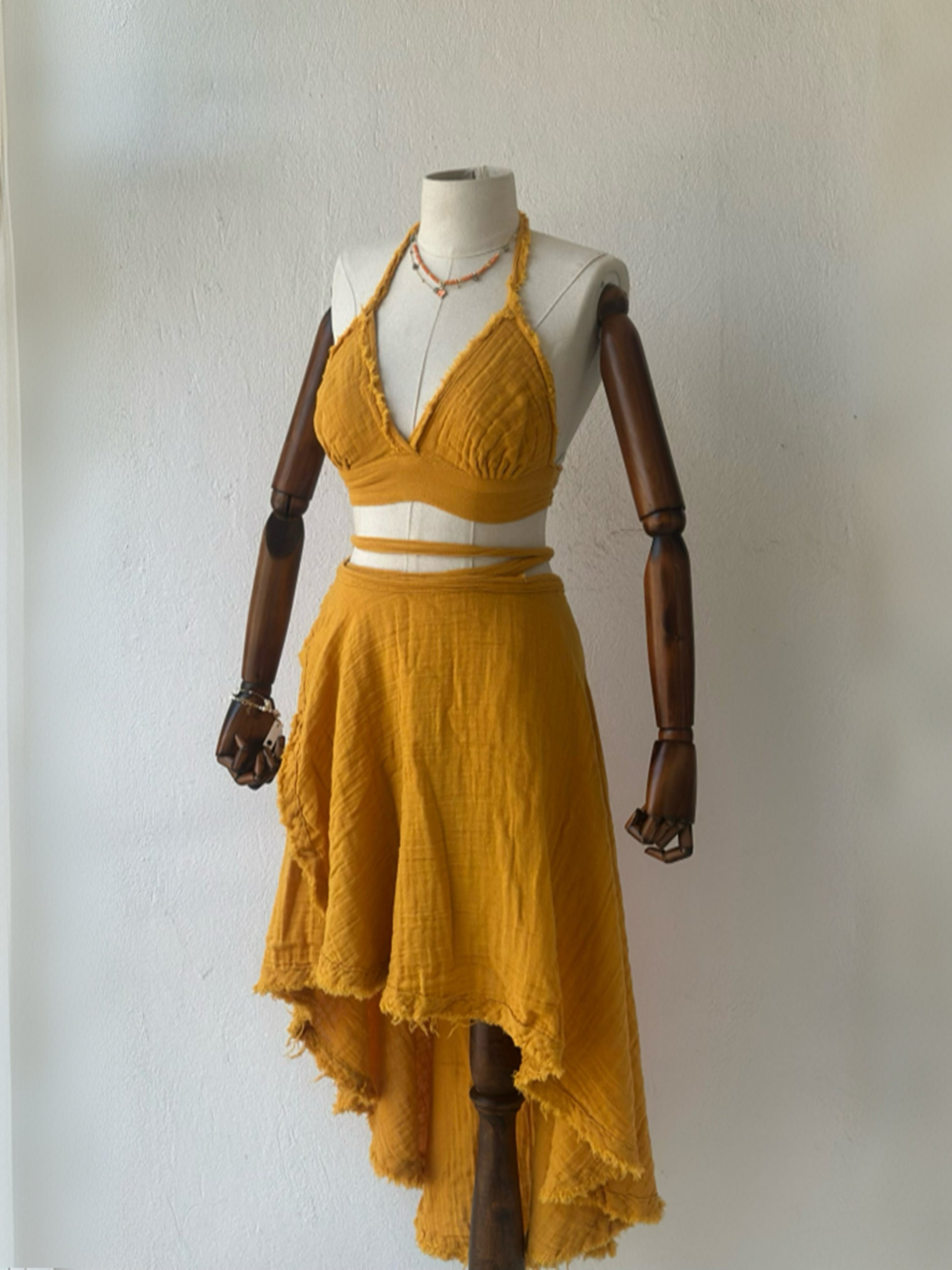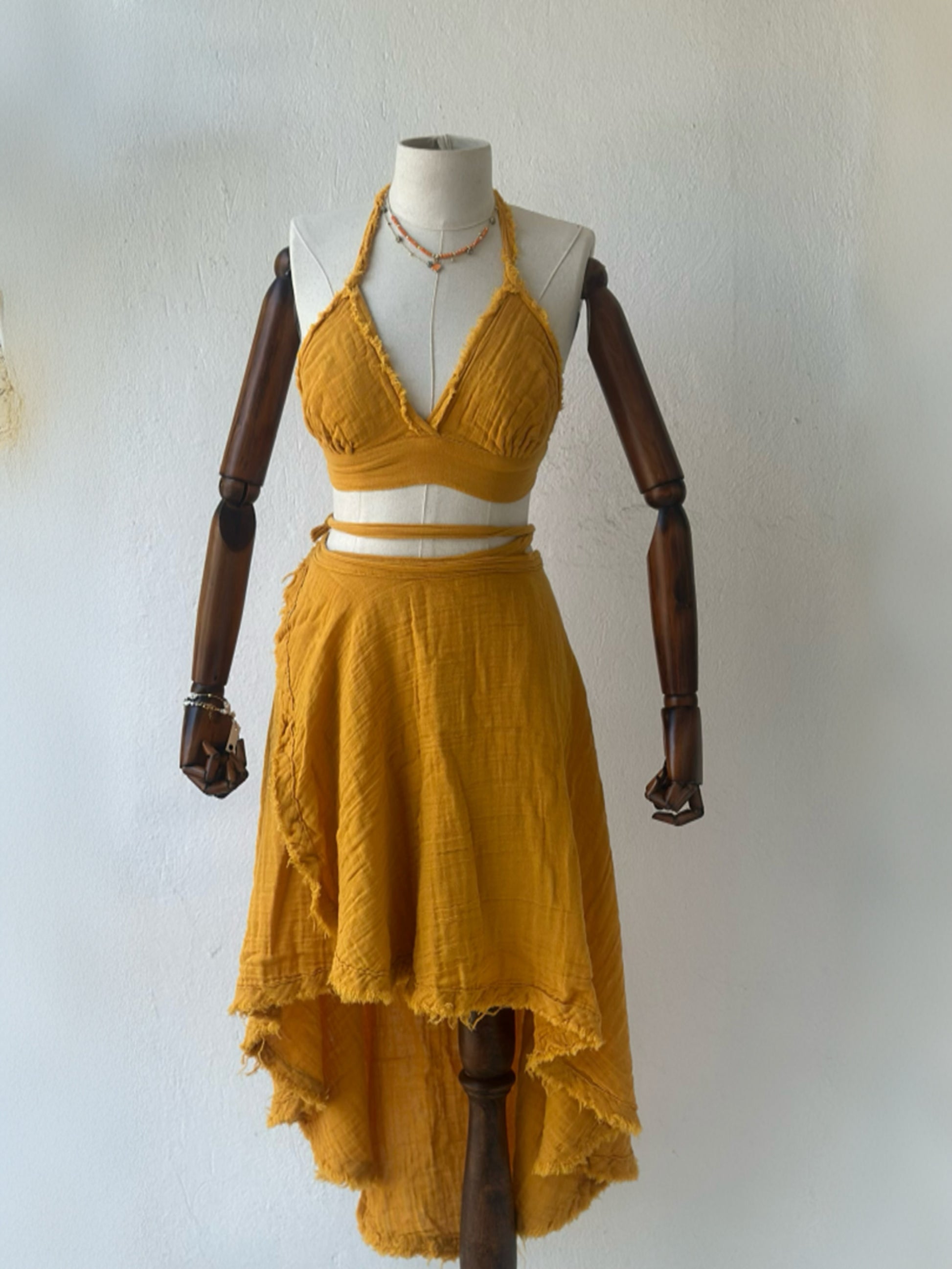 Üst parça destekli büstiyer, alt parça ise farklı şekillerde bağlanabilen özel kesim etek.
