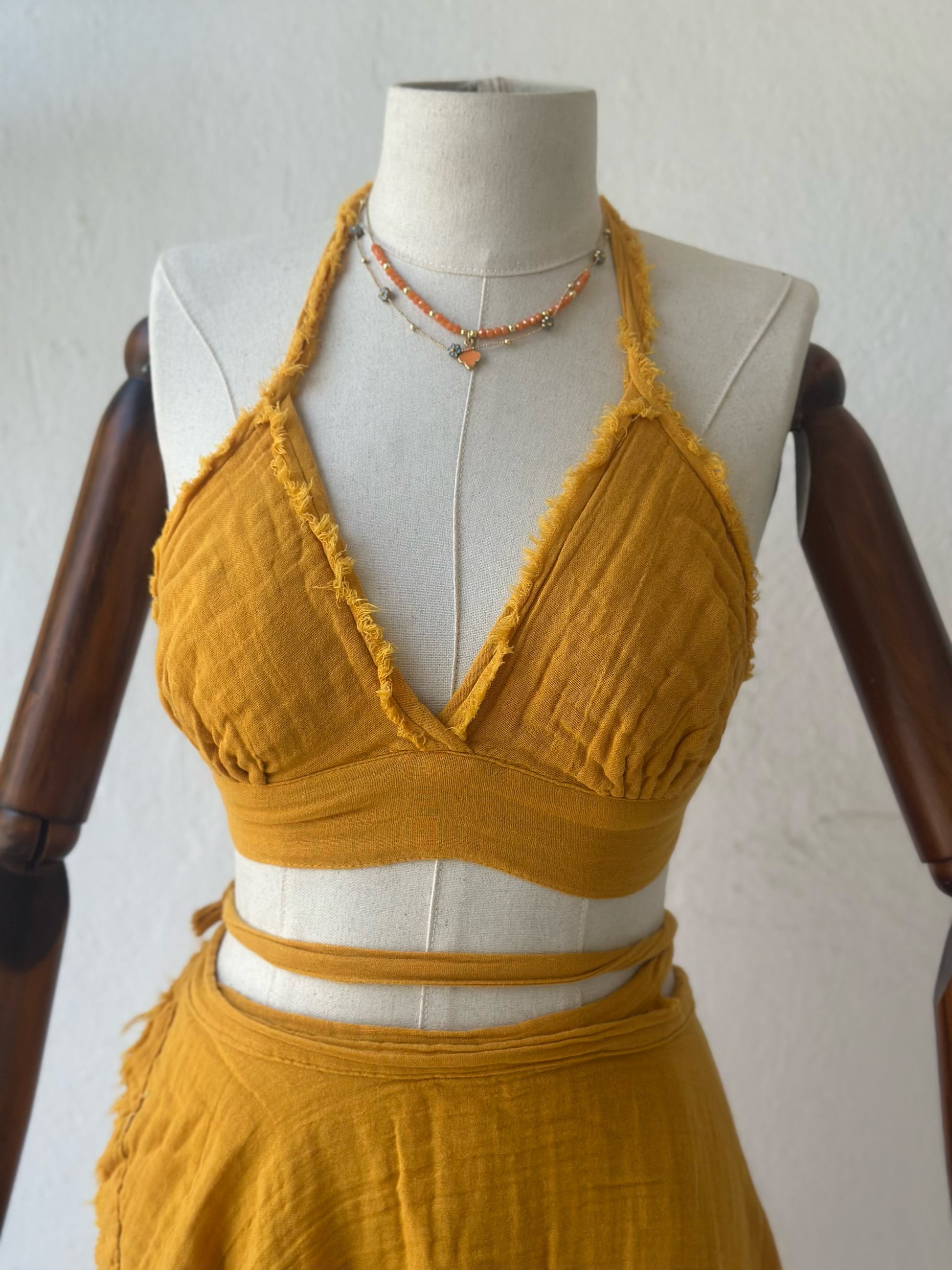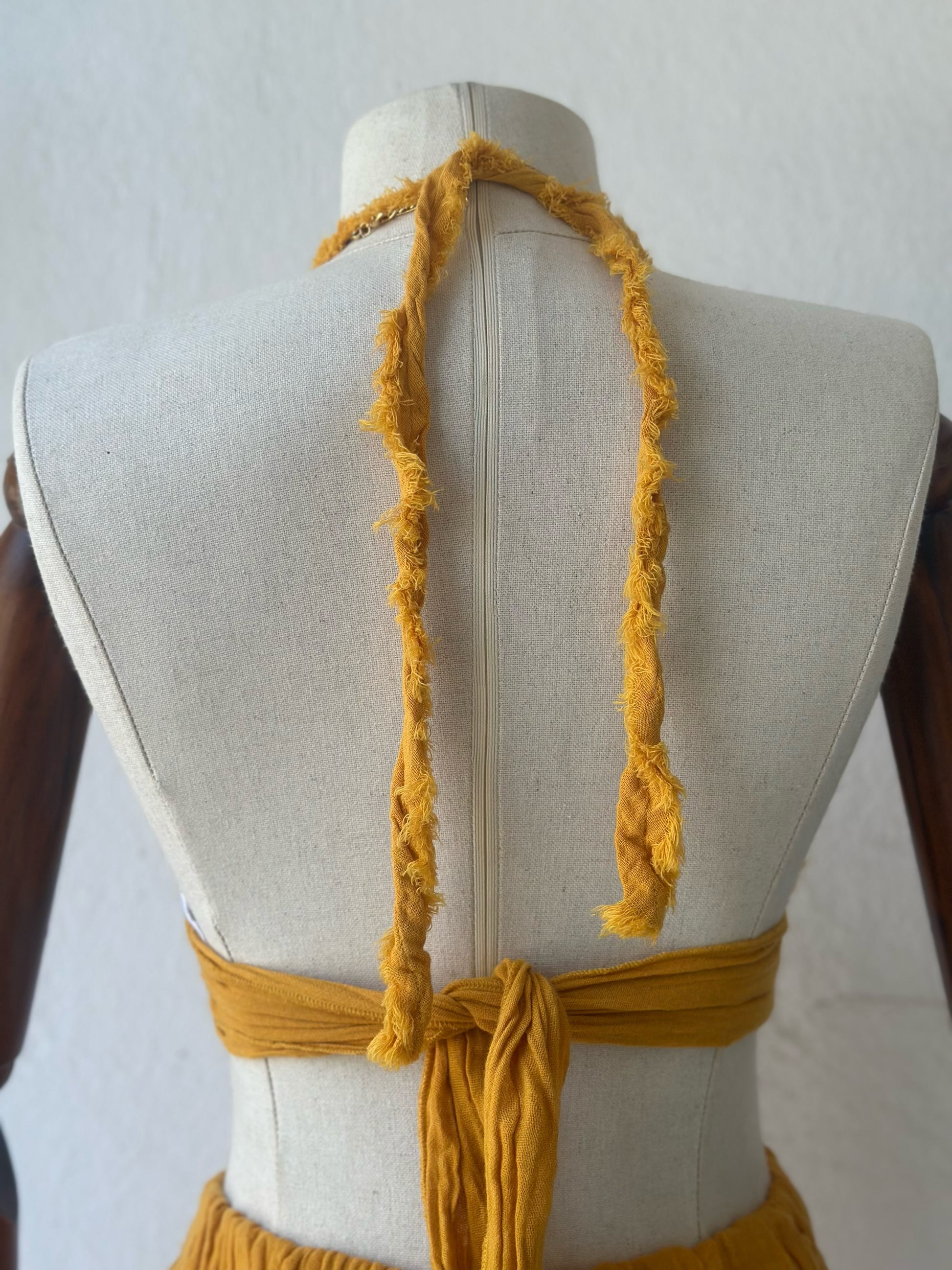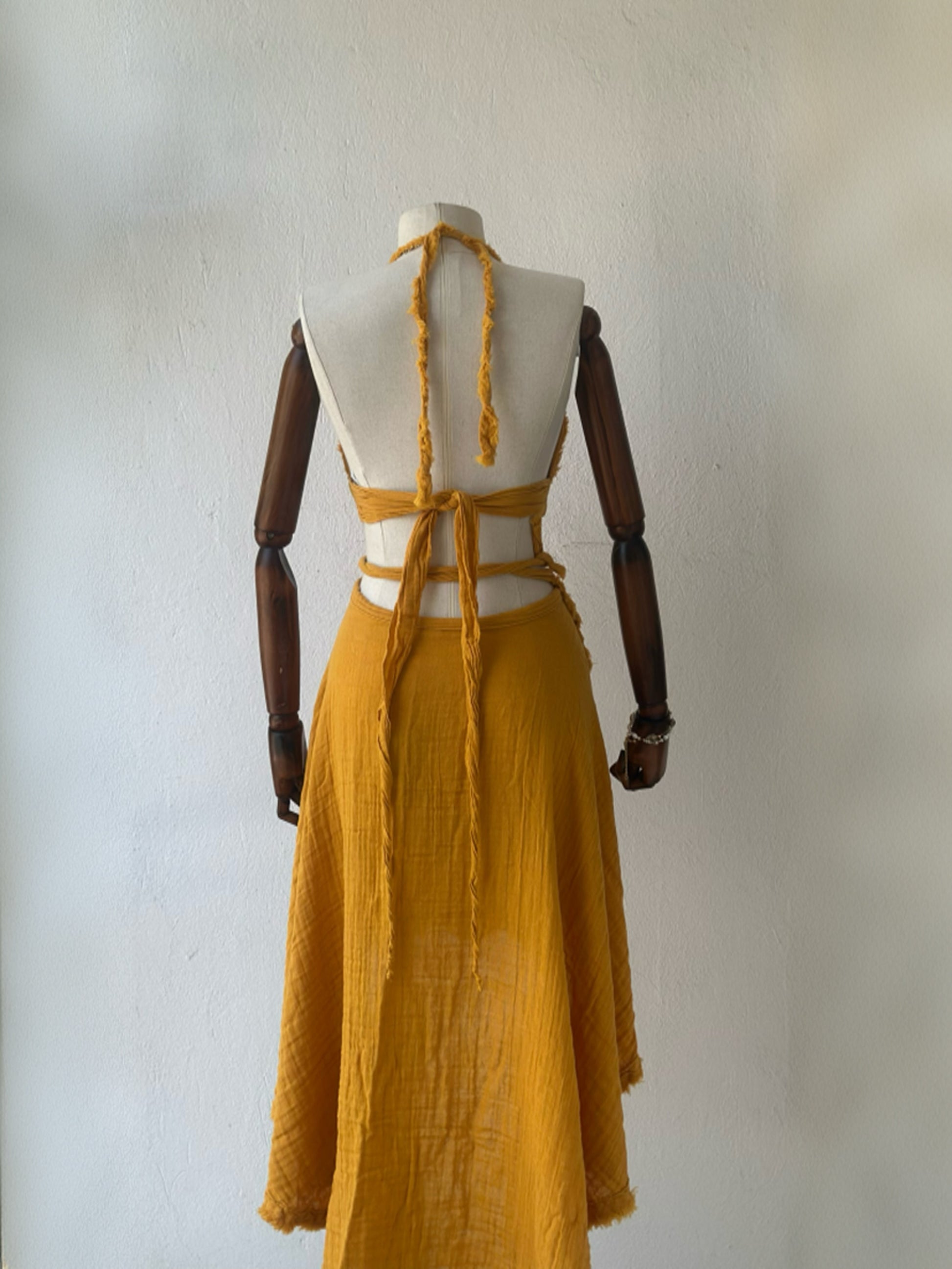 Üst parça destekli büstiyer, alt parça ise farklı şekillerde bağlanabilen özel kesim etek.