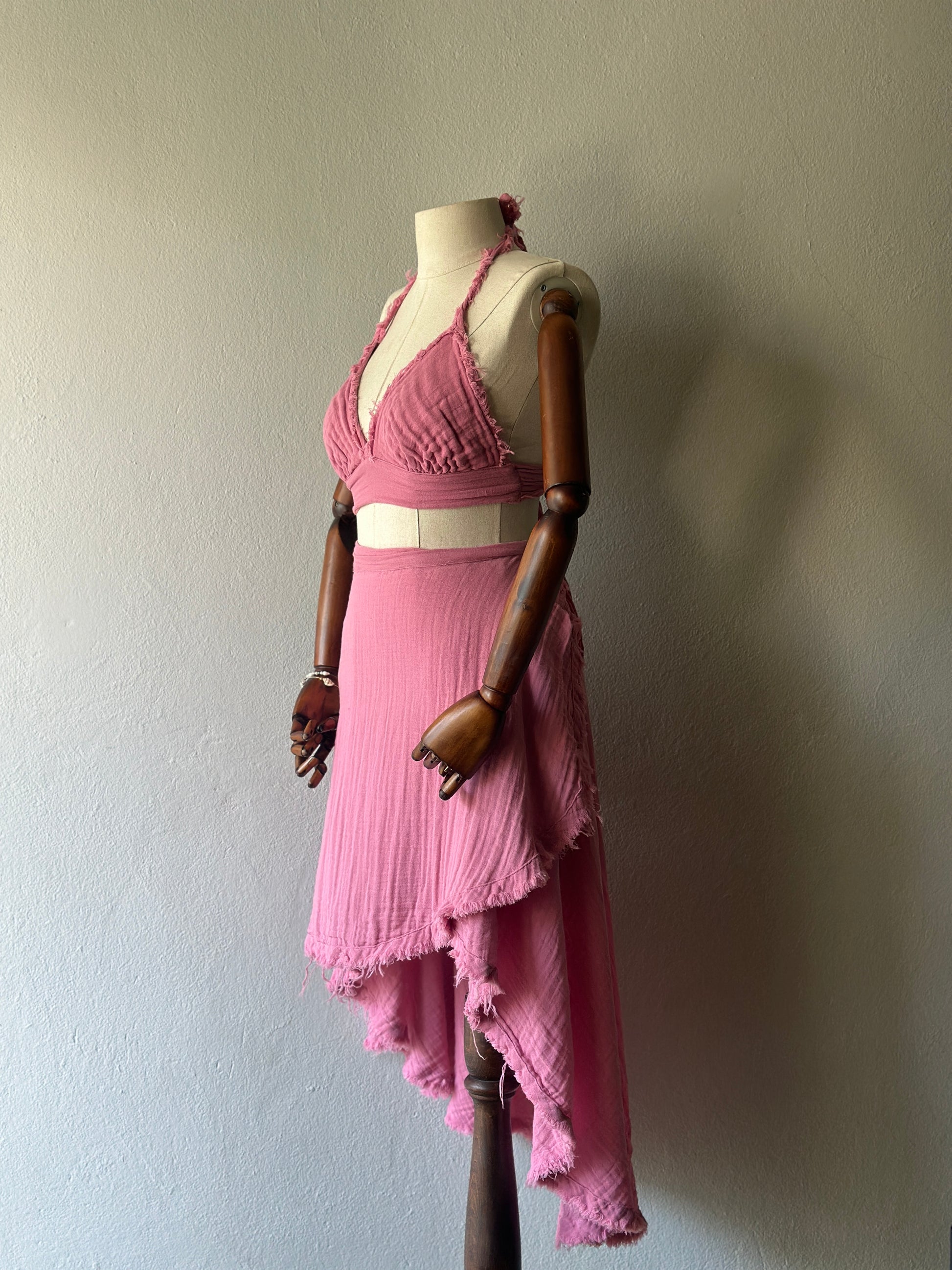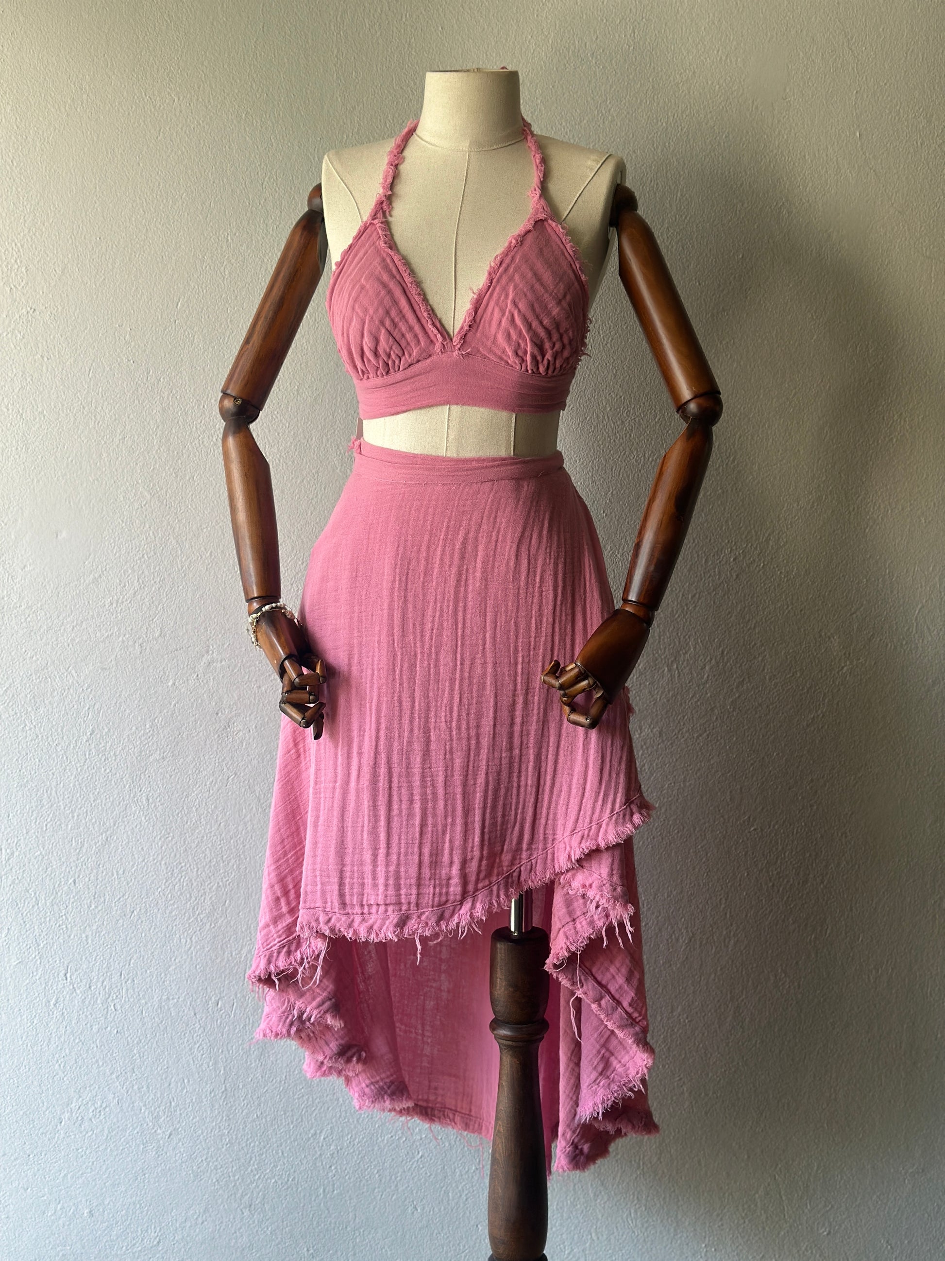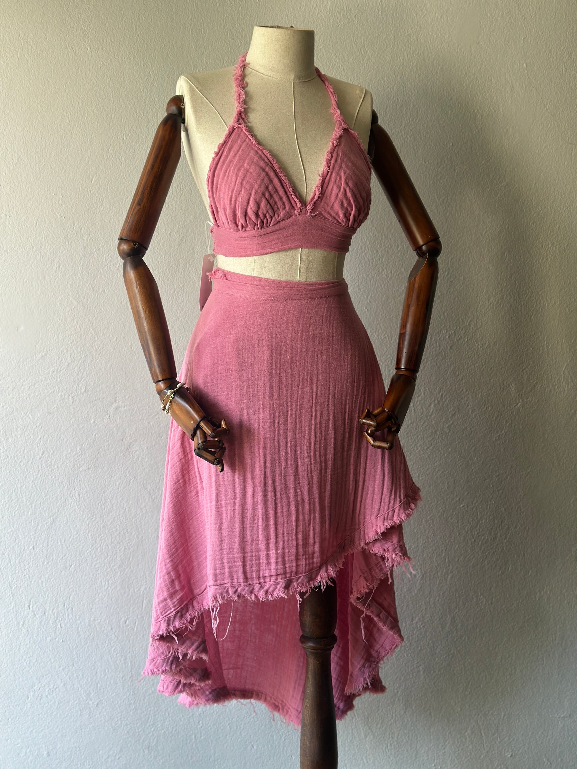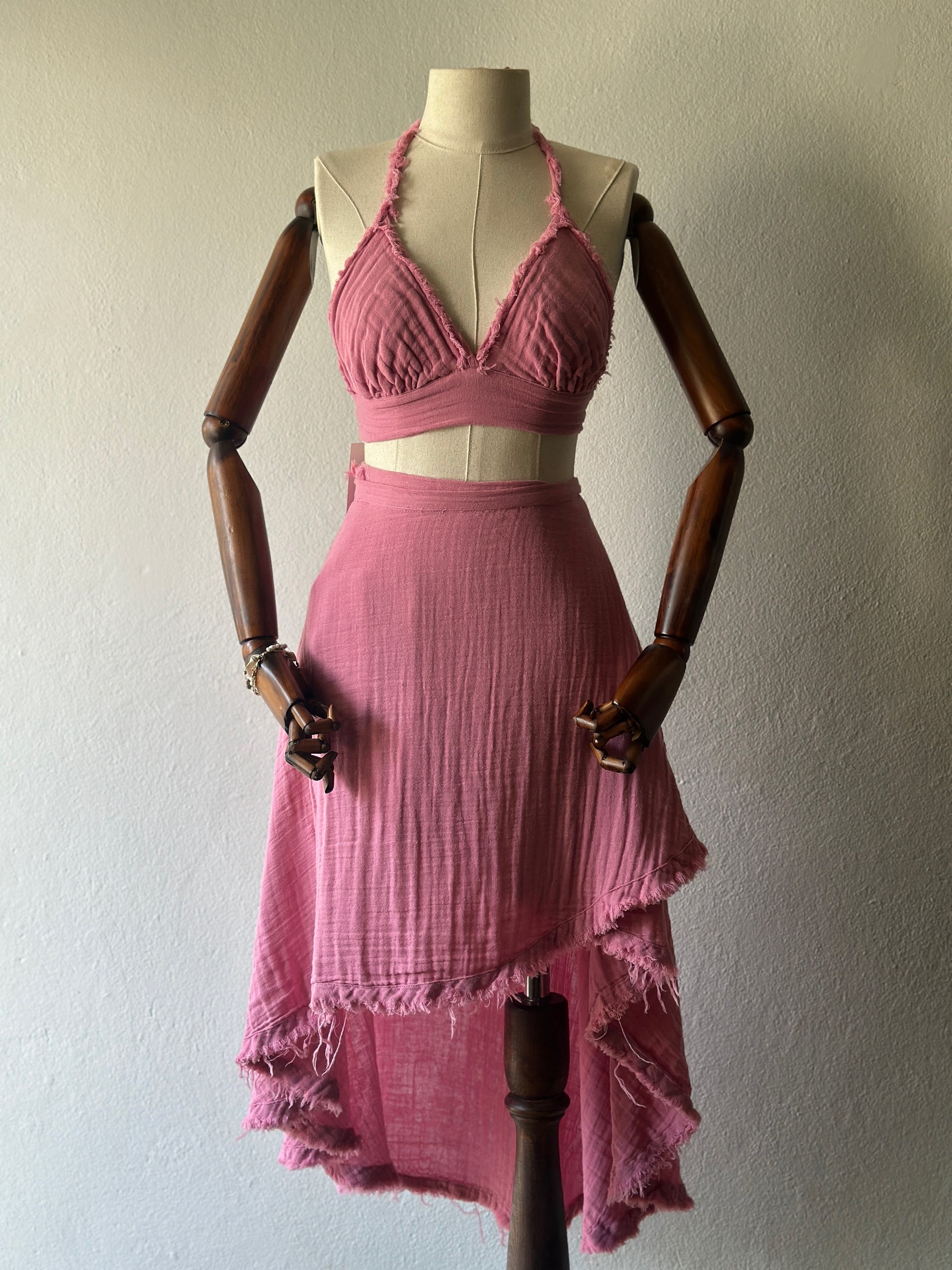 Pamuklu dokusu ve asimetrik etek kesimiyle dikkat çeken bu takım, hem şık hem de feminen bir duruş sunar.