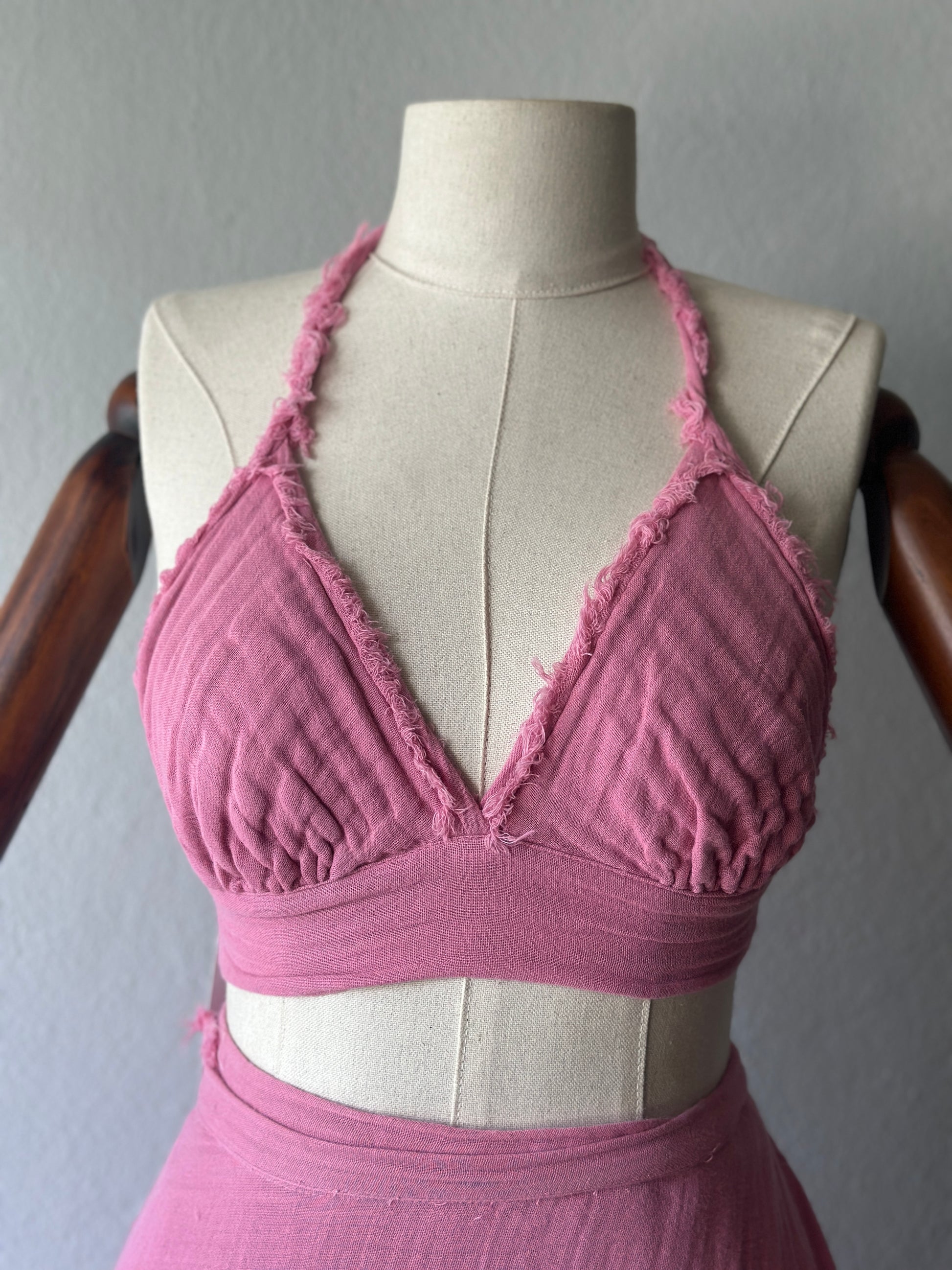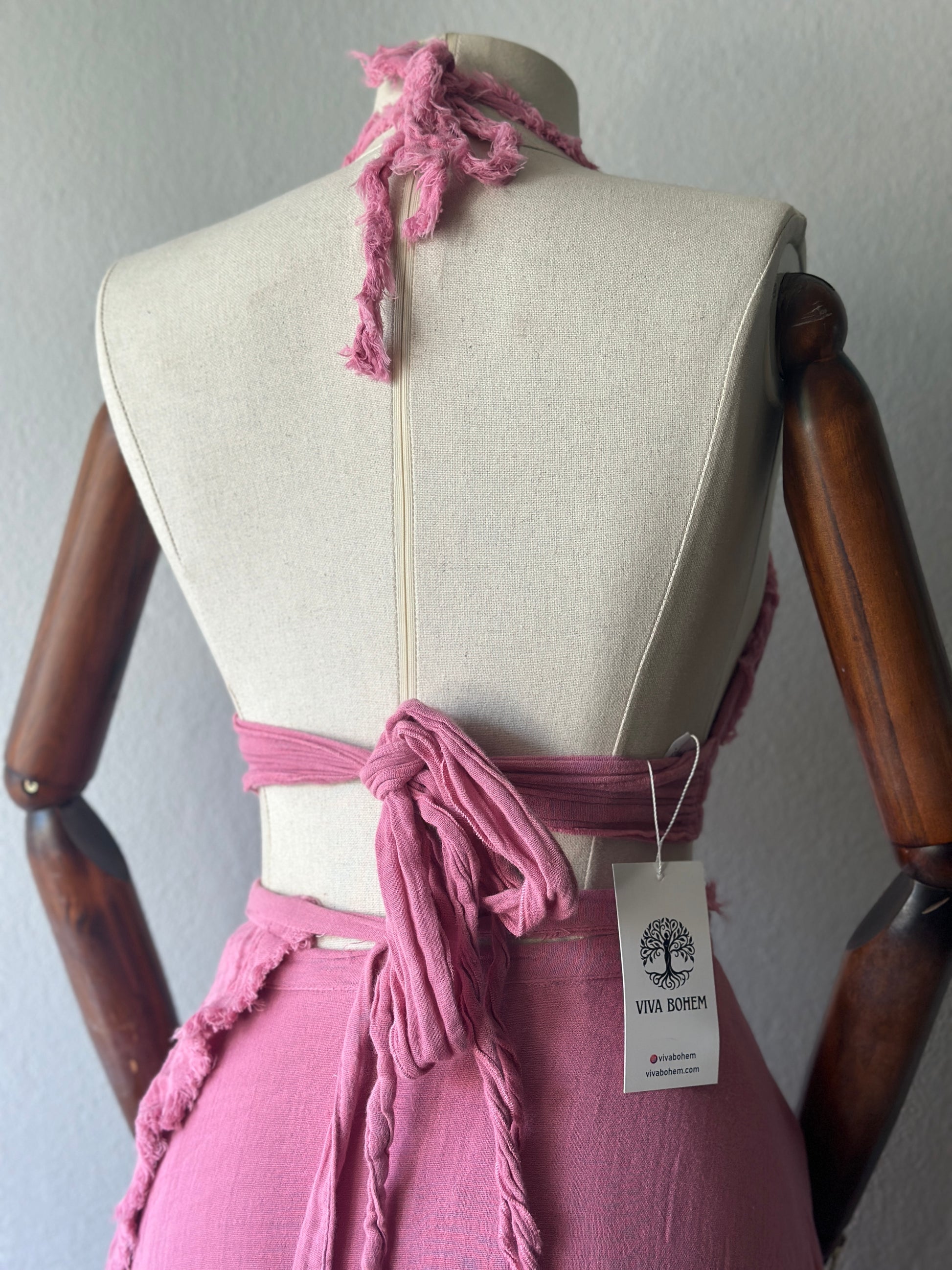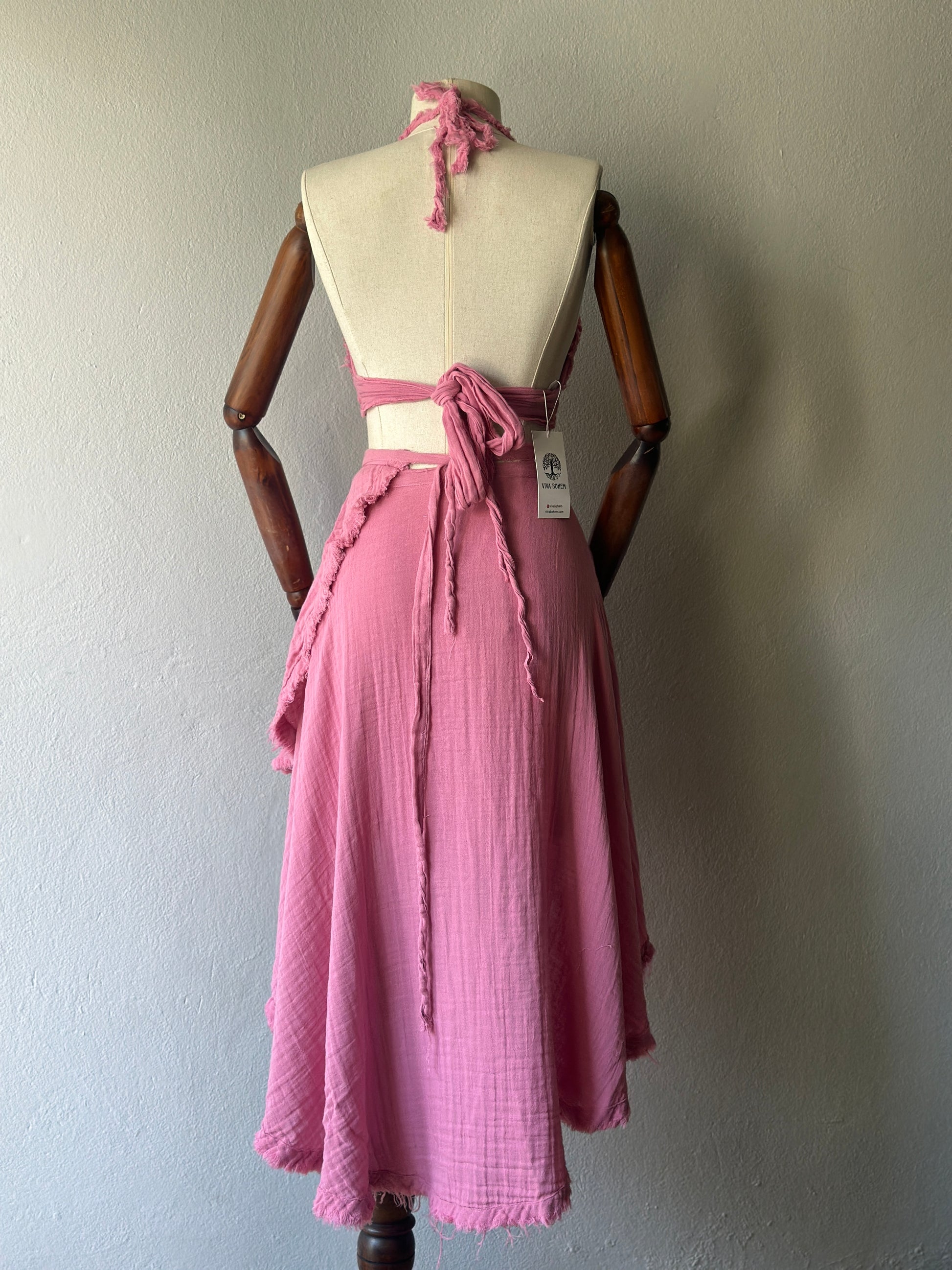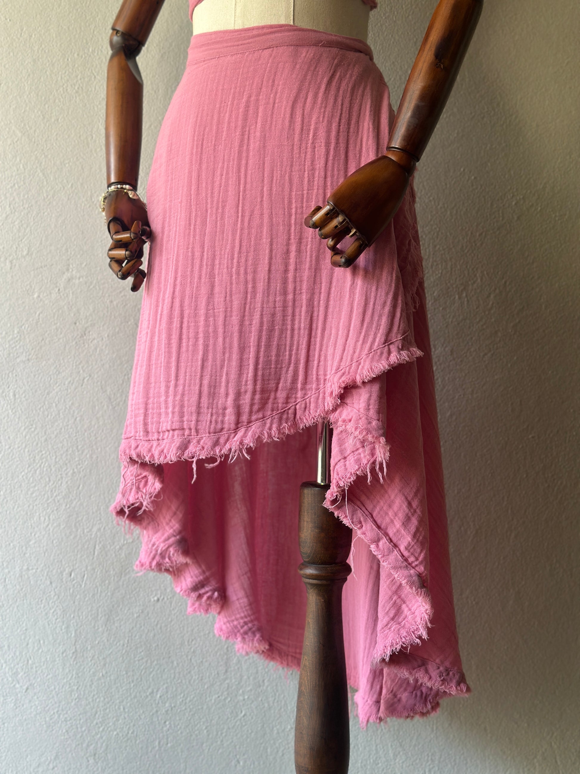 Pamuklu dokusu ve asimetrik etek kesimiyle dikkat çeken bu takım, hem şık hem de feminen bir duruş sunar.