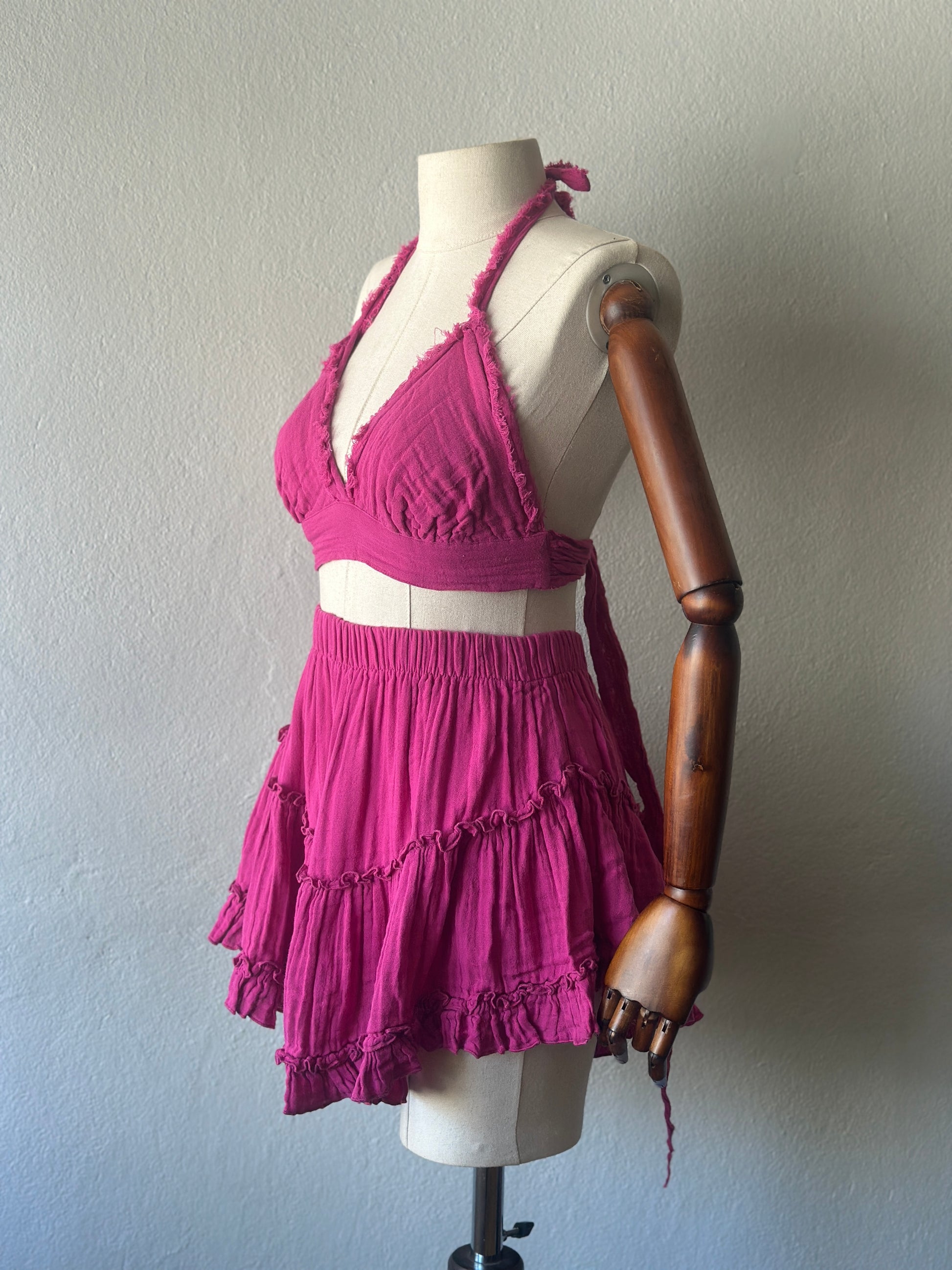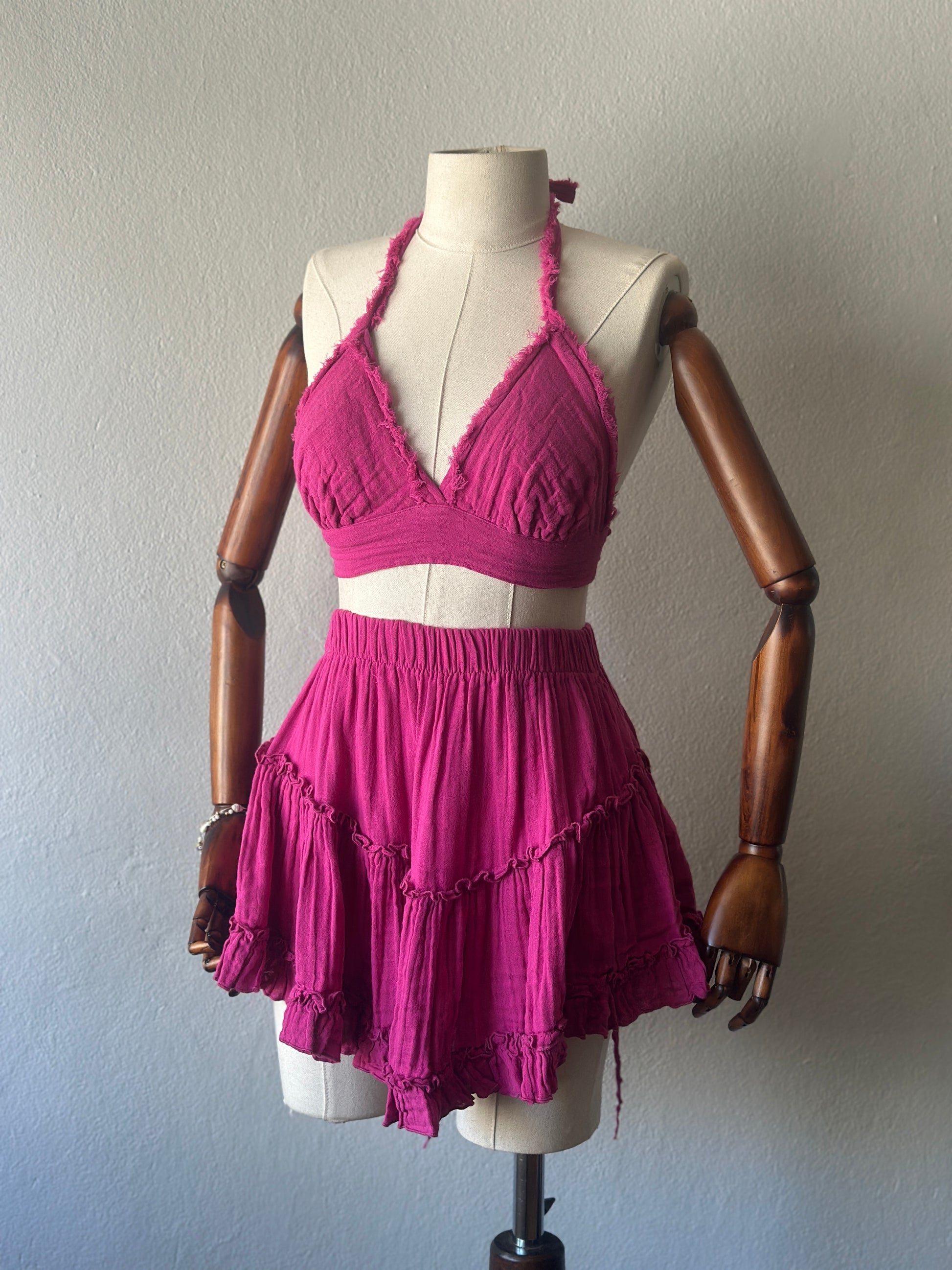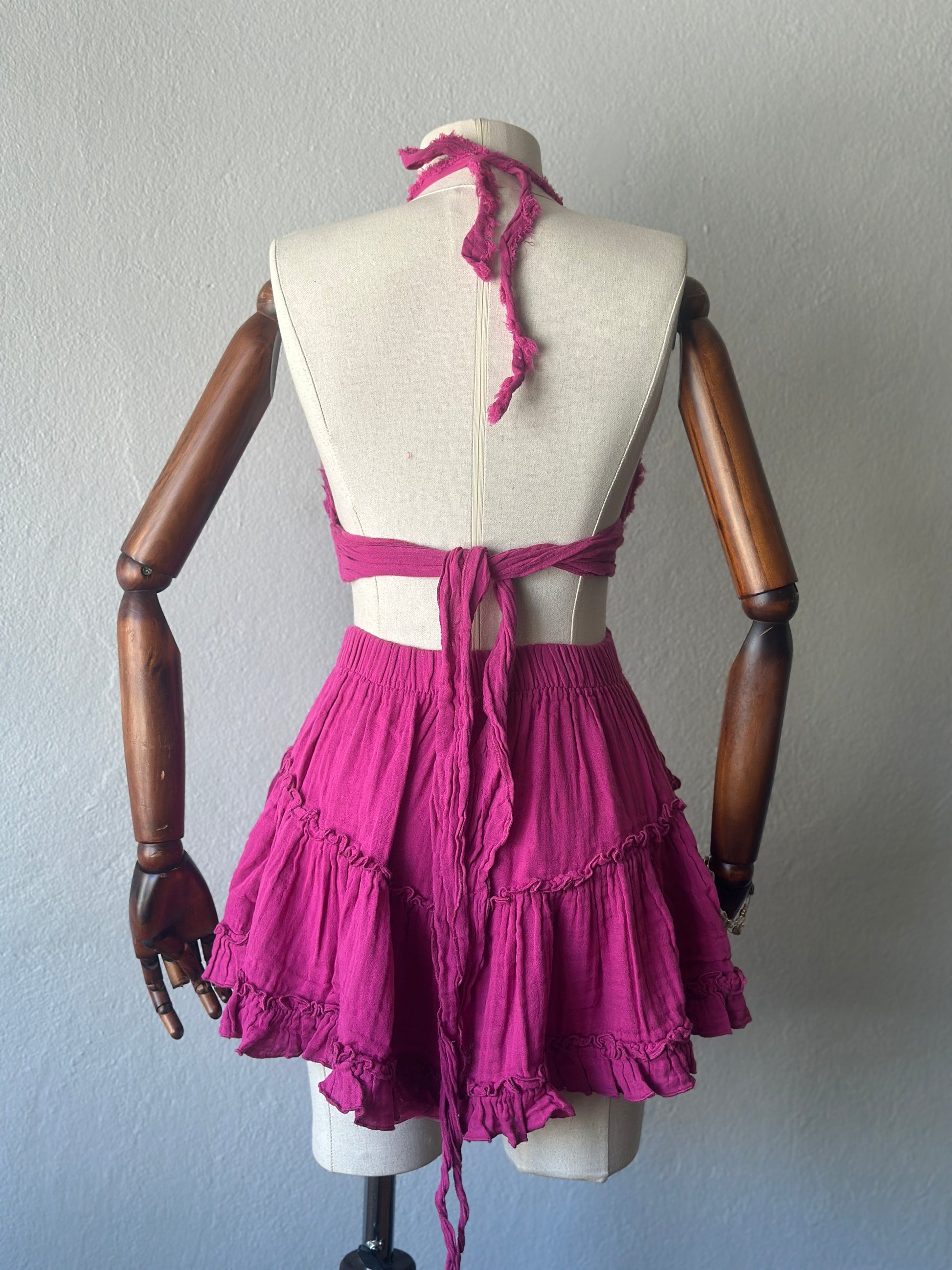 Organik pamuktan üretilmiş, yaz ayları için ideal nefes alan kumaş. Üçgen büstiyer boyundan bağlamalı ve arka kısmı bağcıklıdır. Etek volan detaylarıyla hareketli bir duruş sağlar.