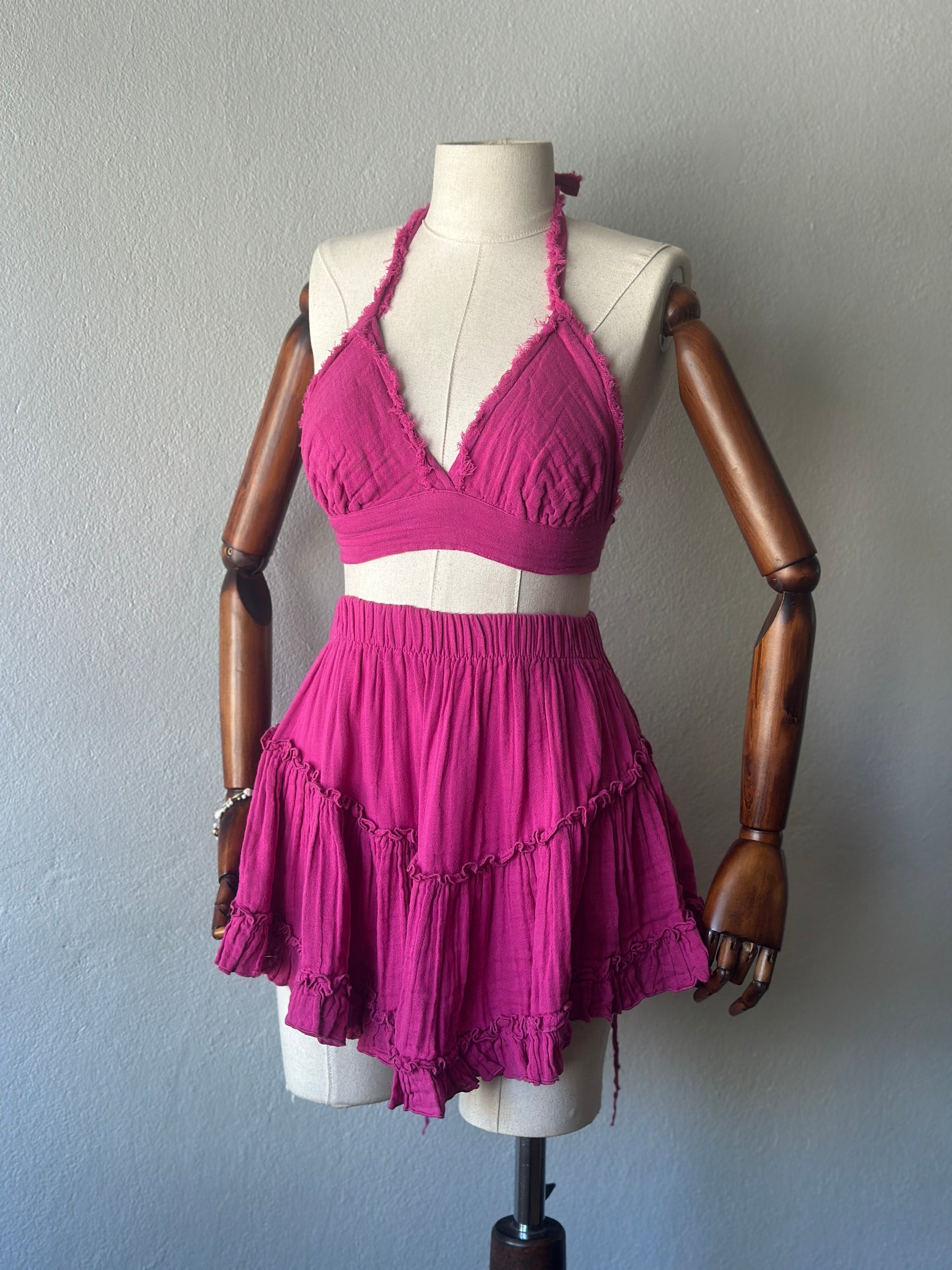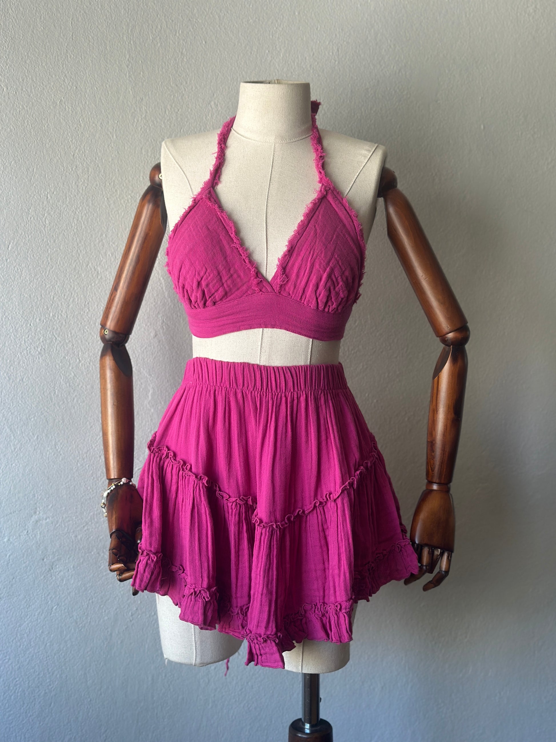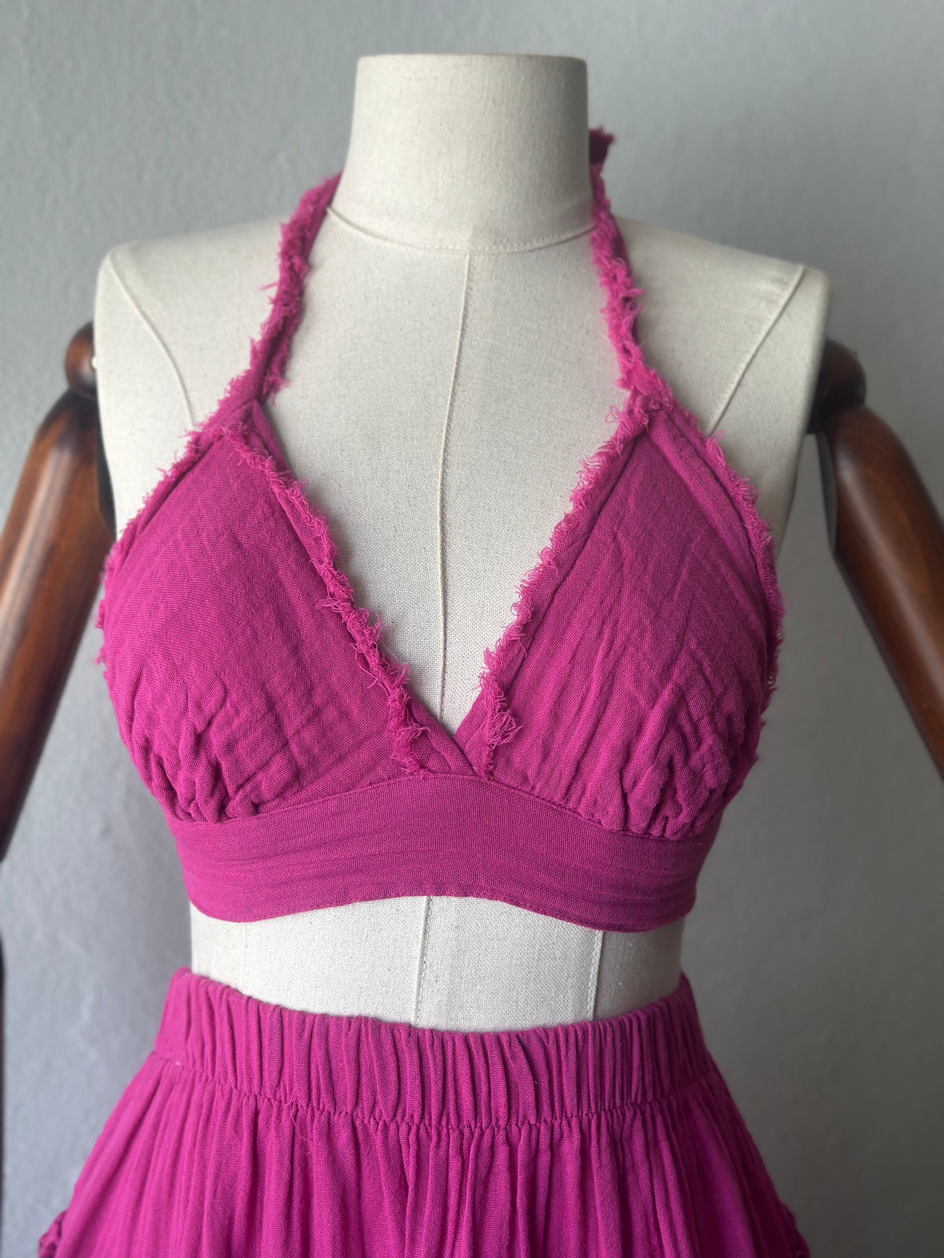 Organik pamuktan üretilmiş, yaz ayları için ideal nefes alan kumaş. Üçgen büstiyer boyundan bağlamalı ve arka kısmı bağcıklıdır. Etek volan detaylarıyla hareketli bir duruş sağlar.