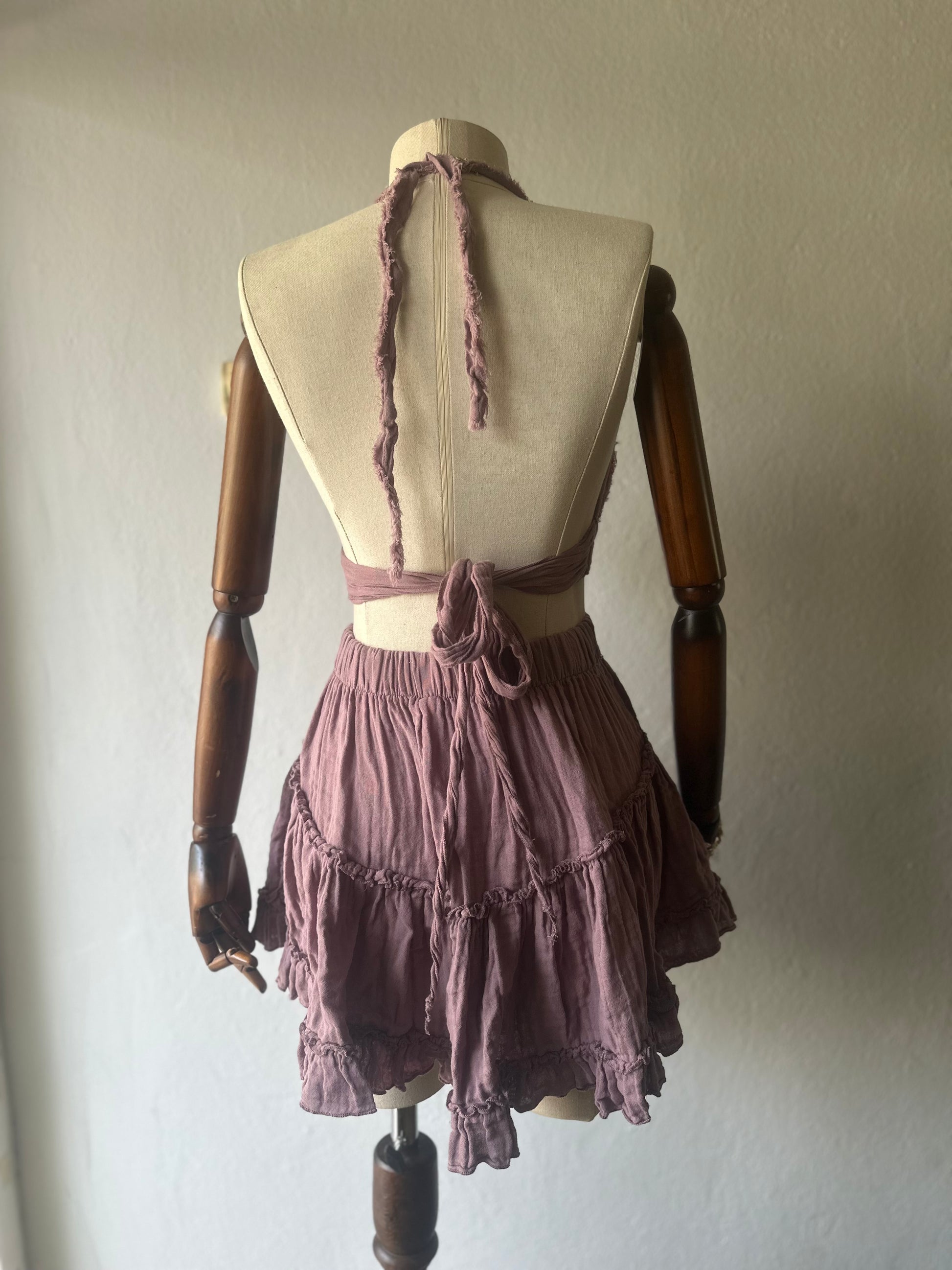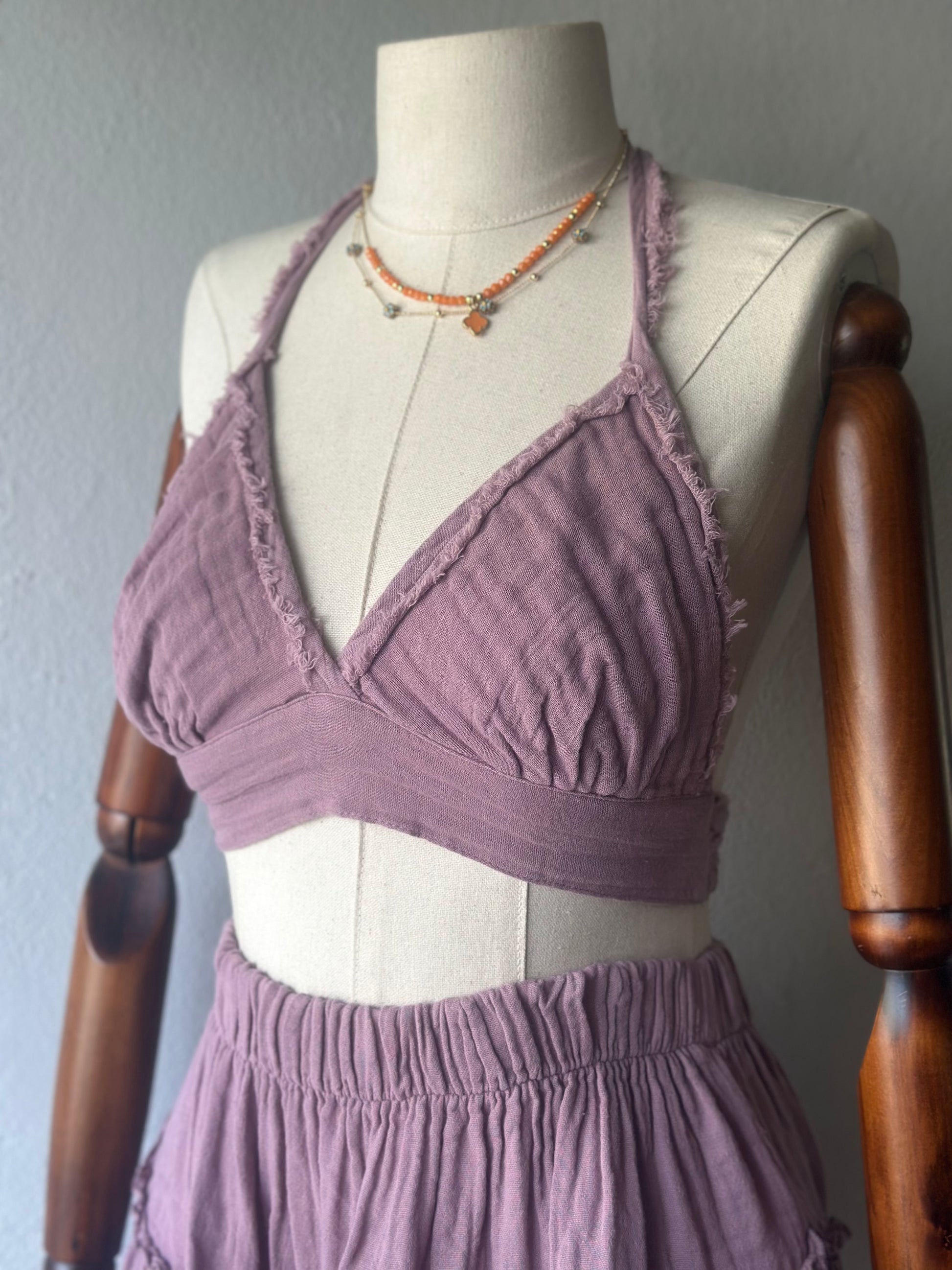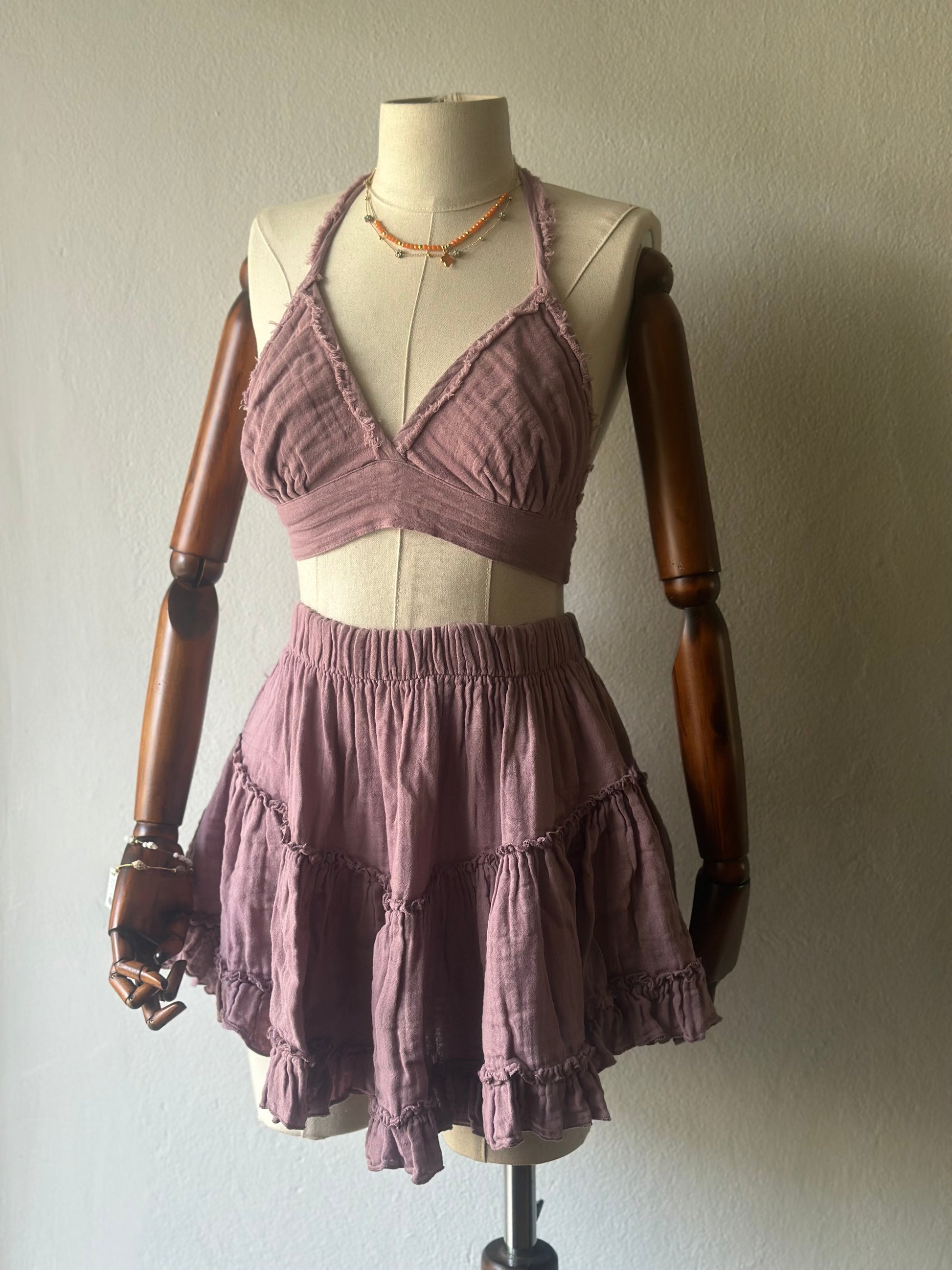 Organik pamuktan üretilmiş, yaz ayları için ideal nefes alan kumaş. Üçgen büstiyer boyundan bağlamalı ve arka kısmı bağcıklıdır. Etek volan detaylarıyla hareketli bir duruş sağlar.