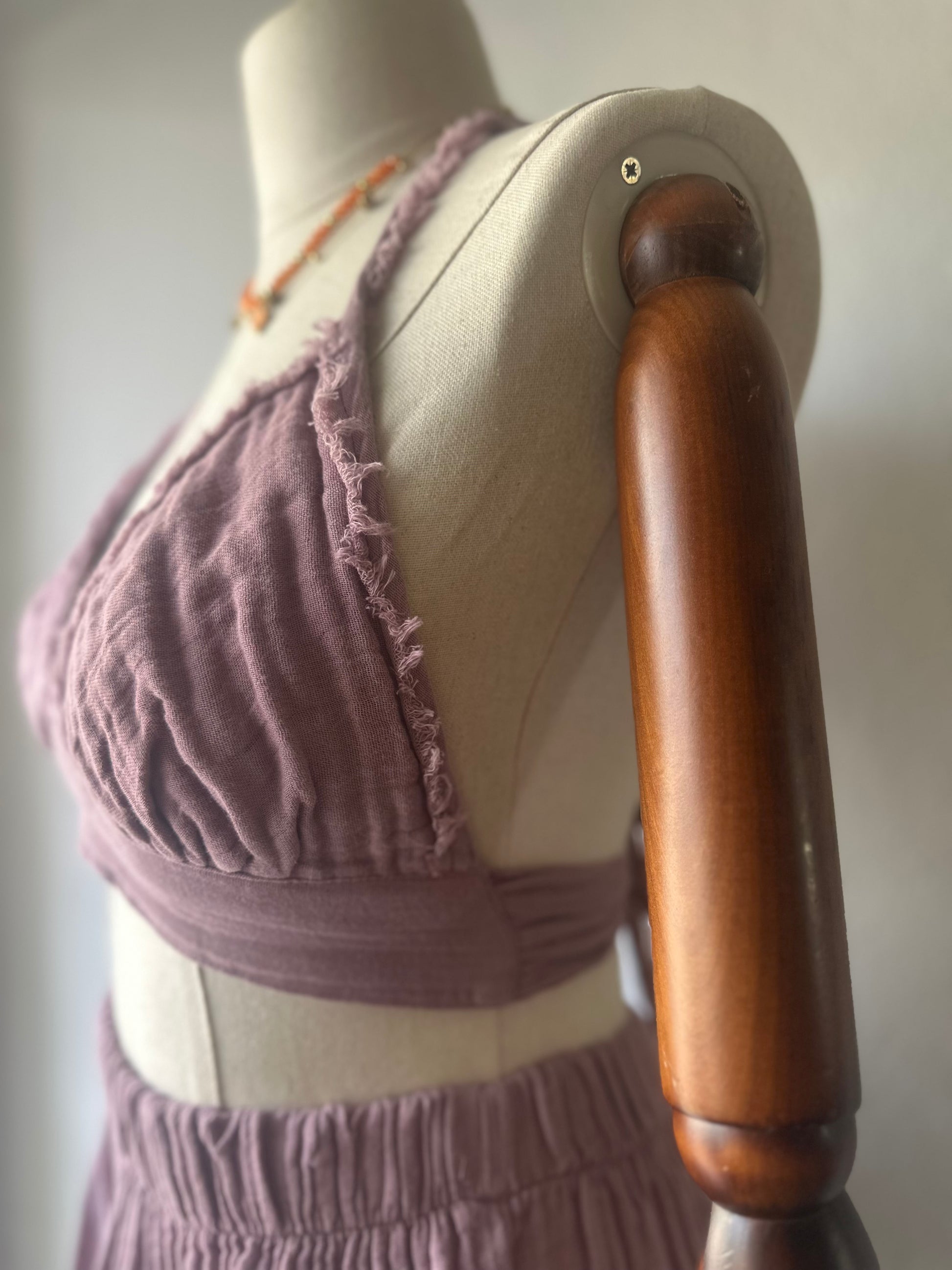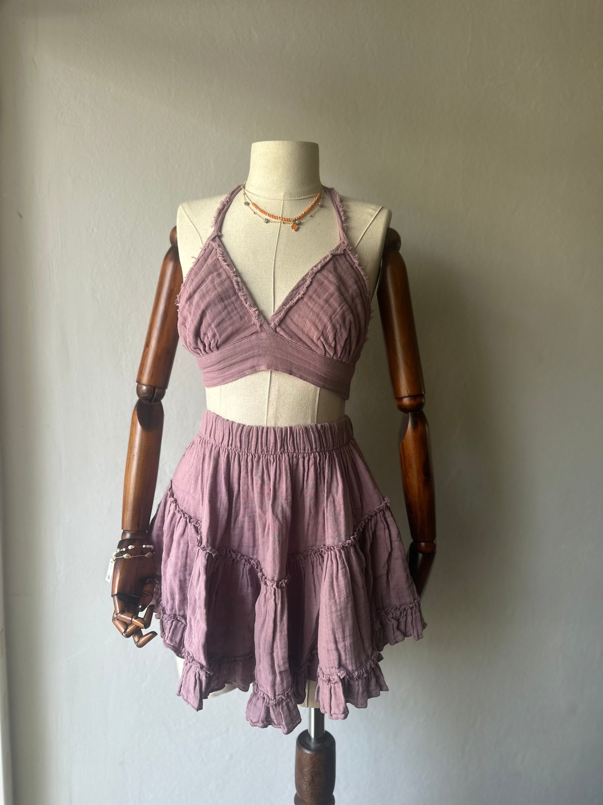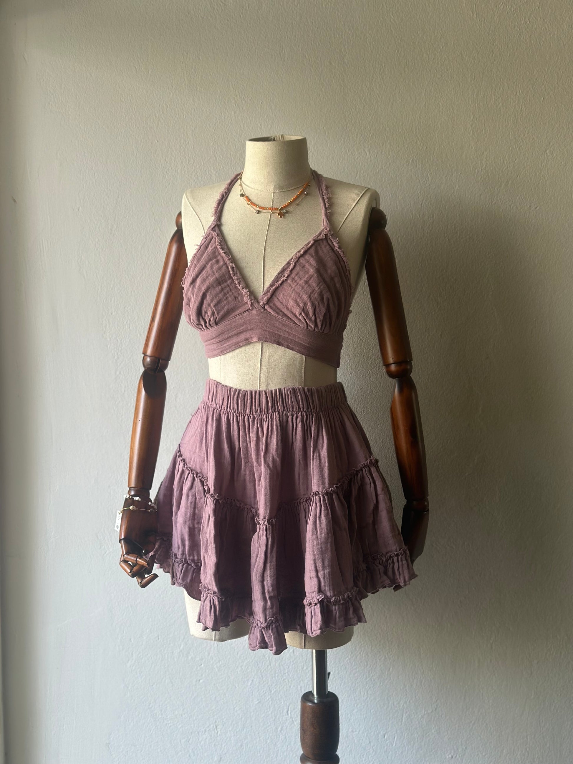 Organik pamuktan üretilmiş, yaz ayları için ideal nefes alan kumaş. Üçgen büstiyer boyundan bağlamalı ve arka kısmı bağcıklıdır. Etek volan detaylarıyla hareketli bir duruş sağlar.