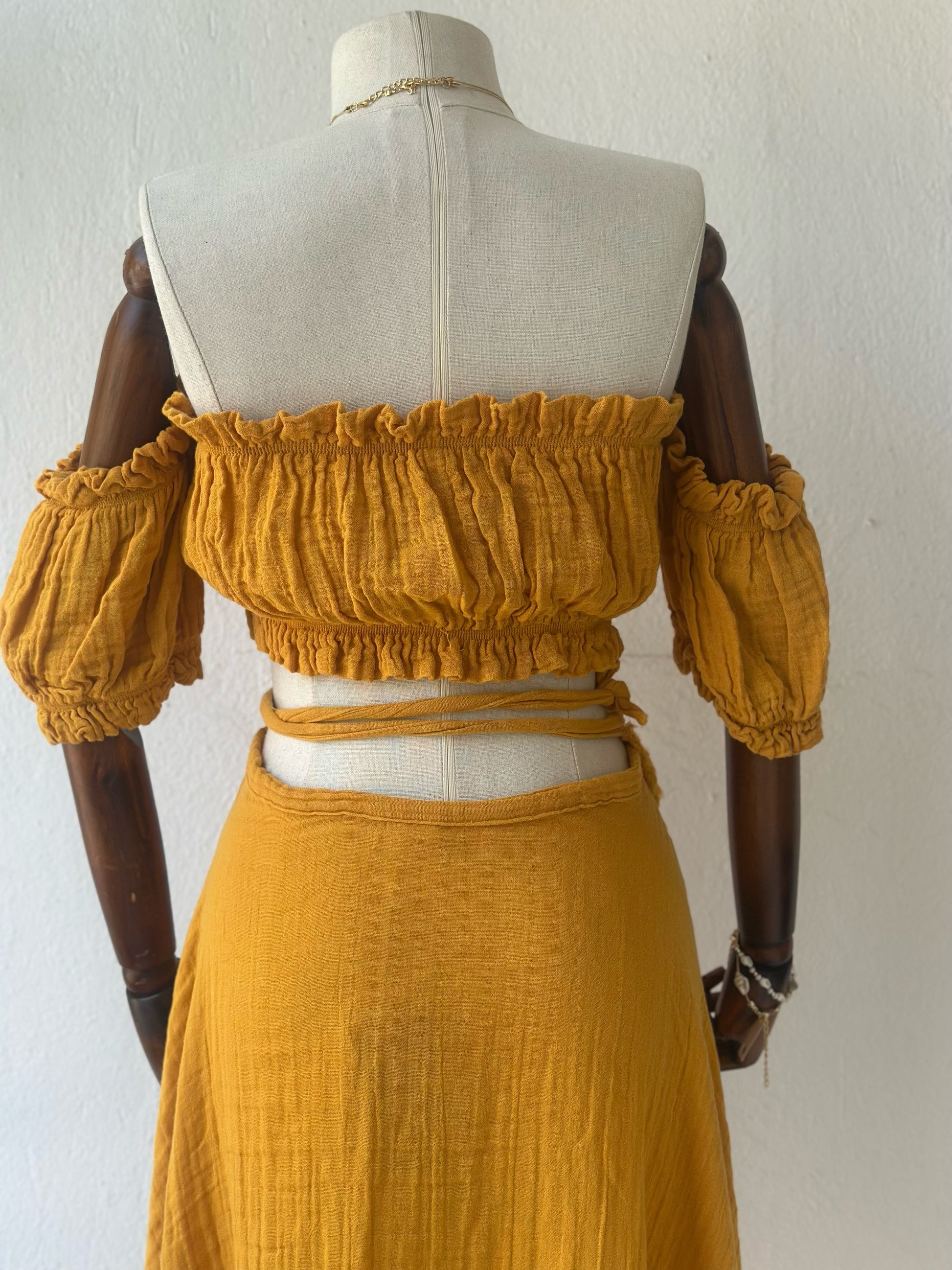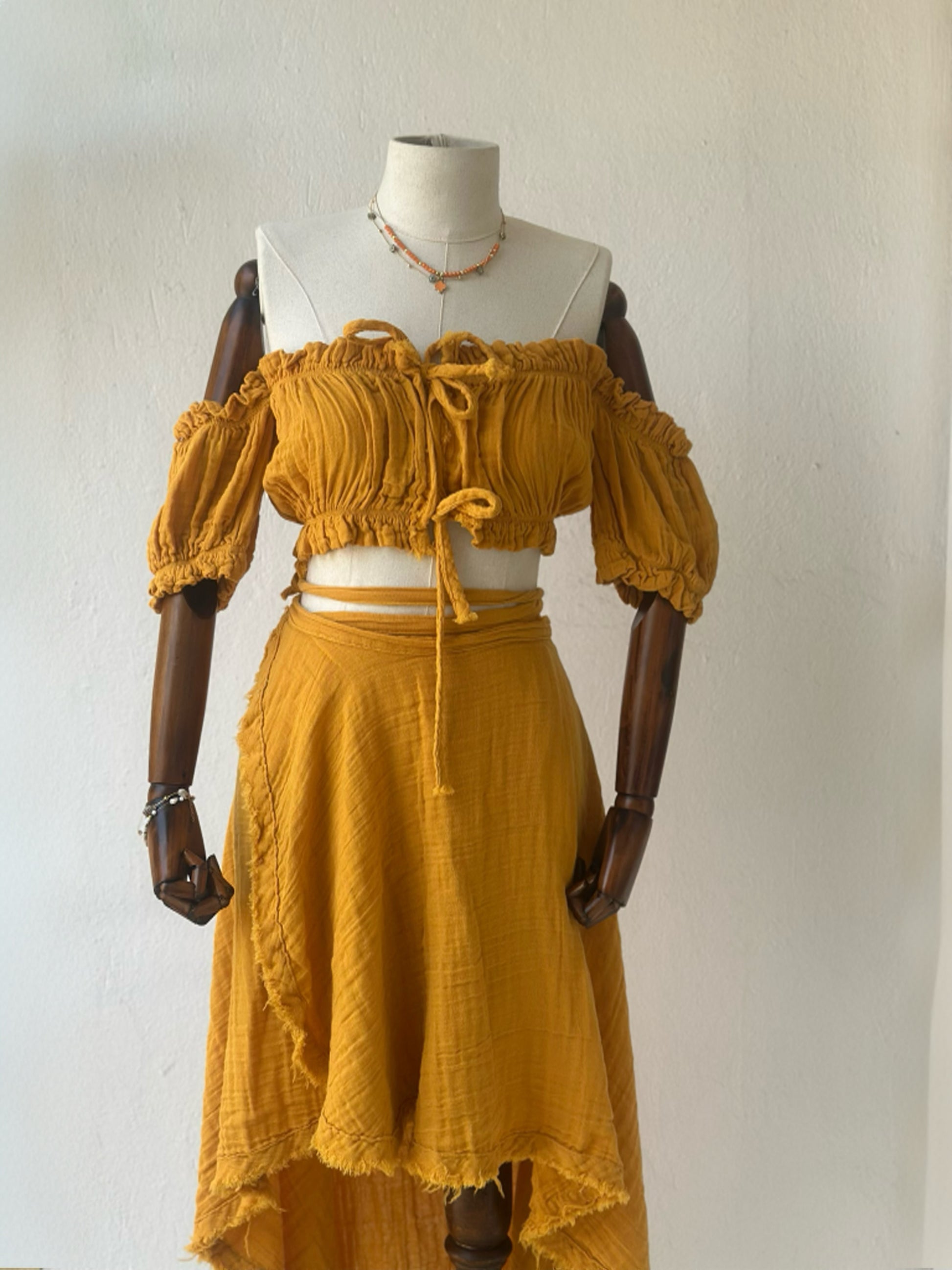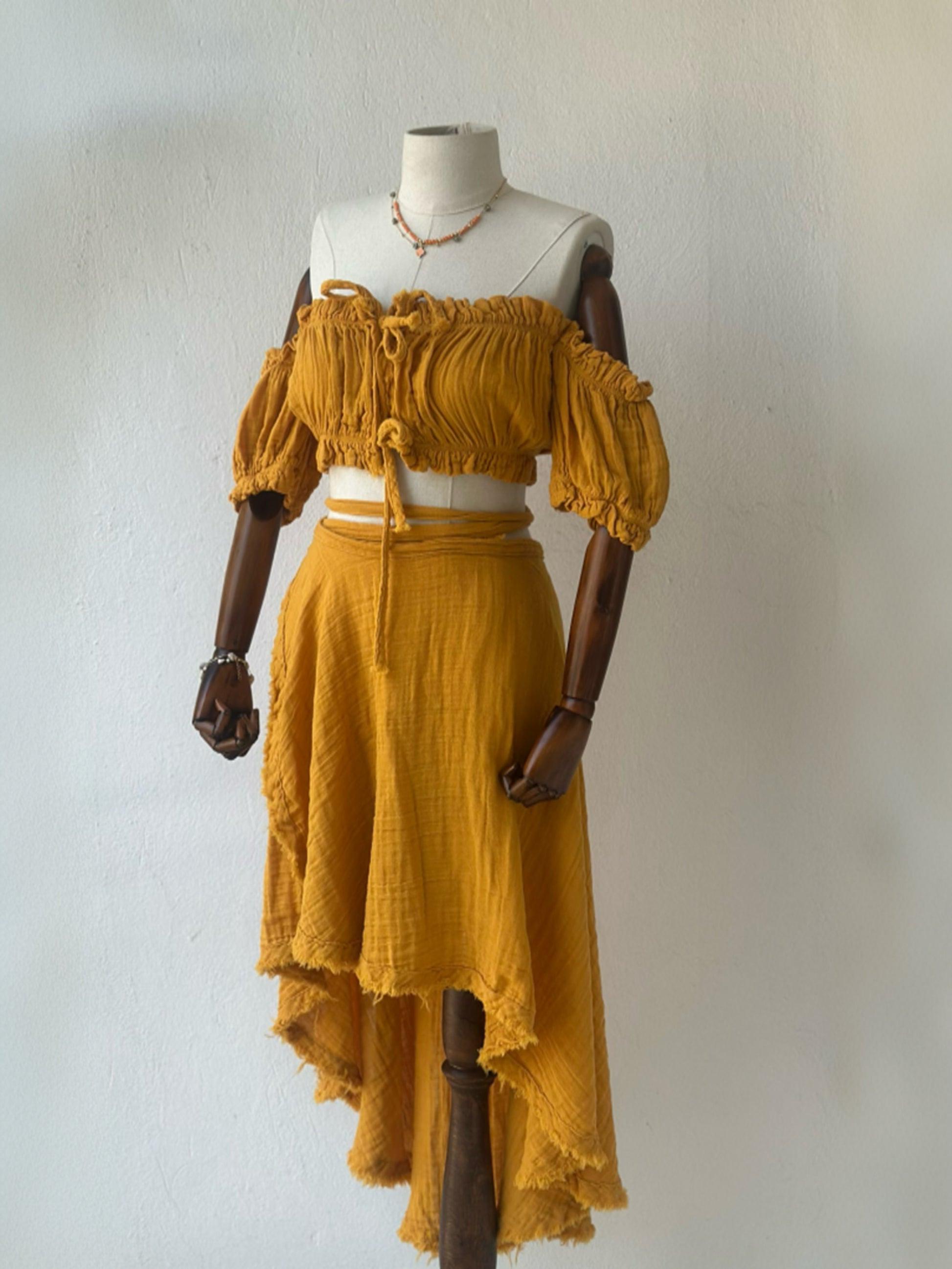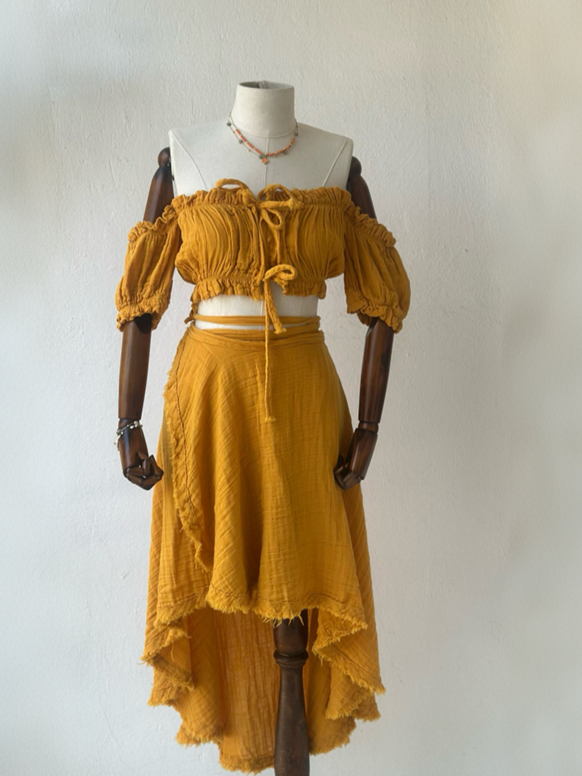 • Parçalar: Mini lastikli bluz + pareo etek (ön kısa – arka uzun)