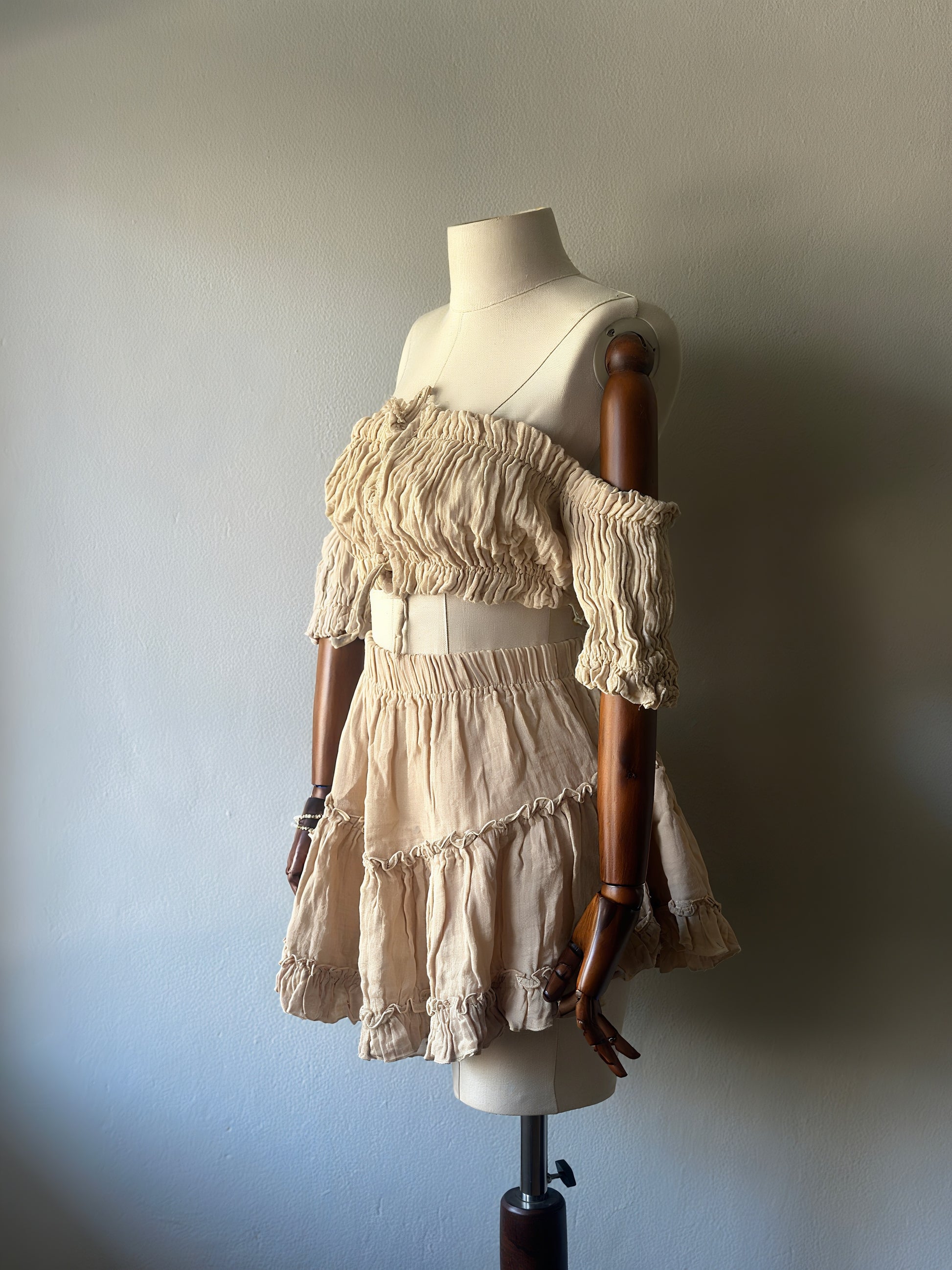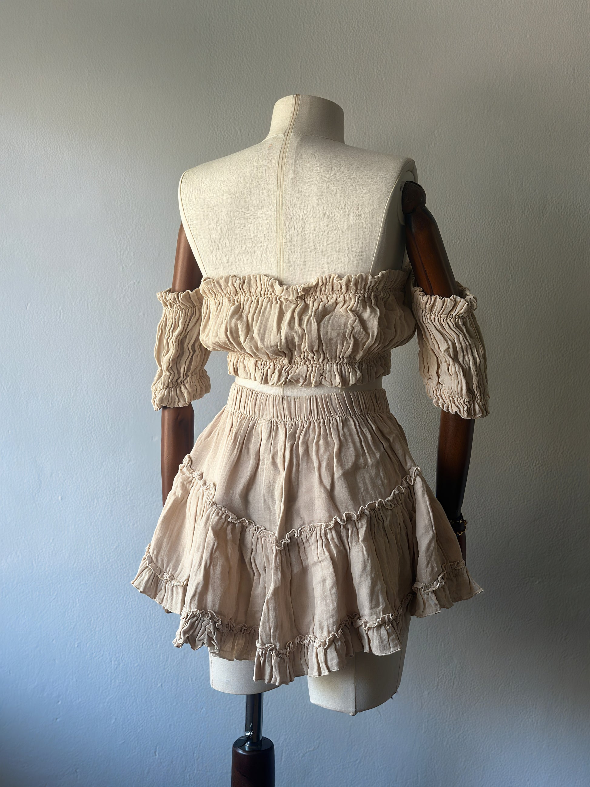 Volan detaylı, omzu açık lastikli bluz ve yüksek bel mini etek.
