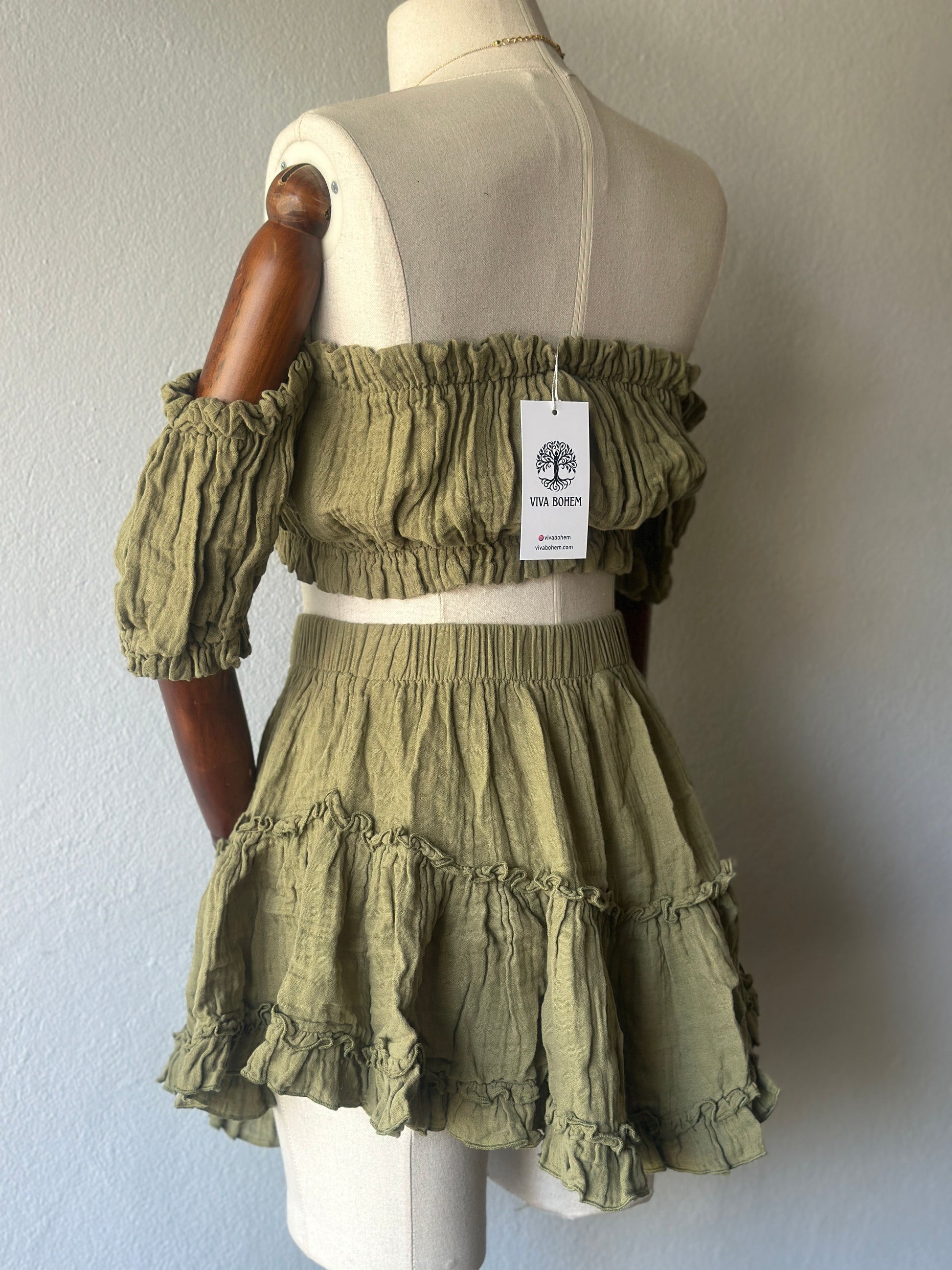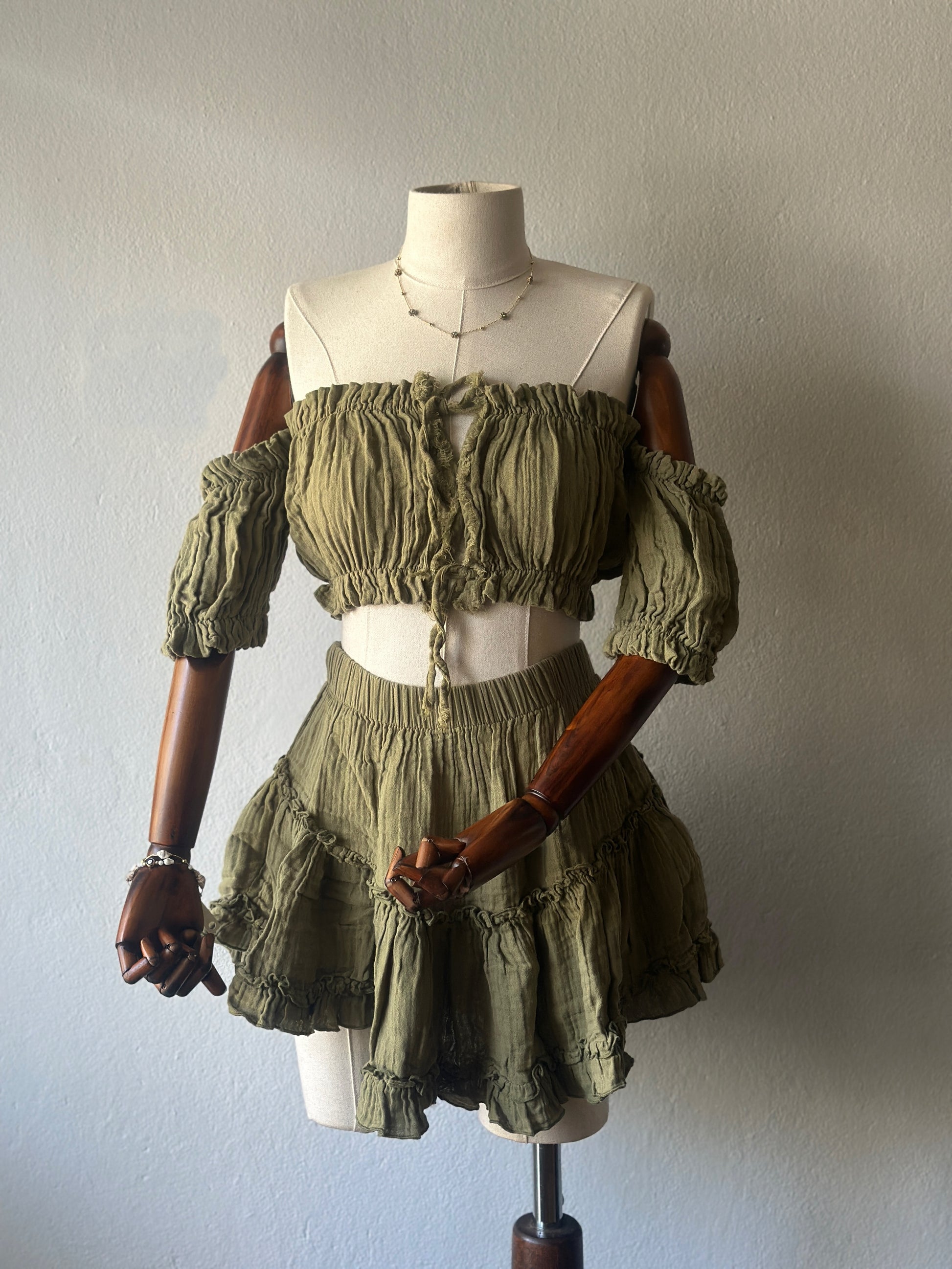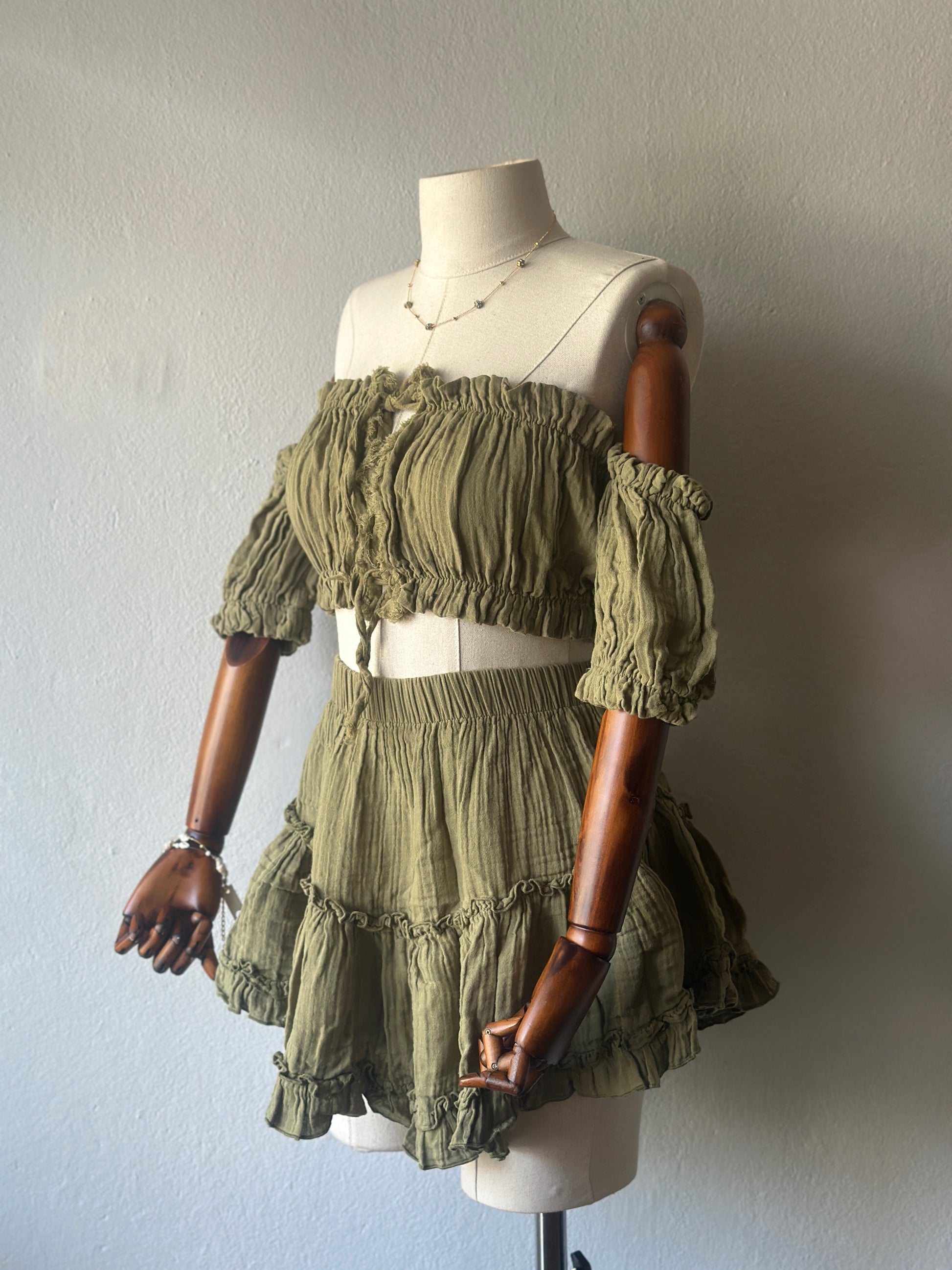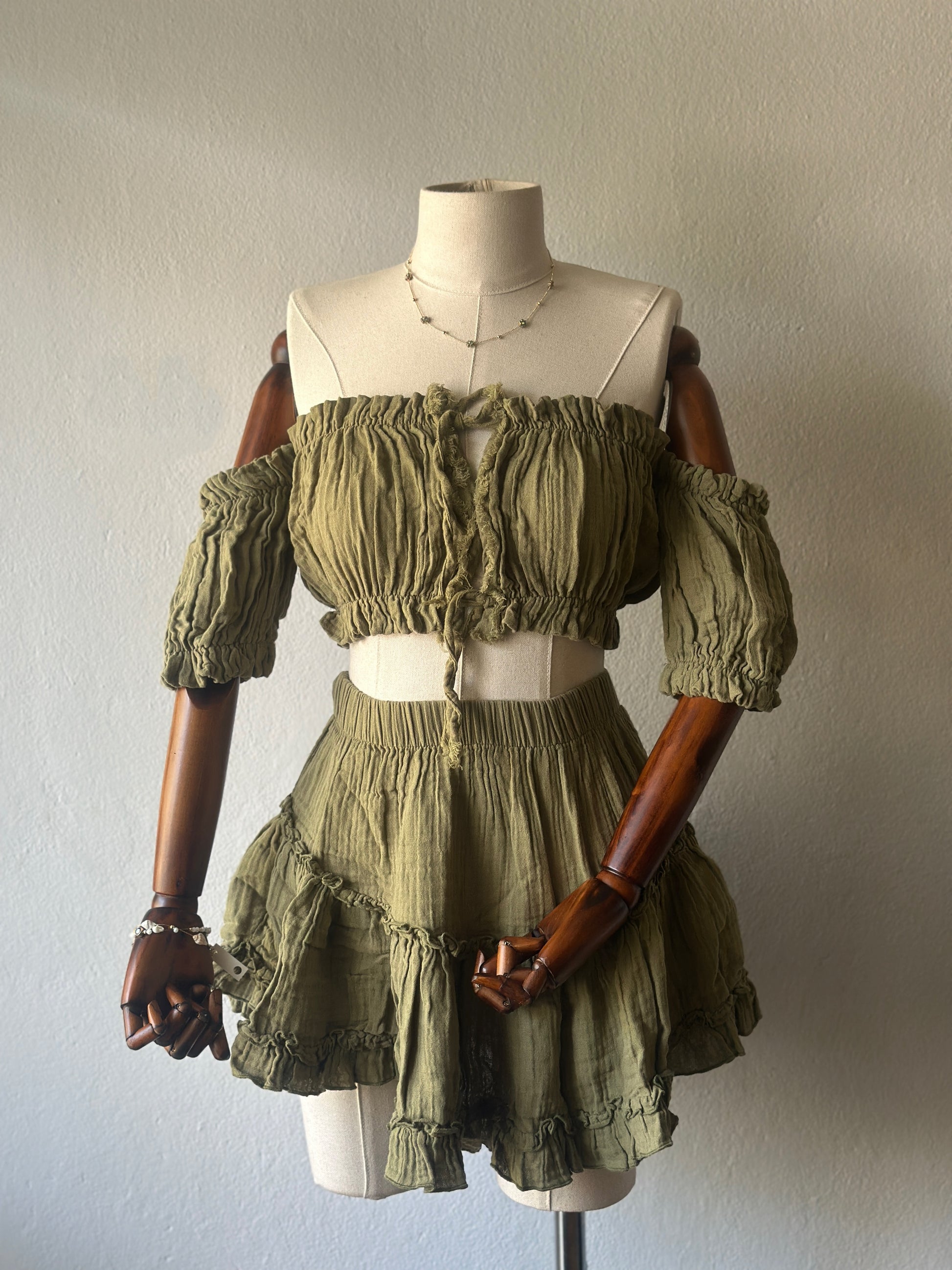 Volan detaylı, omzu açık lastikli bluz ve yüksek bel mini etek.