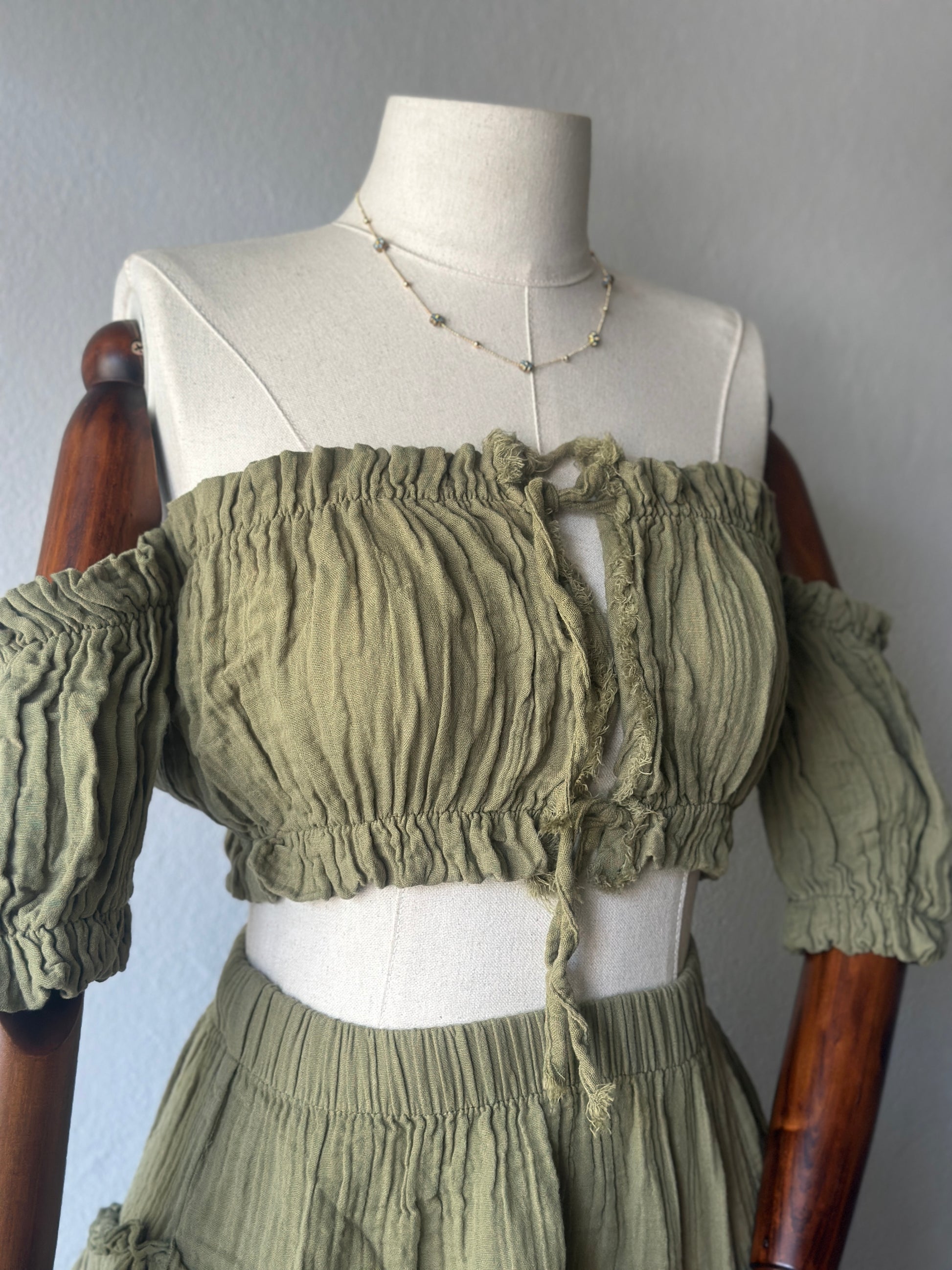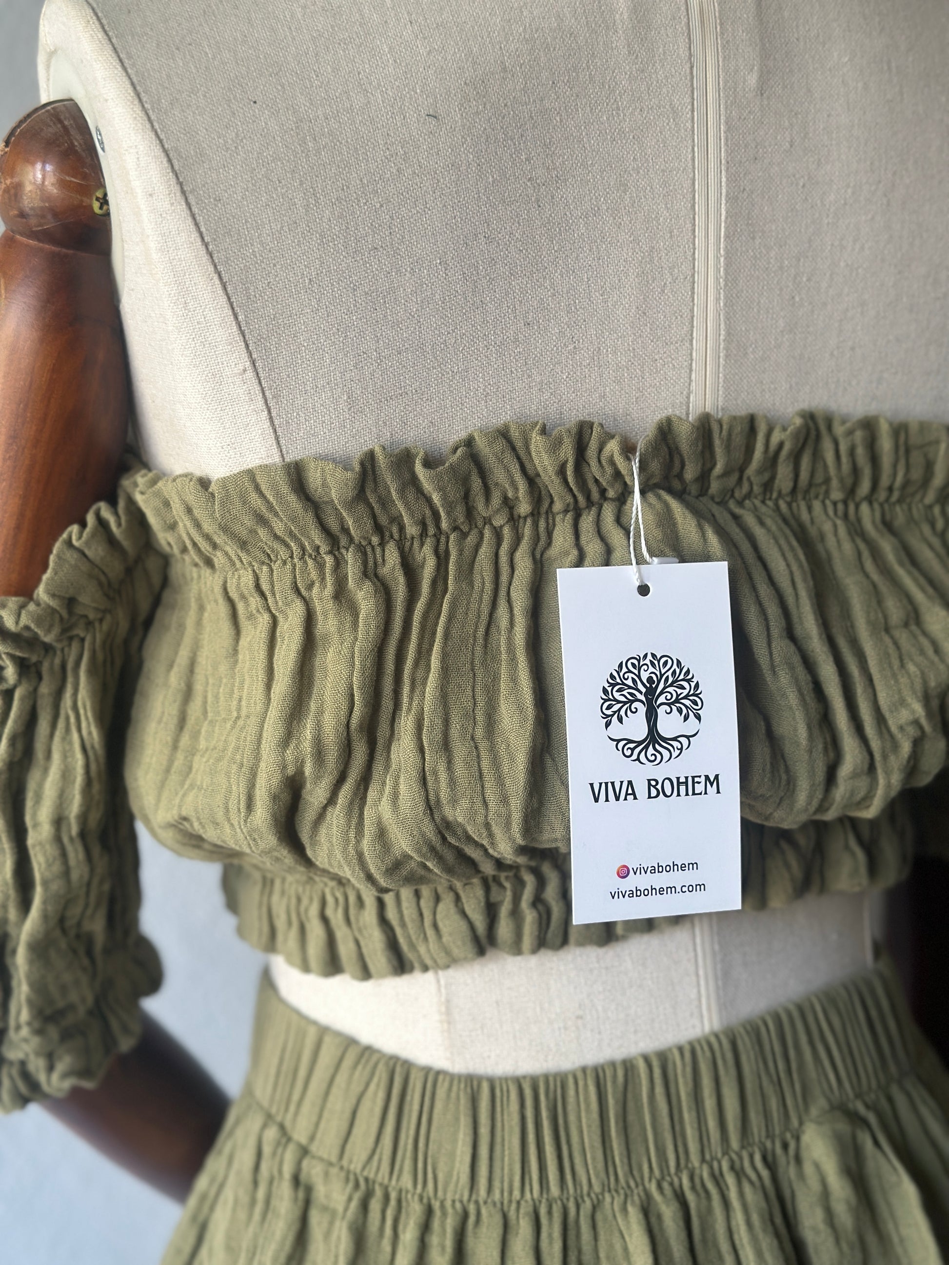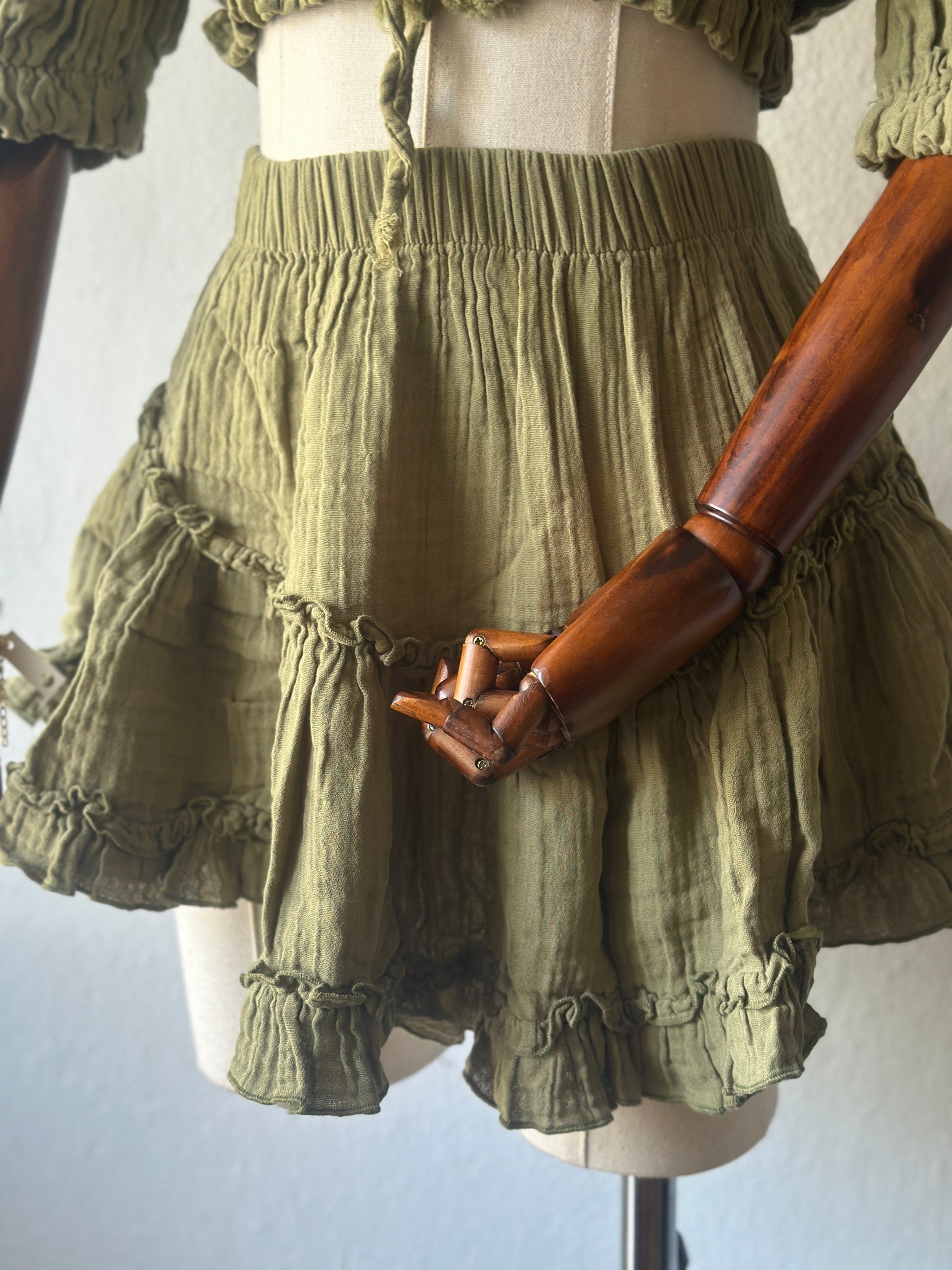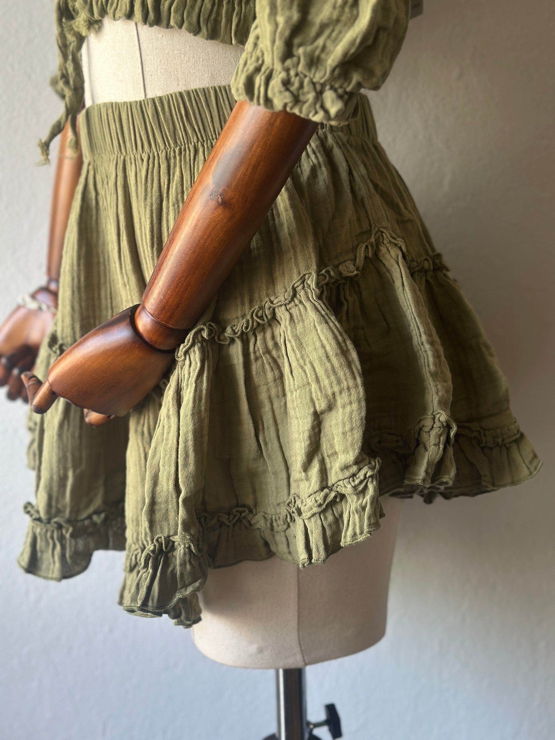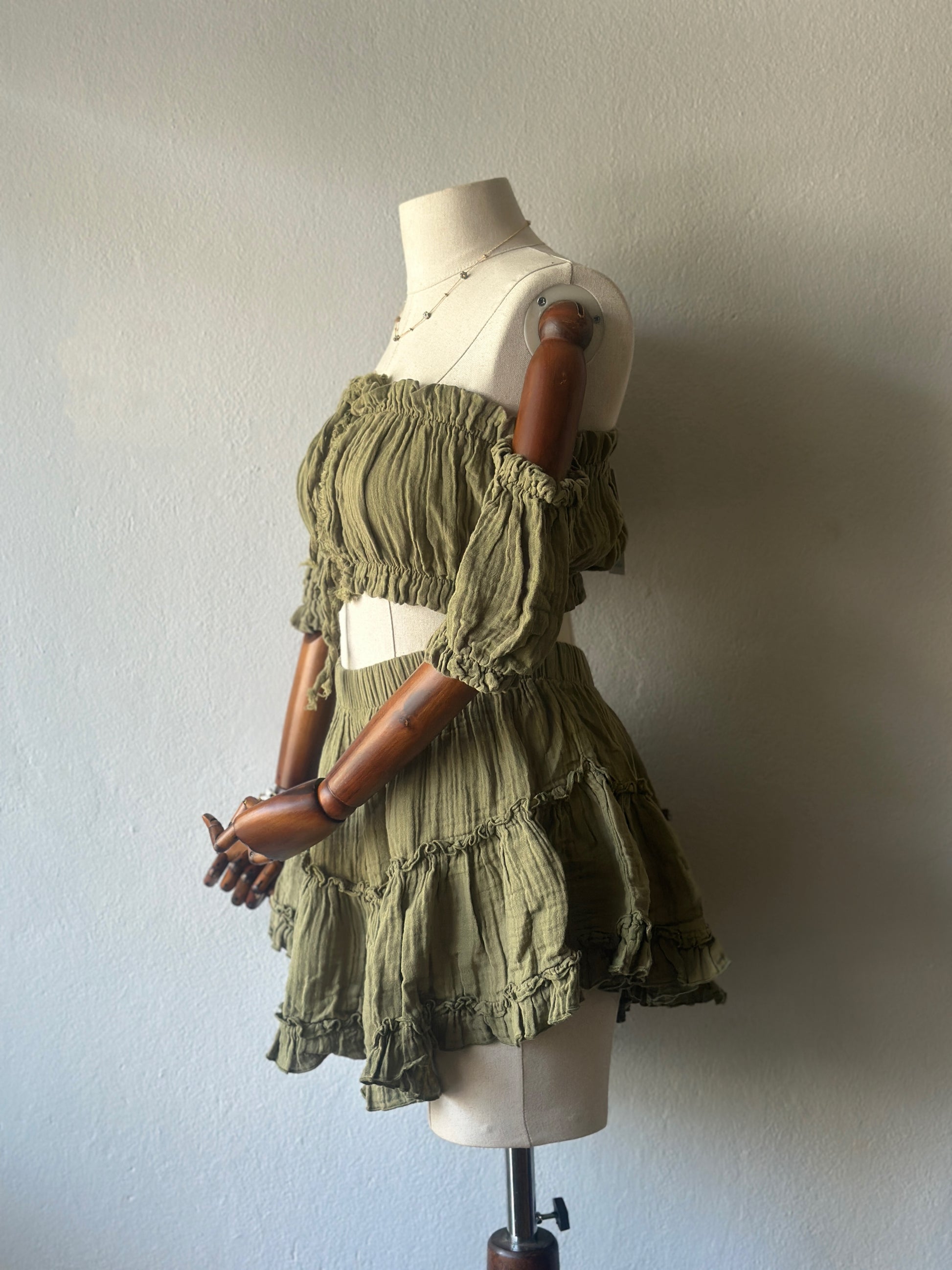 Volan detaylı, omzu açık lastikli bluz ve yüksek bel mini etek.