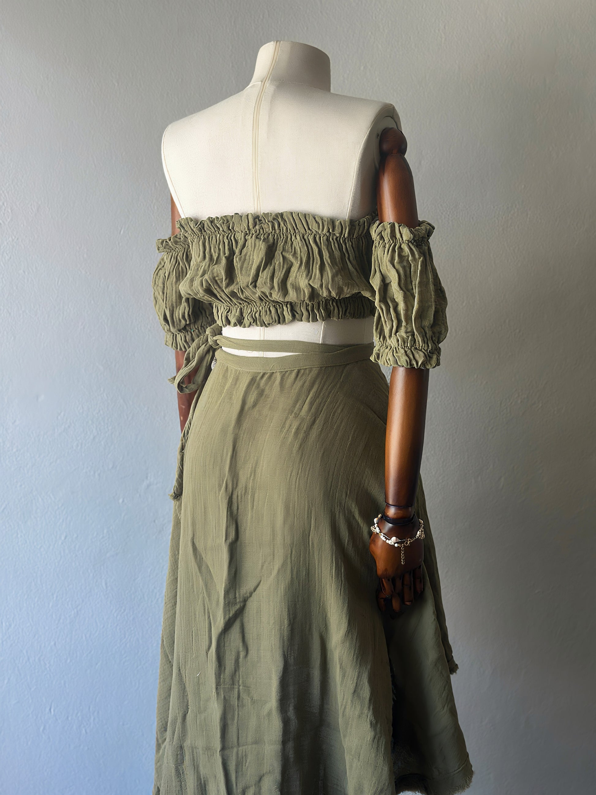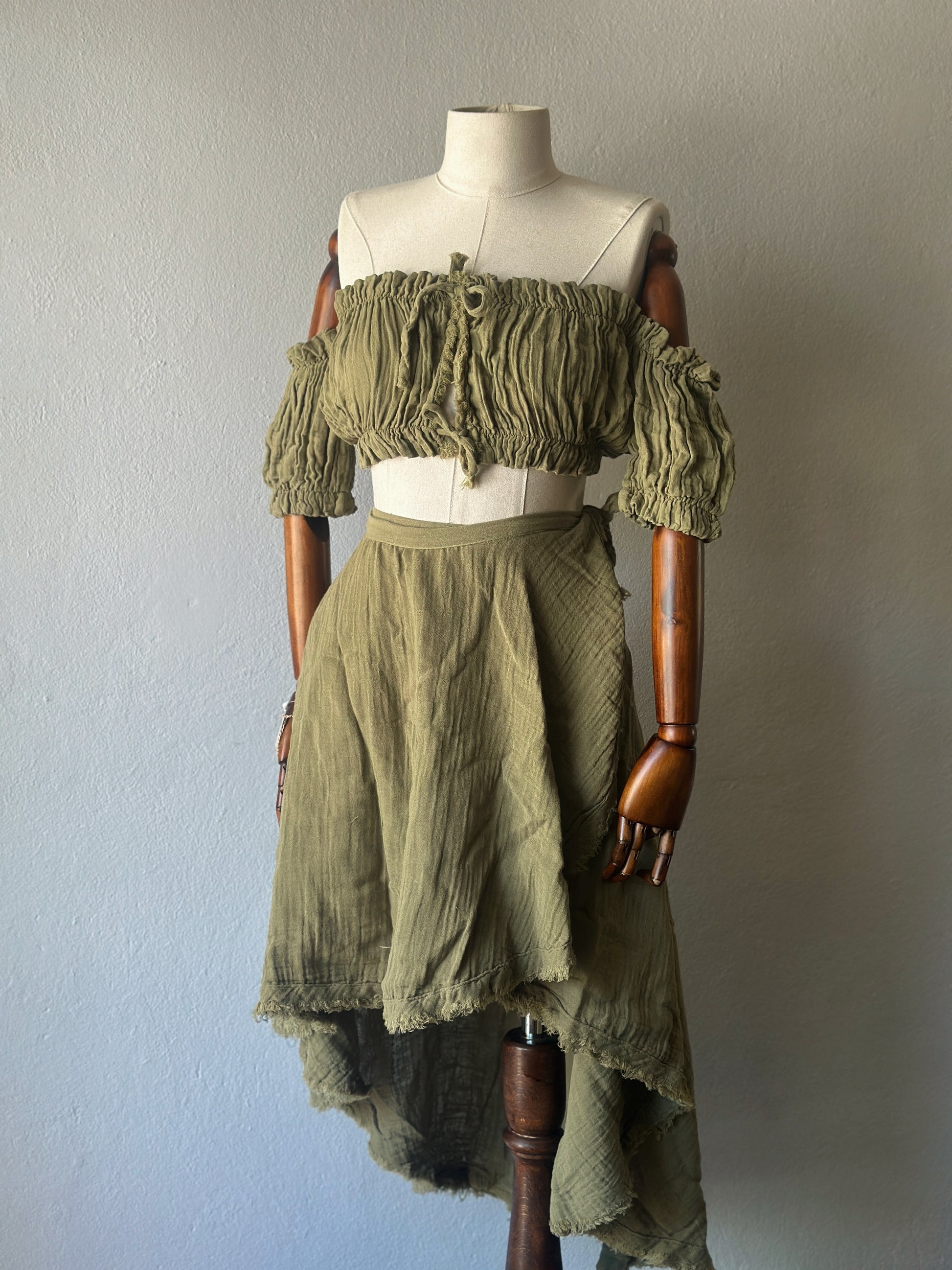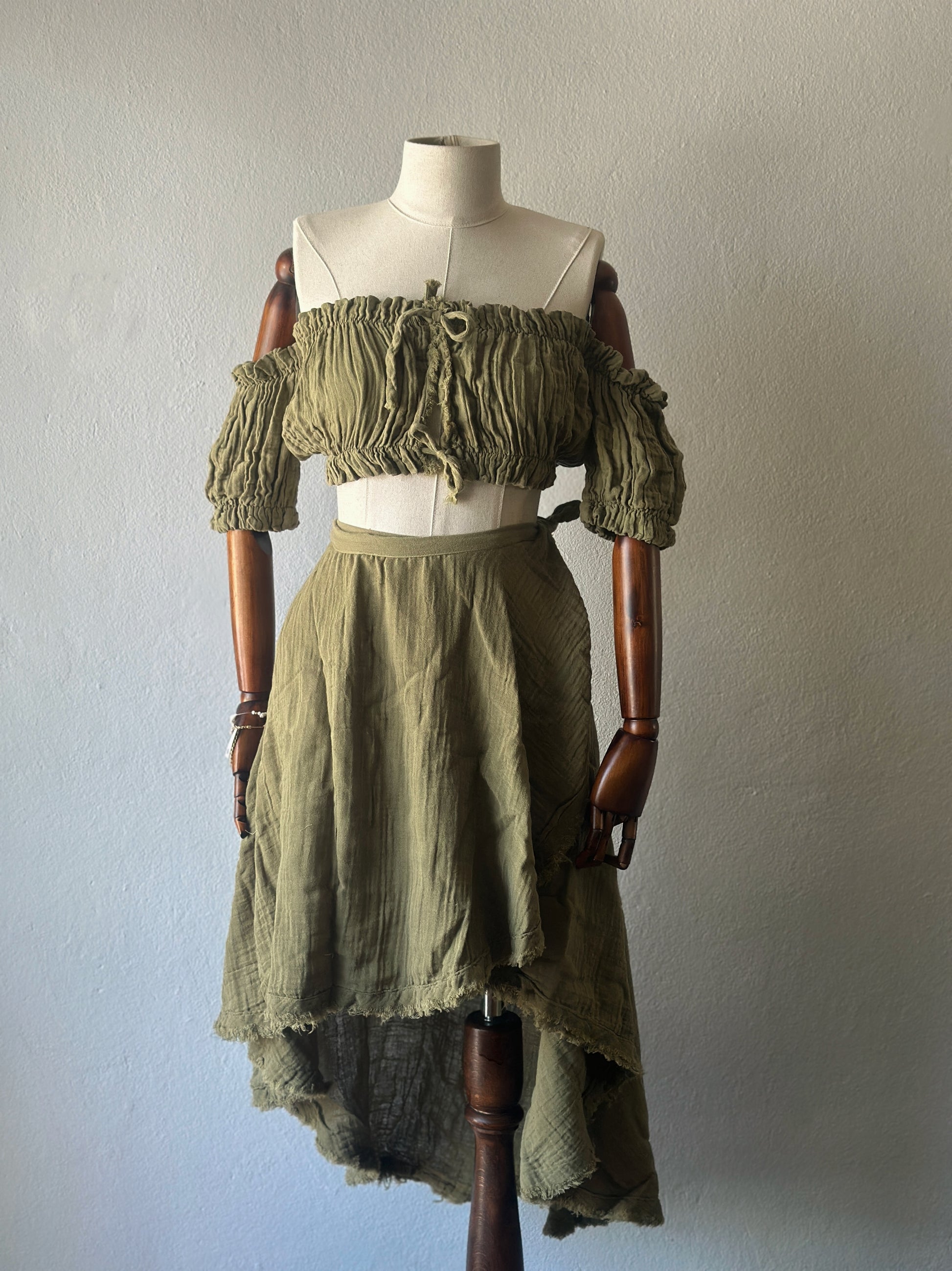 • Parçalar: Mini lastikli bluz + pareo etek (ön kısa – arka uzun)