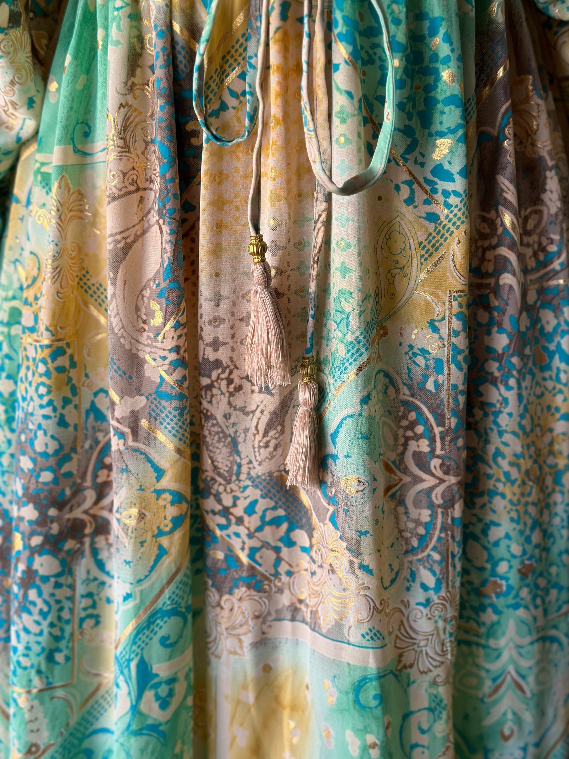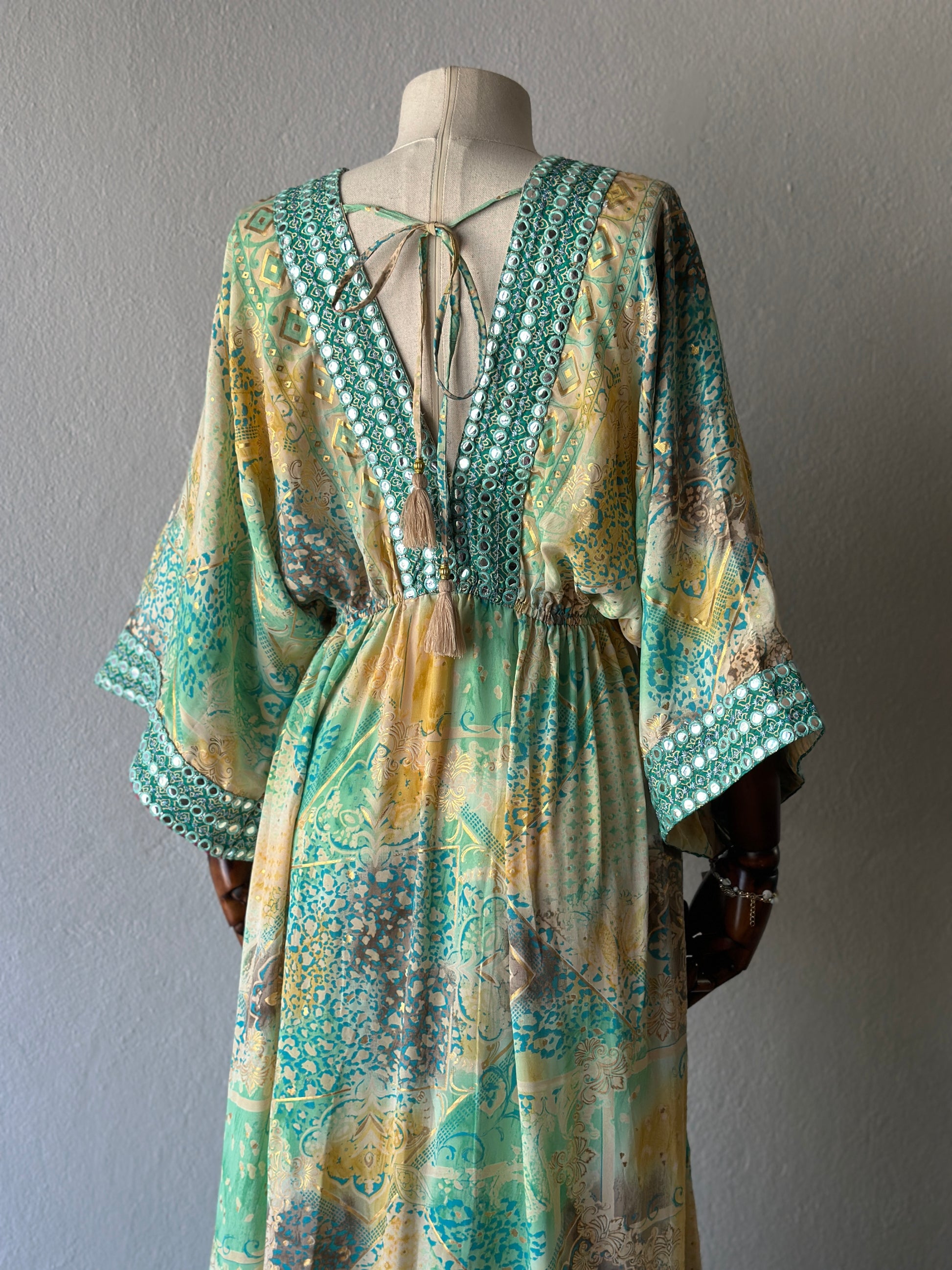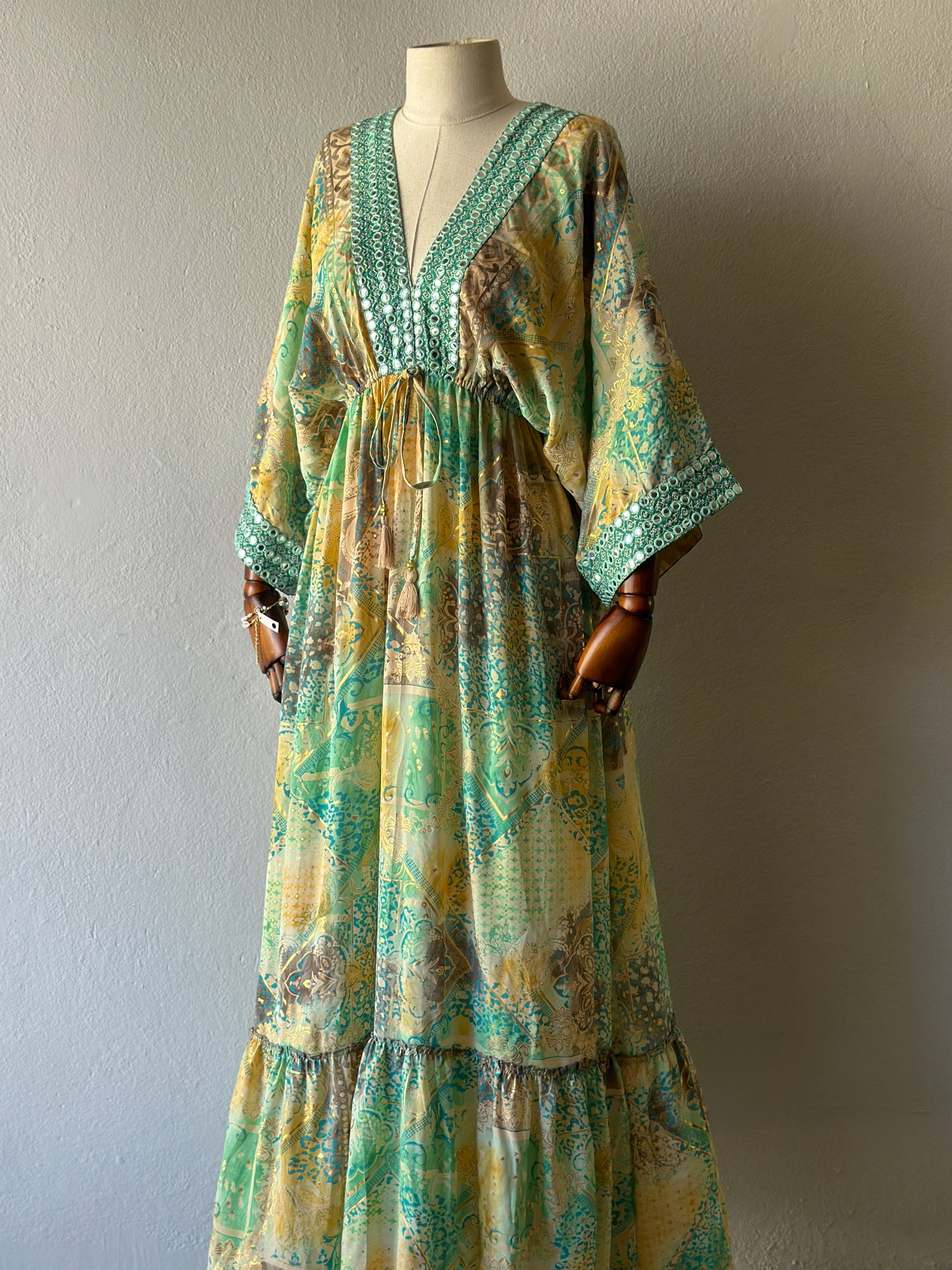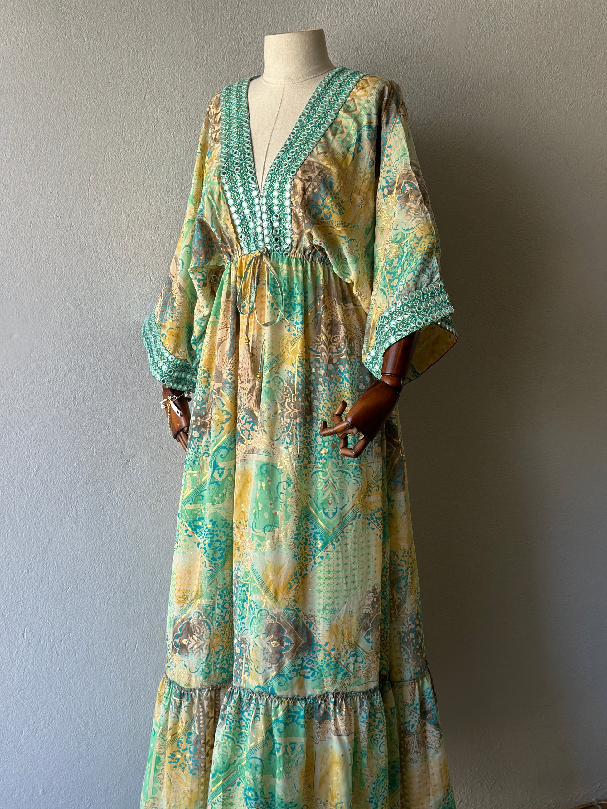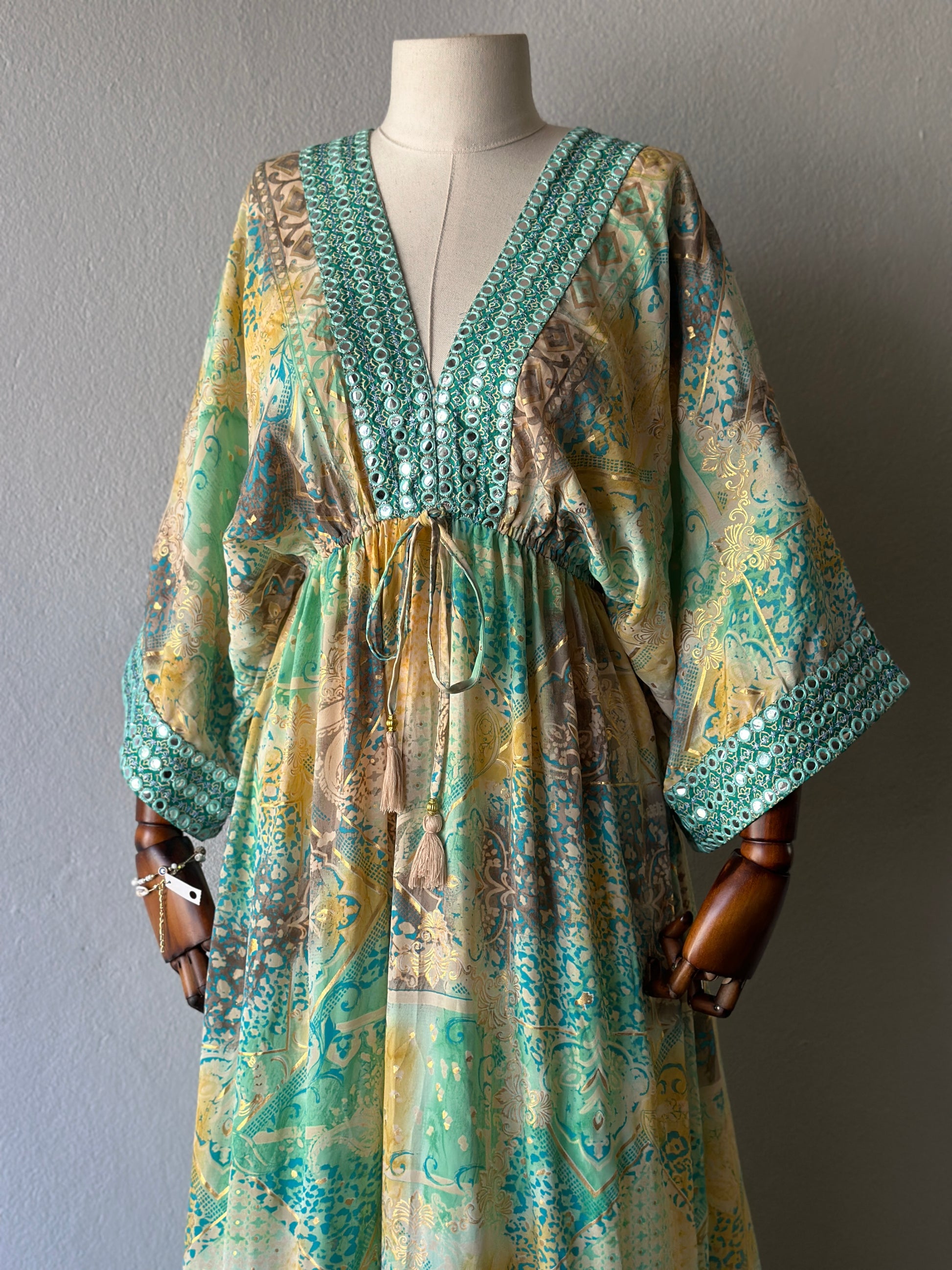 Etnik desenleri, hafif dökümlü dokusu ve göz alıcı yeşil tonlarıyla bu elbise hem sahil hem şehir stilinize zarif bir dokunuş katıyor. Göğüs altından ayarlanabilir bağcığı ve geniş kesimli kollarıyla rahatlık ve şıklığı bir arada sunar.