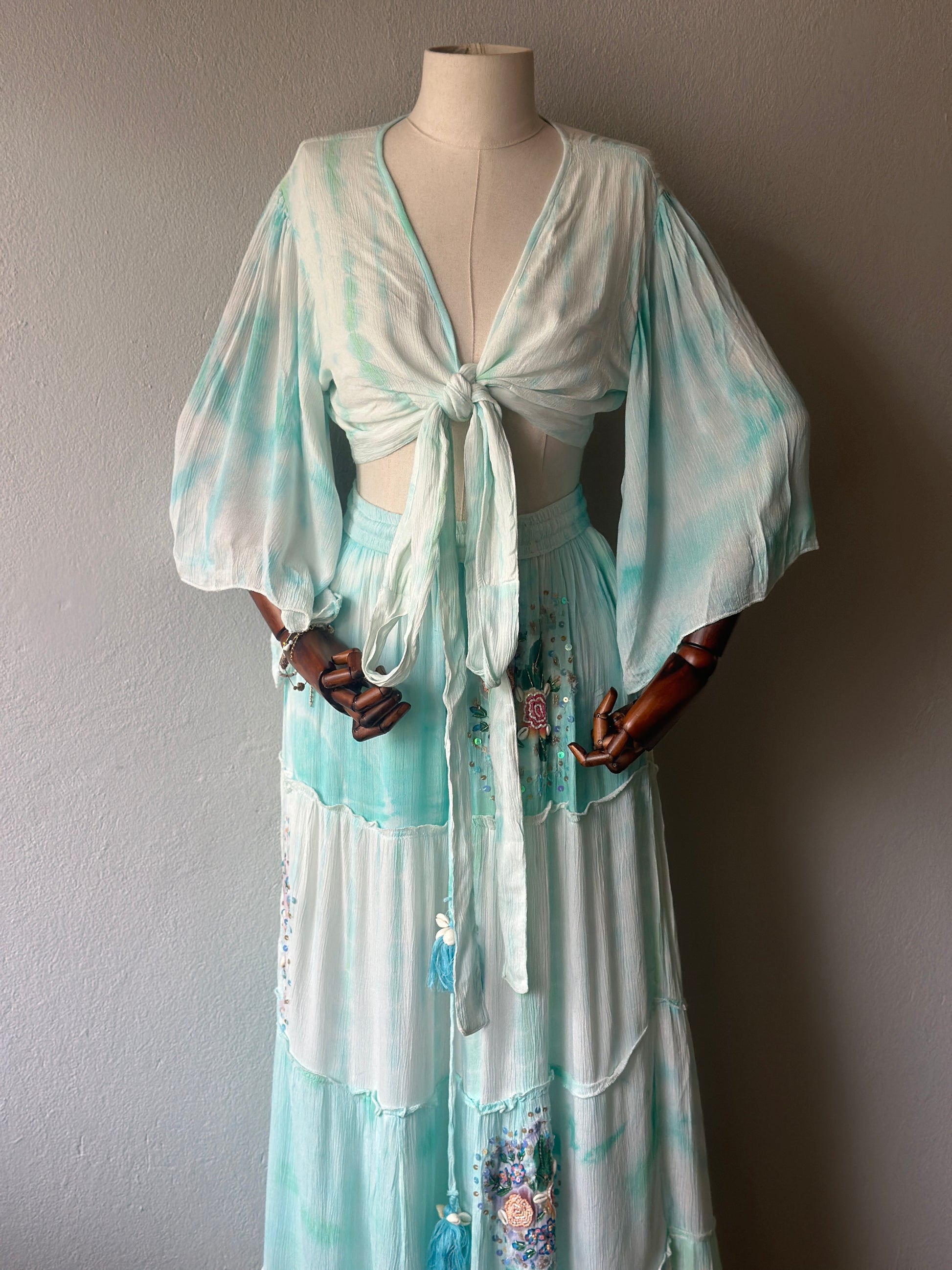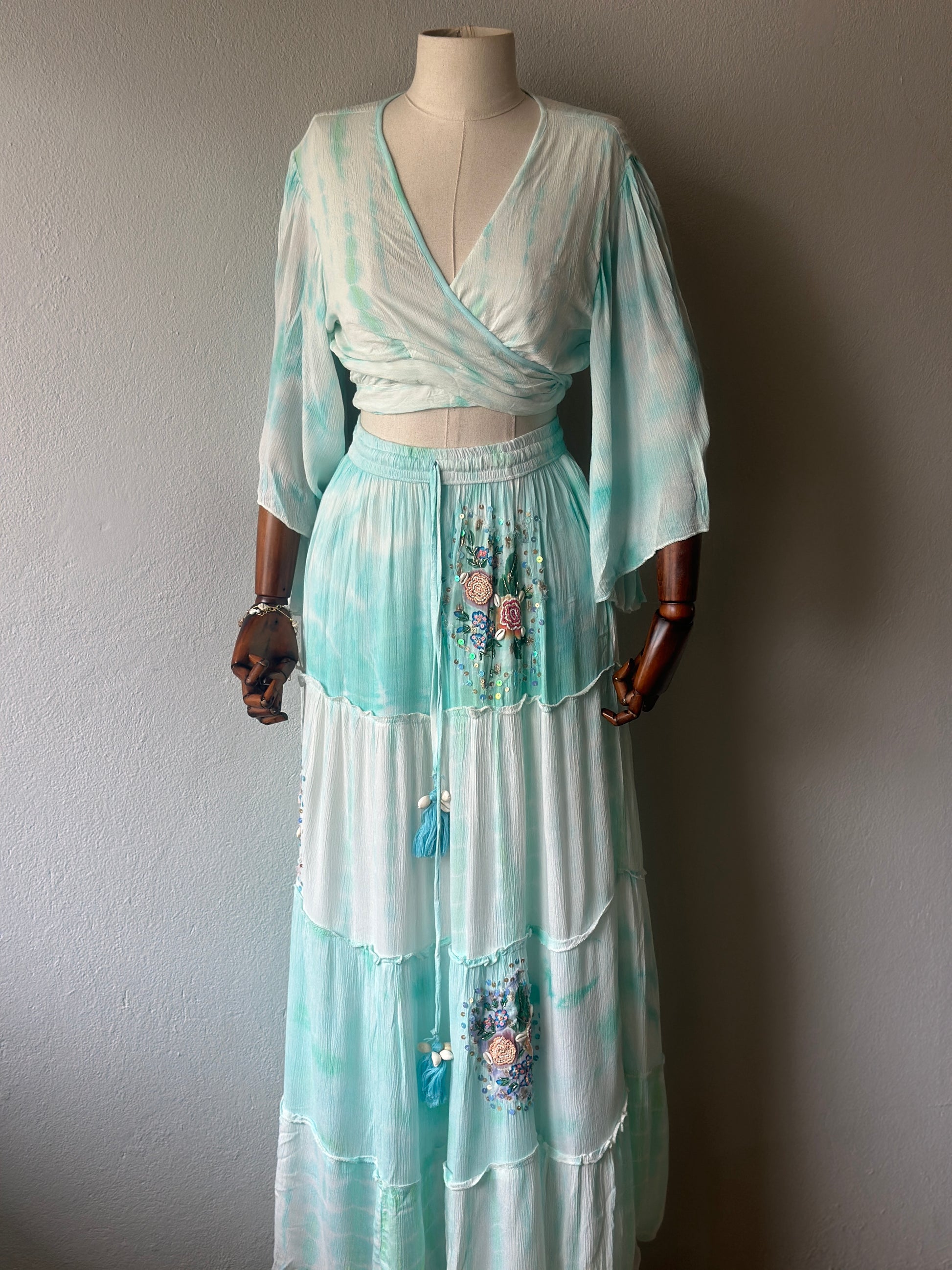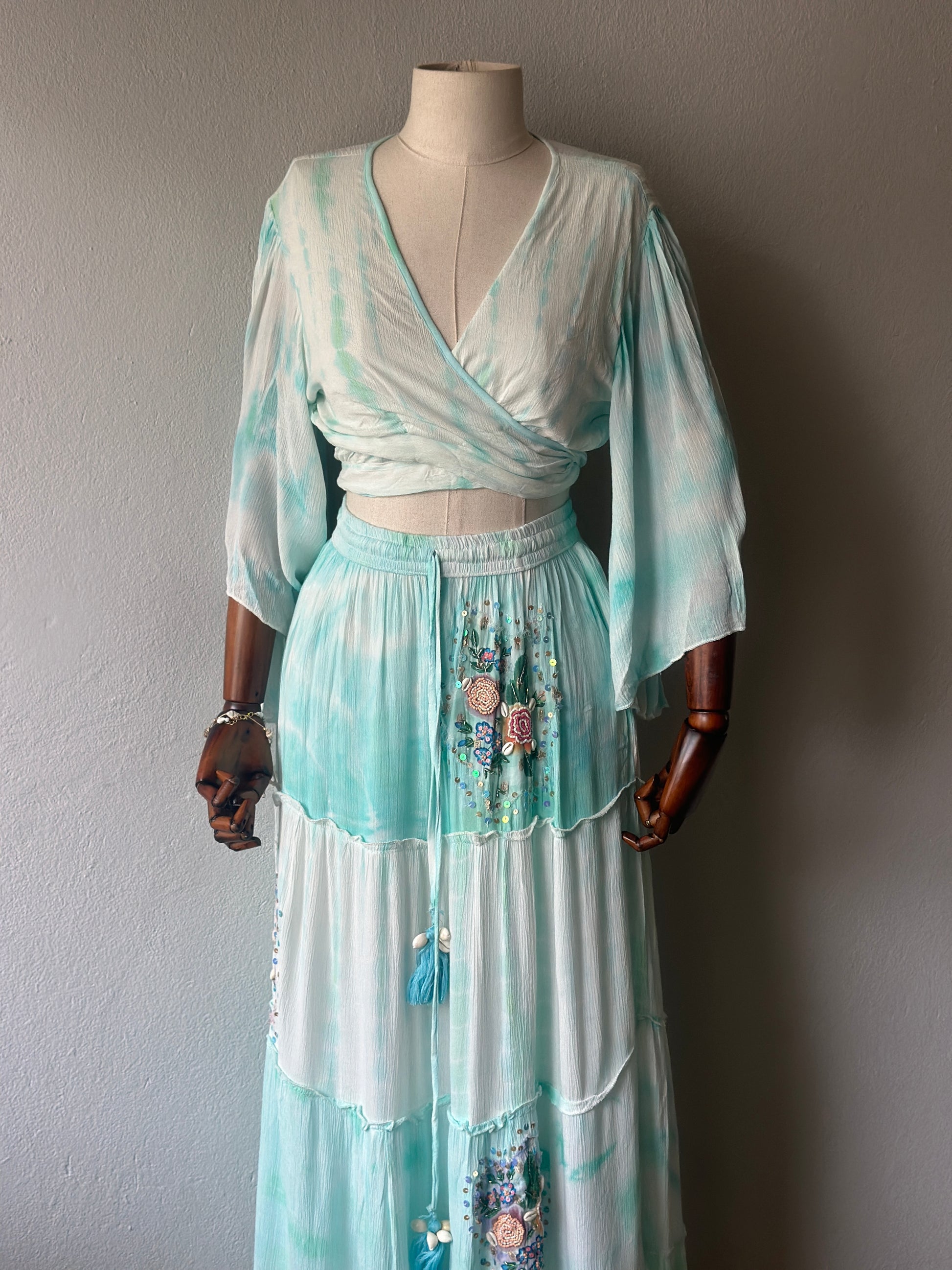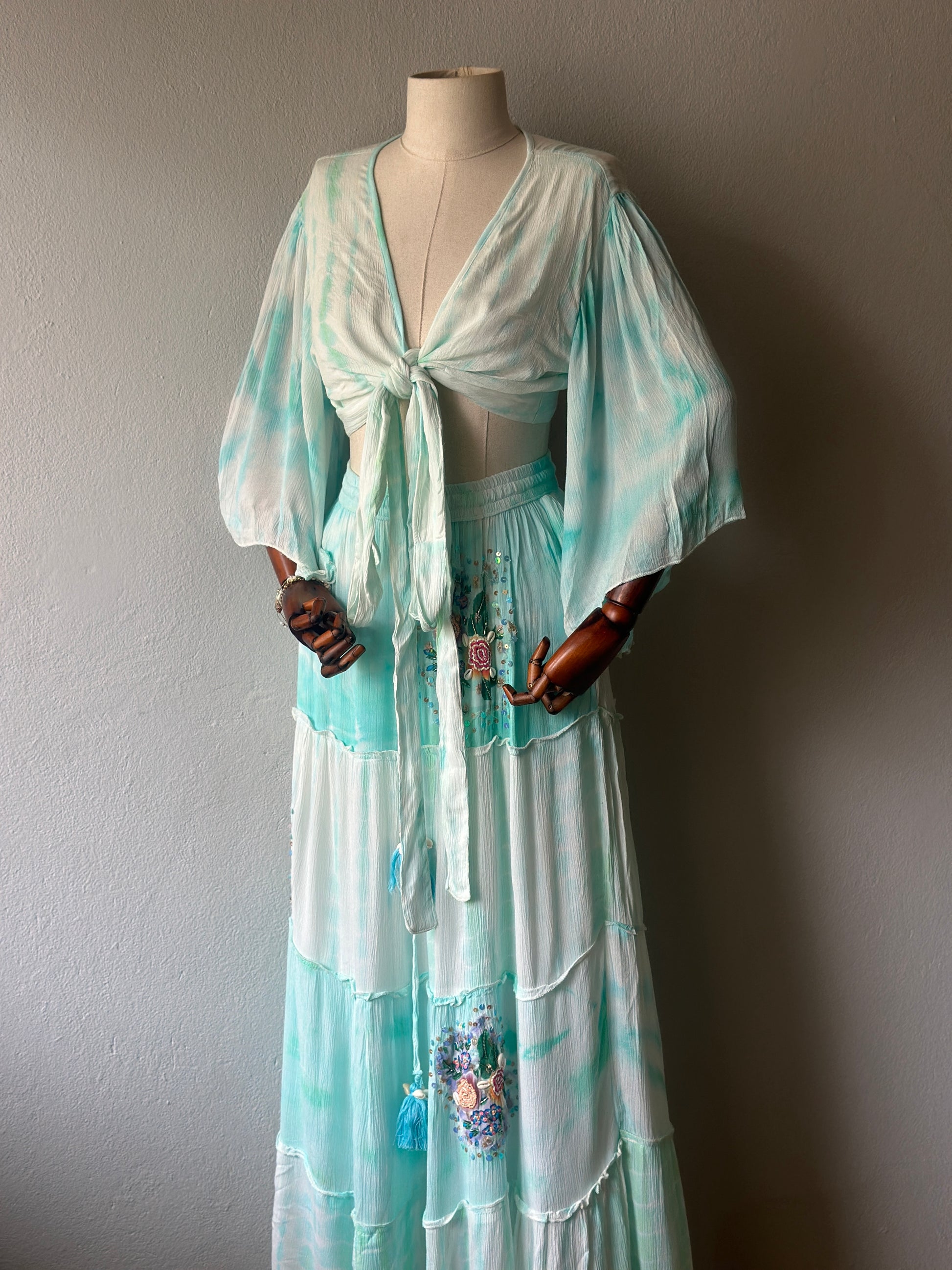 Bohem ve zarif stilin en şık yansıması! Yumuşak su yeşili tonlarındaki bu iki parçalı takım, el işçiliğiyle hazırlanmış çiçek nakışları, boncuk ve pul detaylarıyla öne çıkıyor.