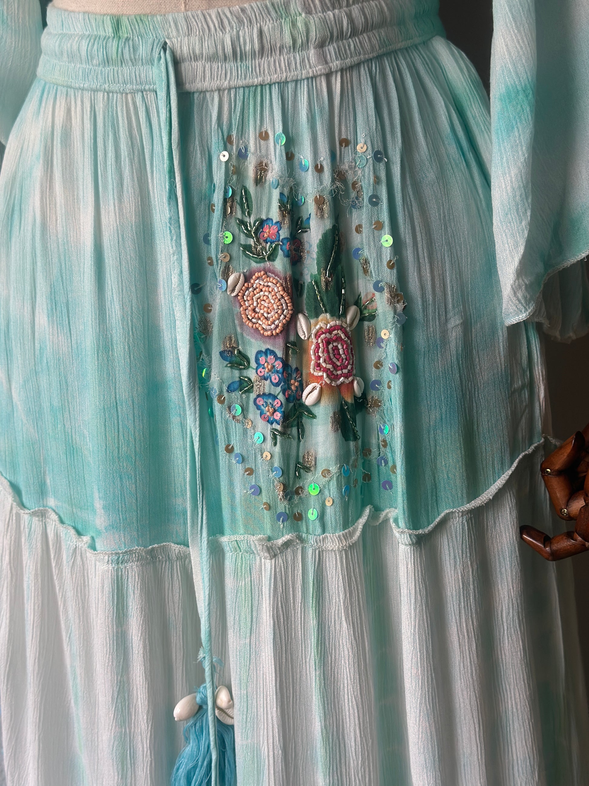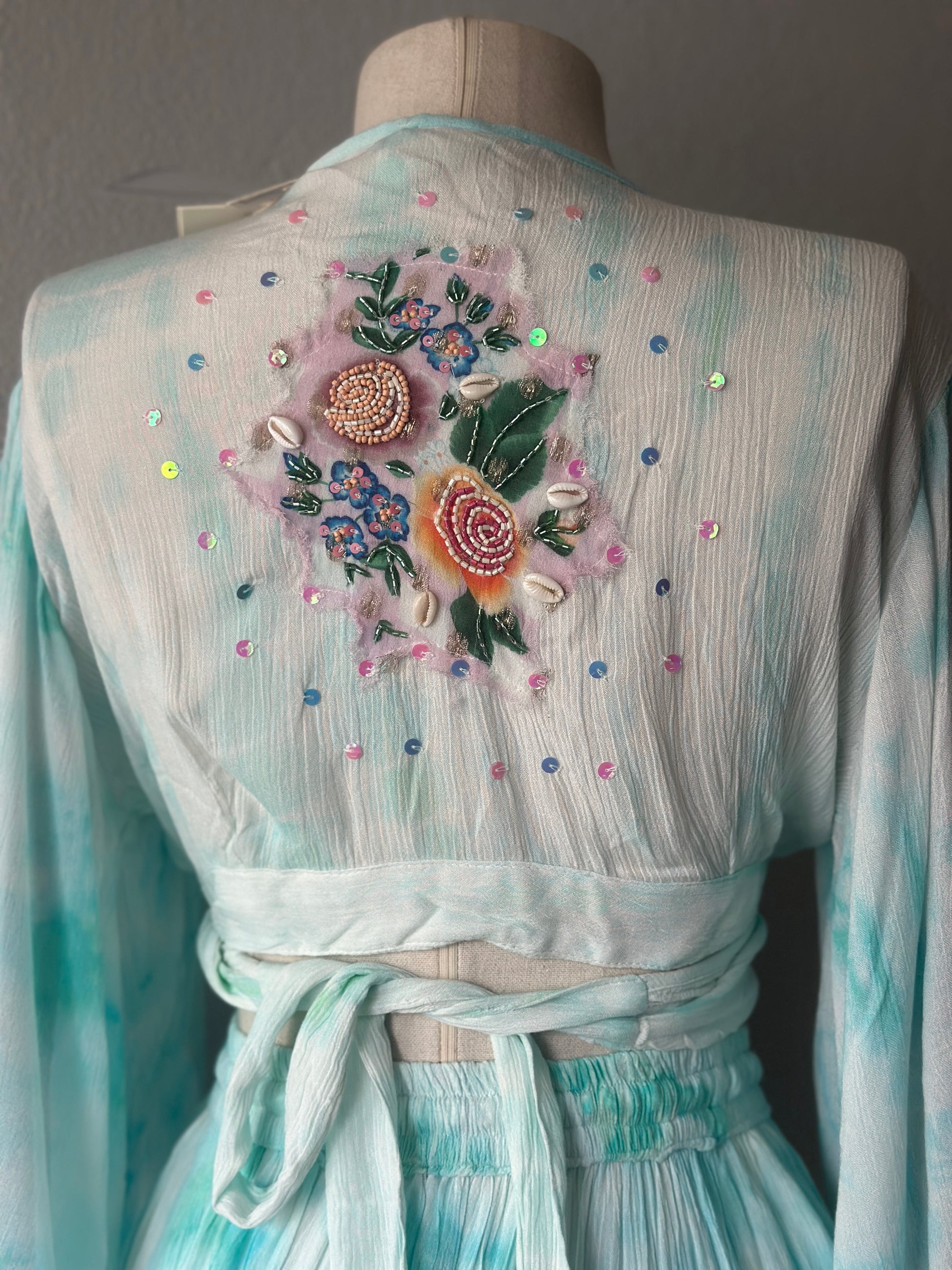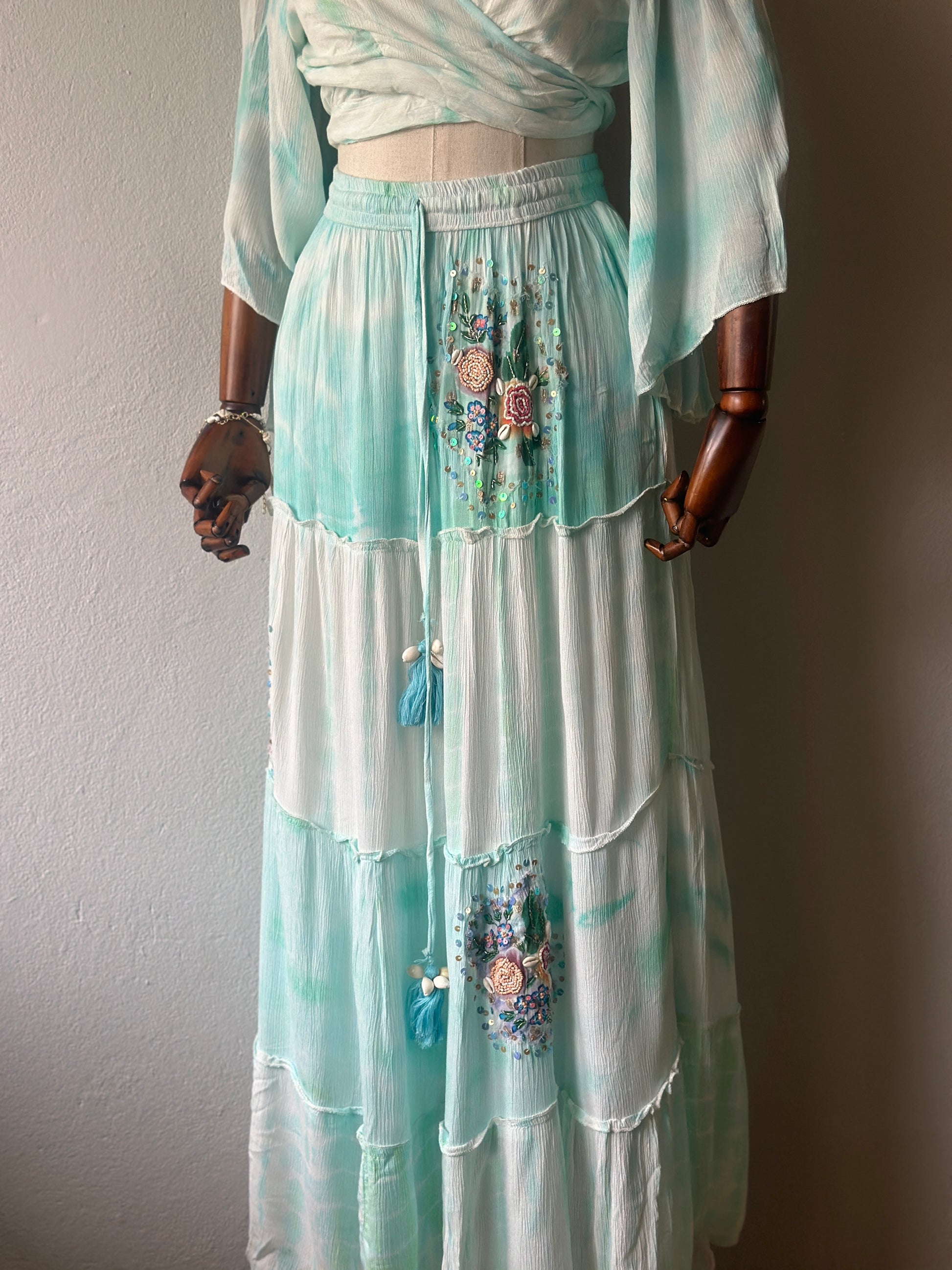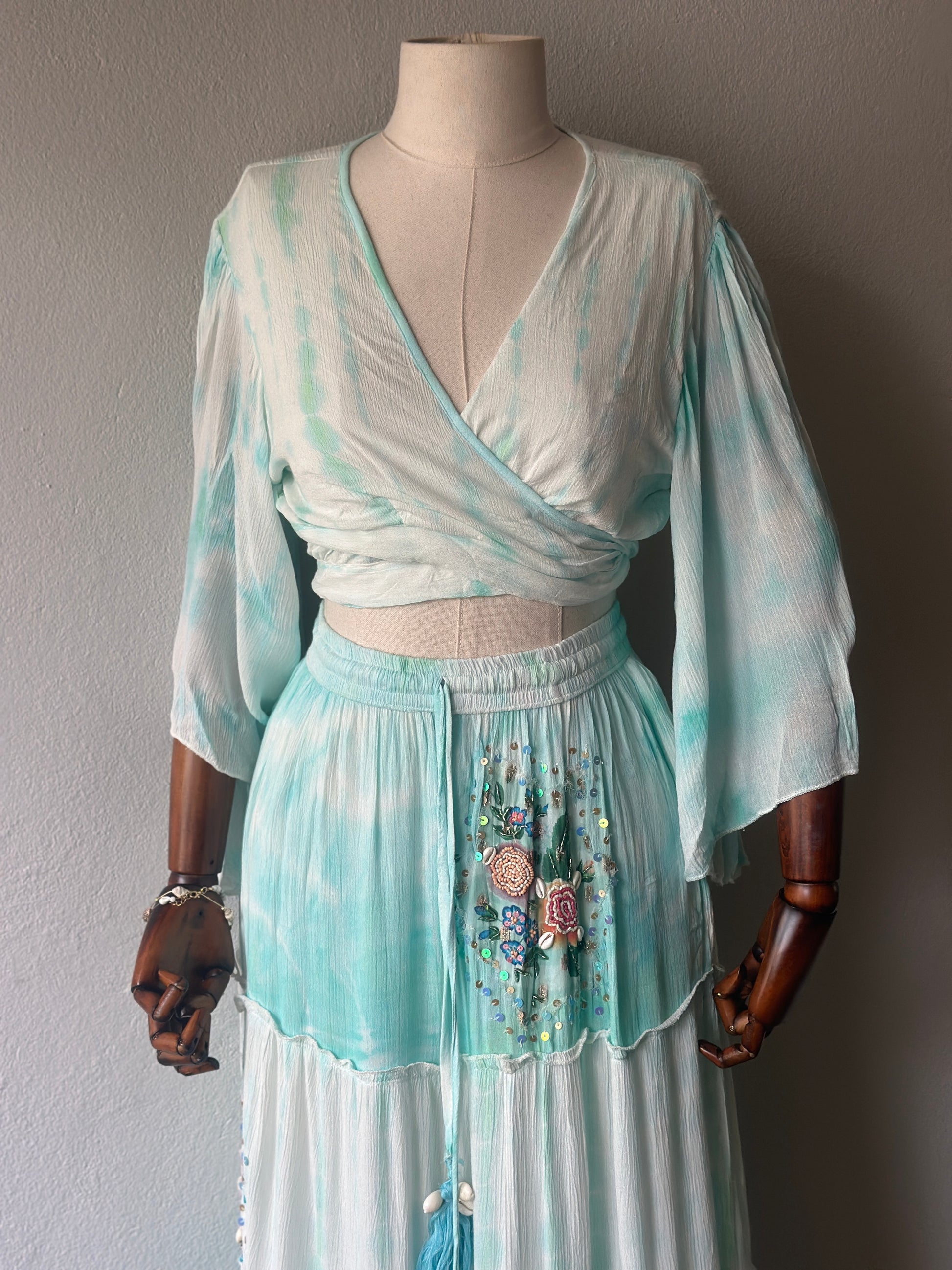 Bohem ve zarif stilin en şık yansıması! Yumuşak su yeşili tonlarındaki bu iki parçalı takım, el işçiliğiyle hazırlanmış çiçek nakışları, boncuk ve pul detaylarıyla öne çıkıyor.