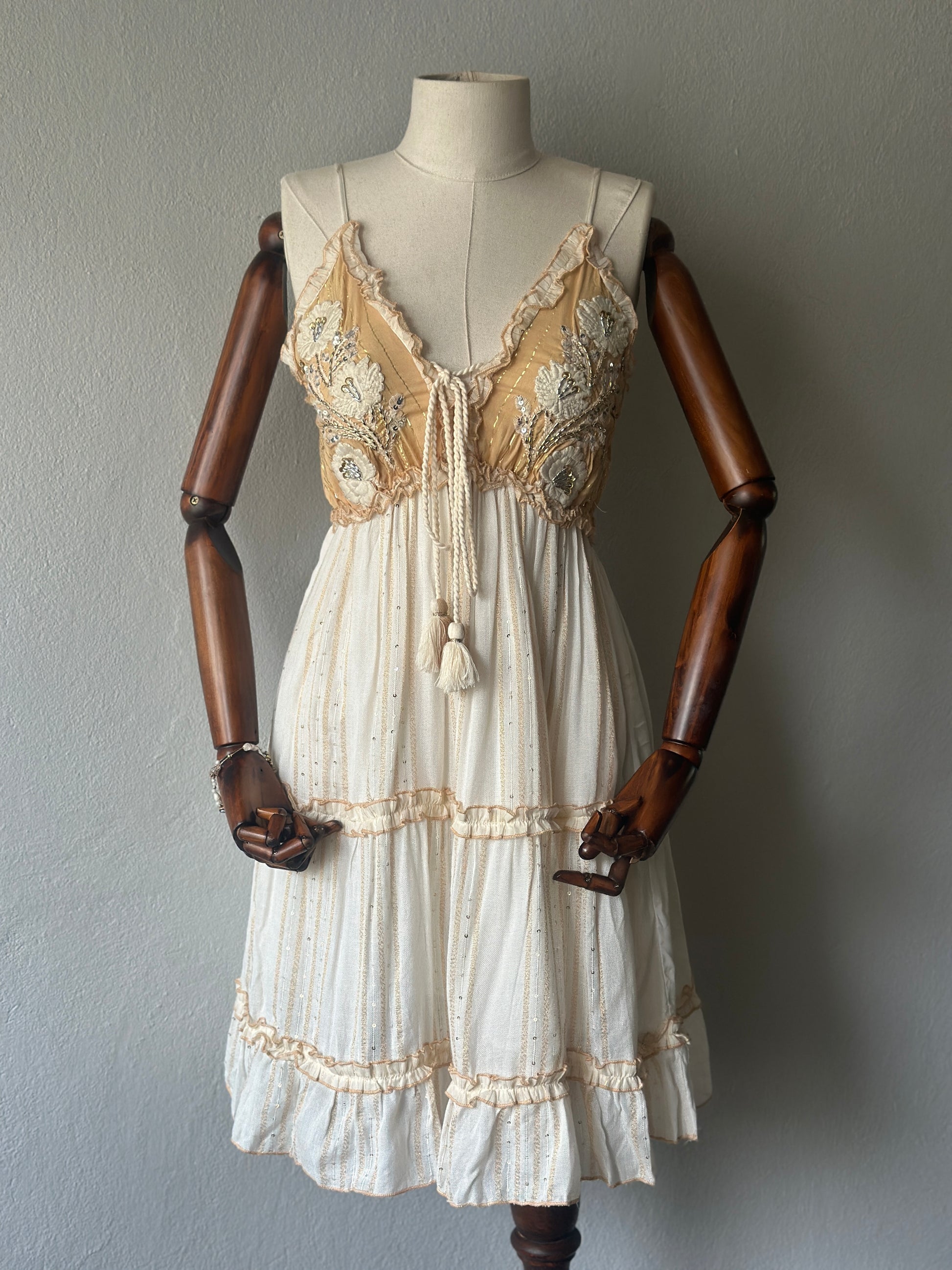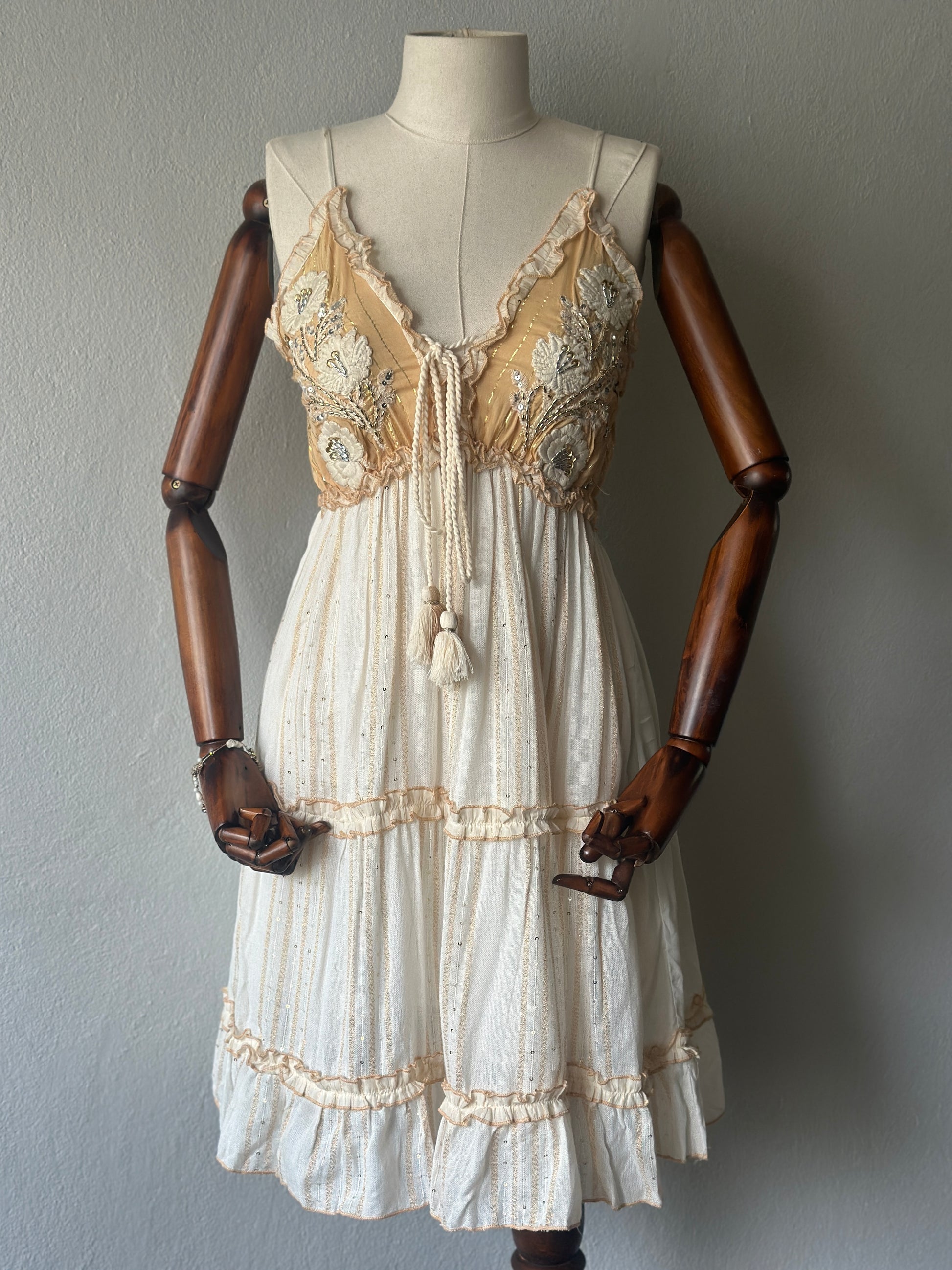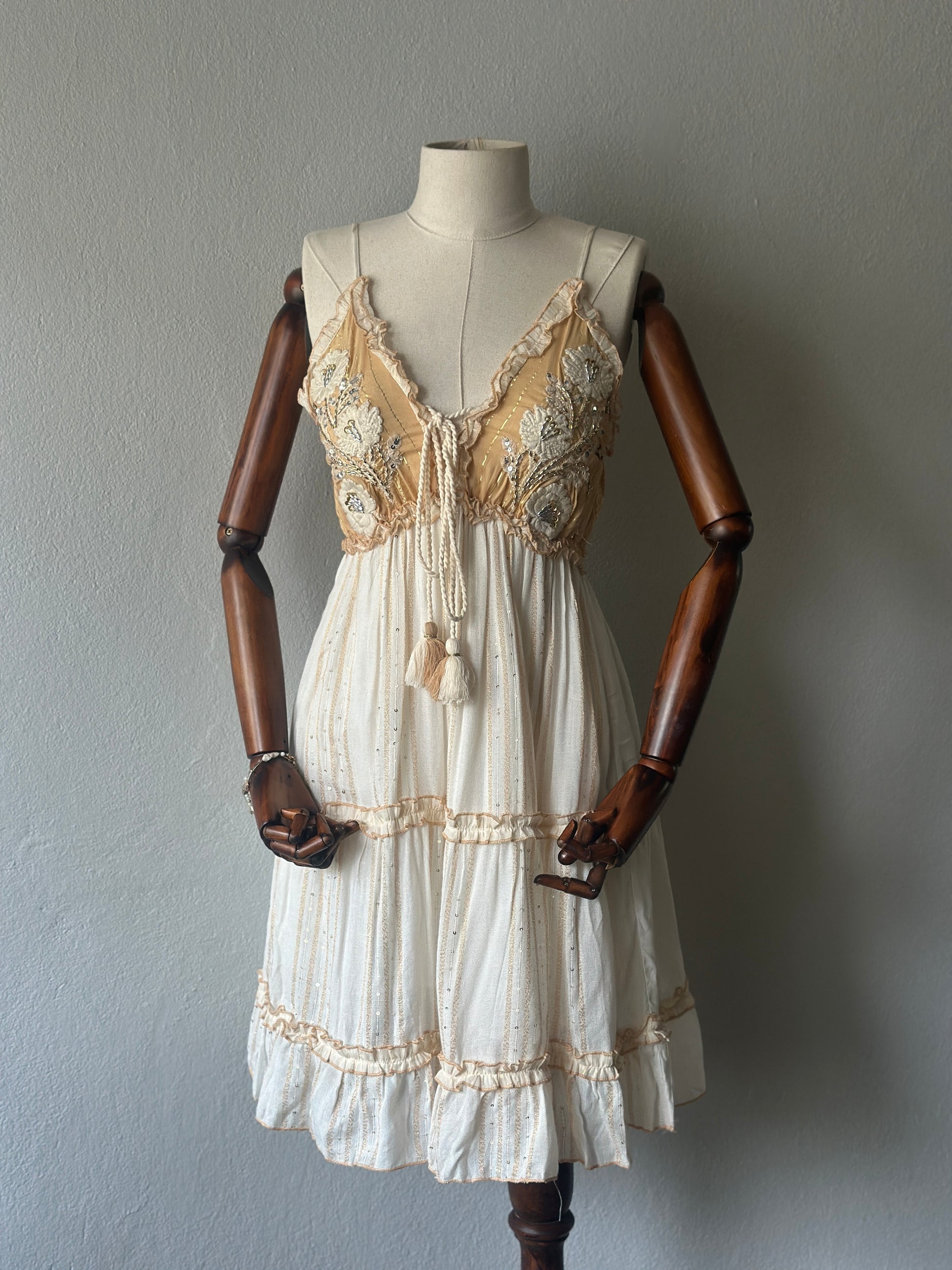 Romantik ve zarif detaylarıyla göz kamaştıran bu kısa elbise, elde işlenmiş boncuk ve dantel süslemeleriyle benzersiz bir tasarıma sahiptir.