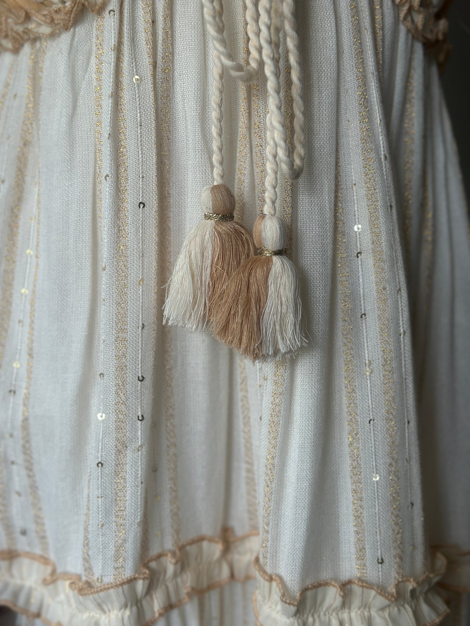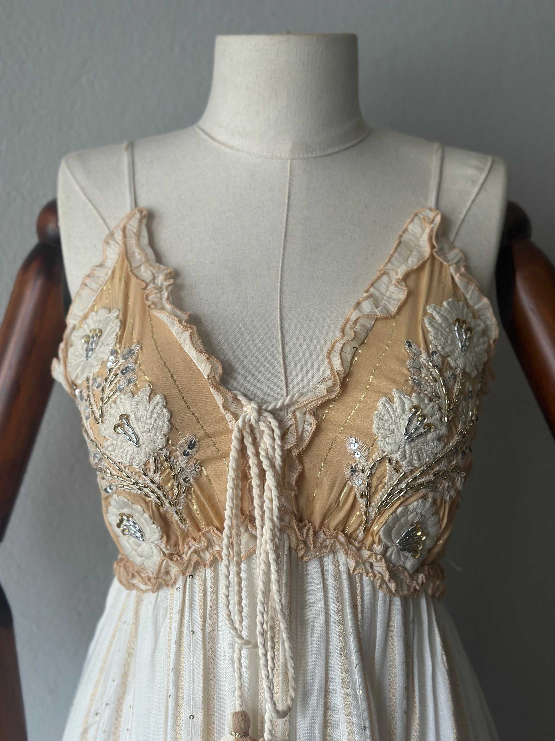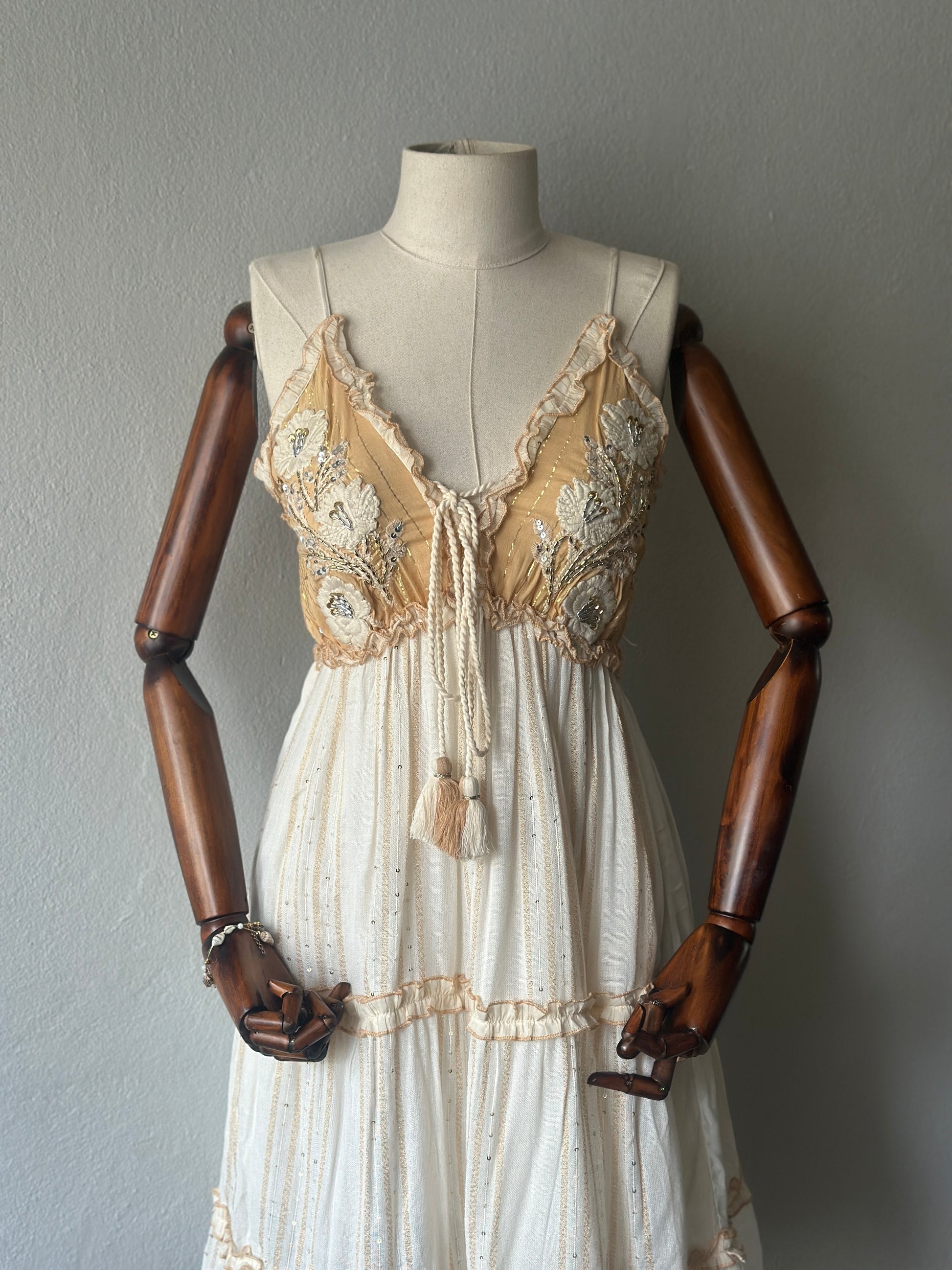 Romantik ve zarif detaylarıyla göz kamaştıran bu kısa elbise, elde işlenmiş boncuk ve dantel süslemeleriyle benzersiz bir tasarıma sahiptir.