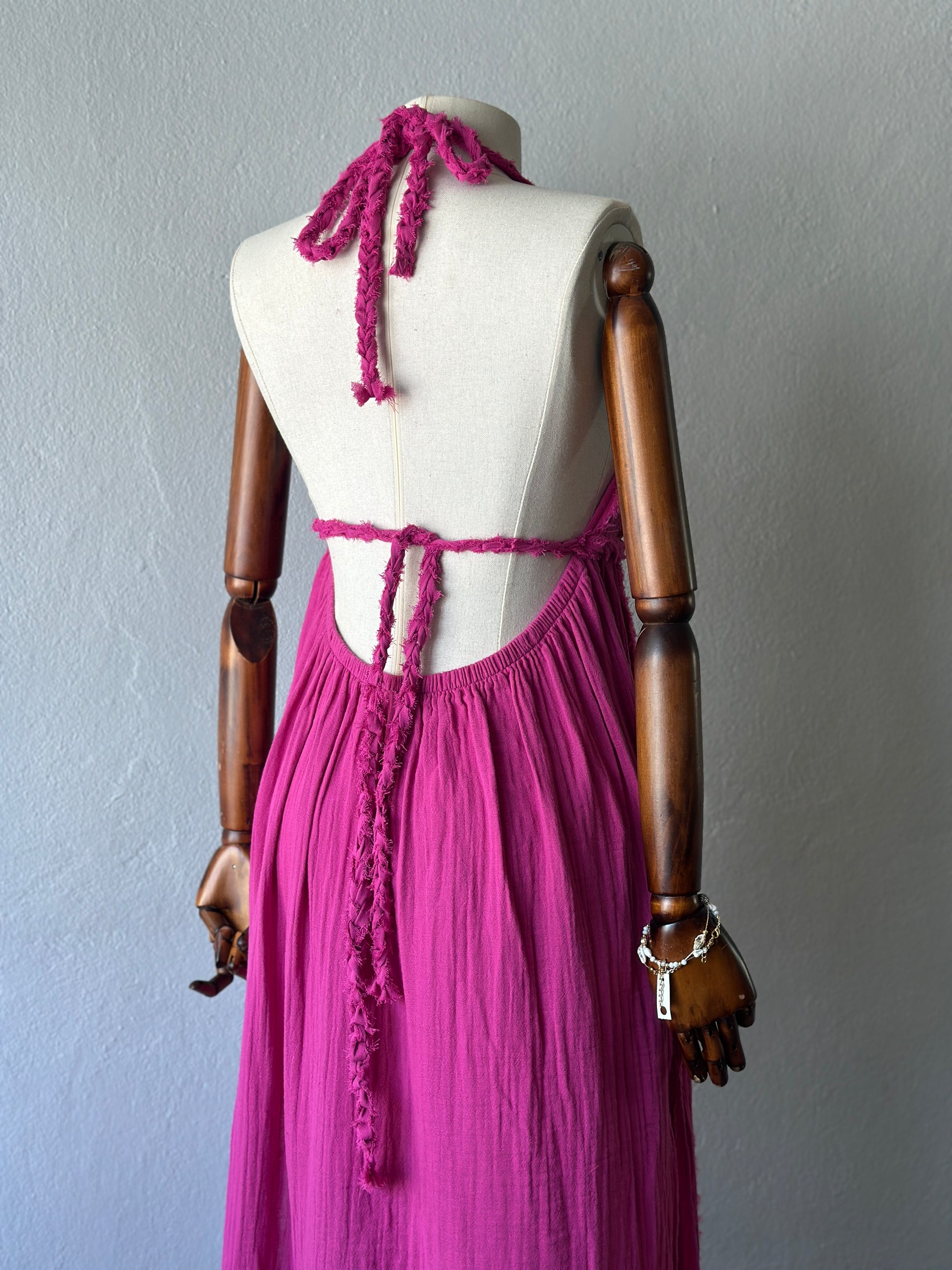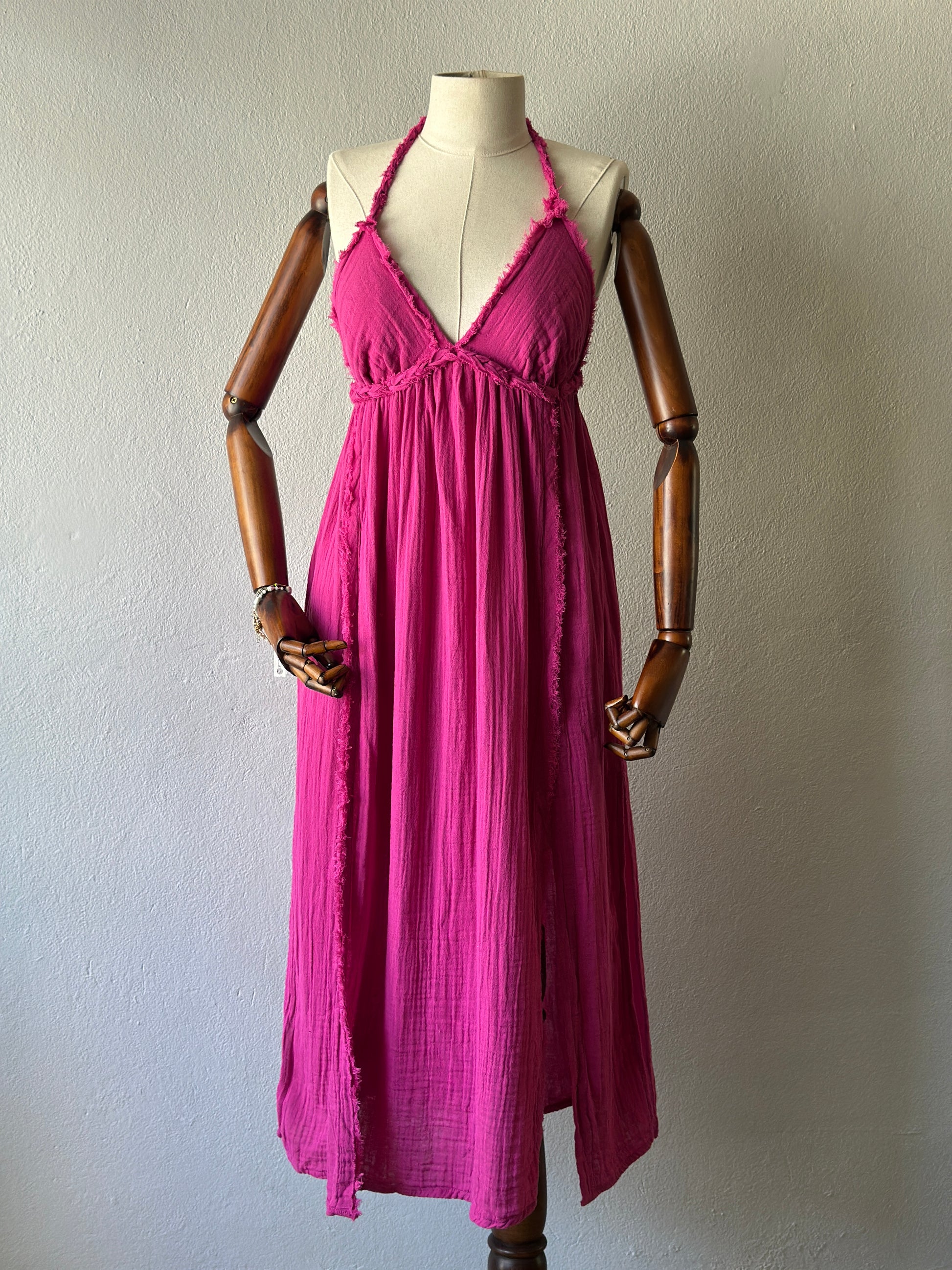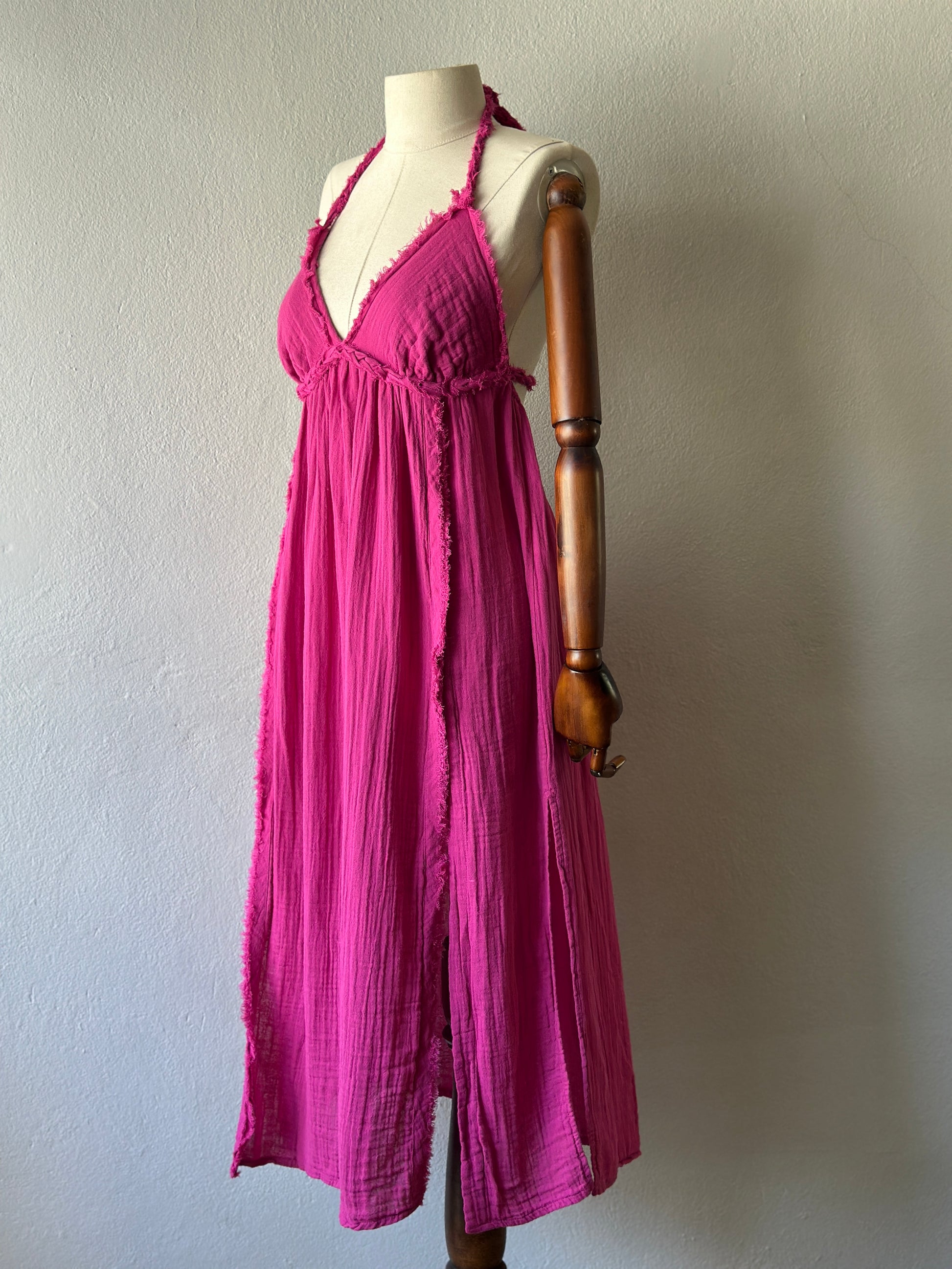 Yazın enerjisini yansıtan bu fuşya elbise, hafif ve rahat dokusuyla öne çıkar. Boyundan ve sırttan bağlamalı modeli sayesinde bedene göre ayarlanabilir, sırt dekoltesiyle dikkat çeker.