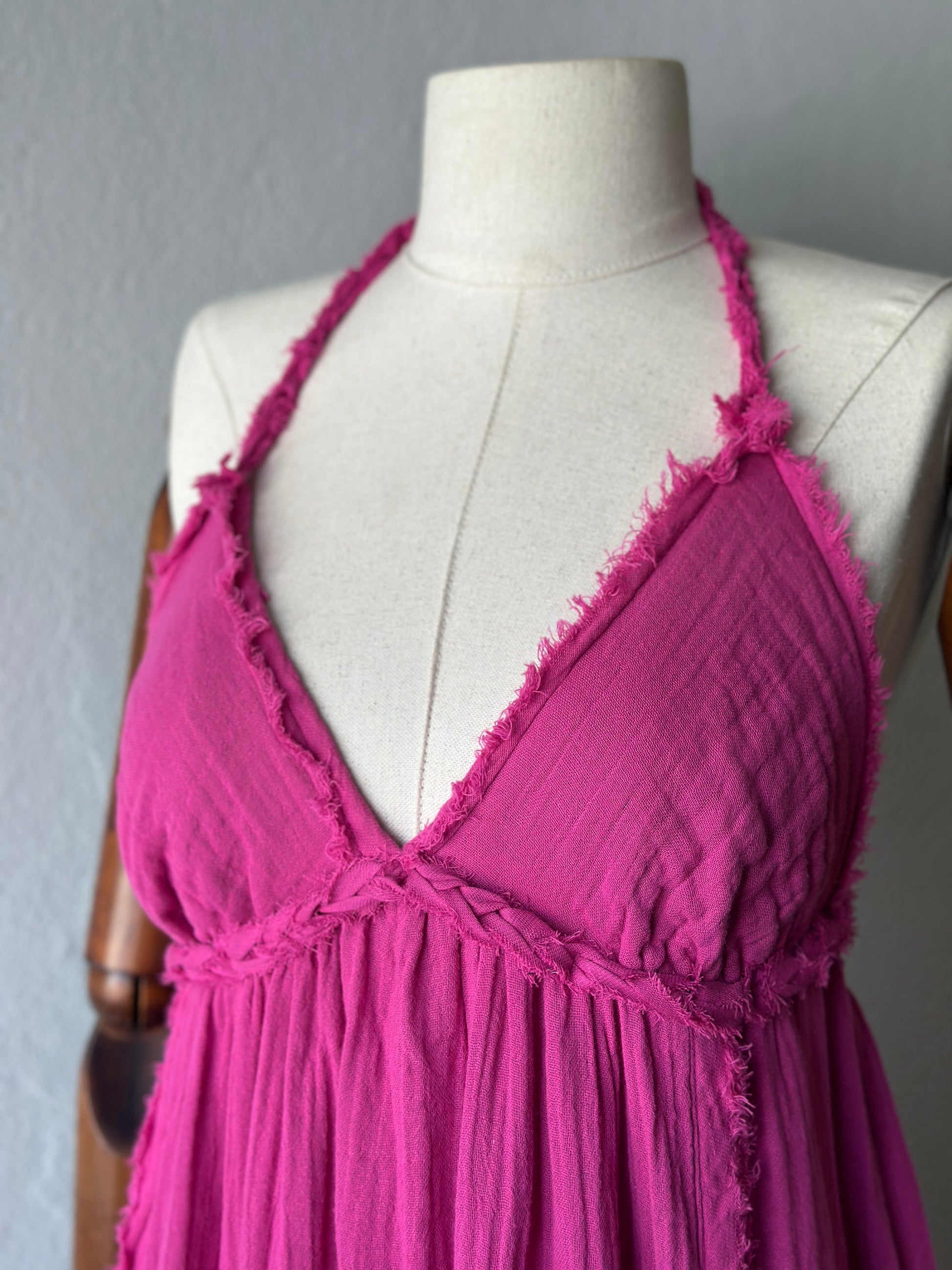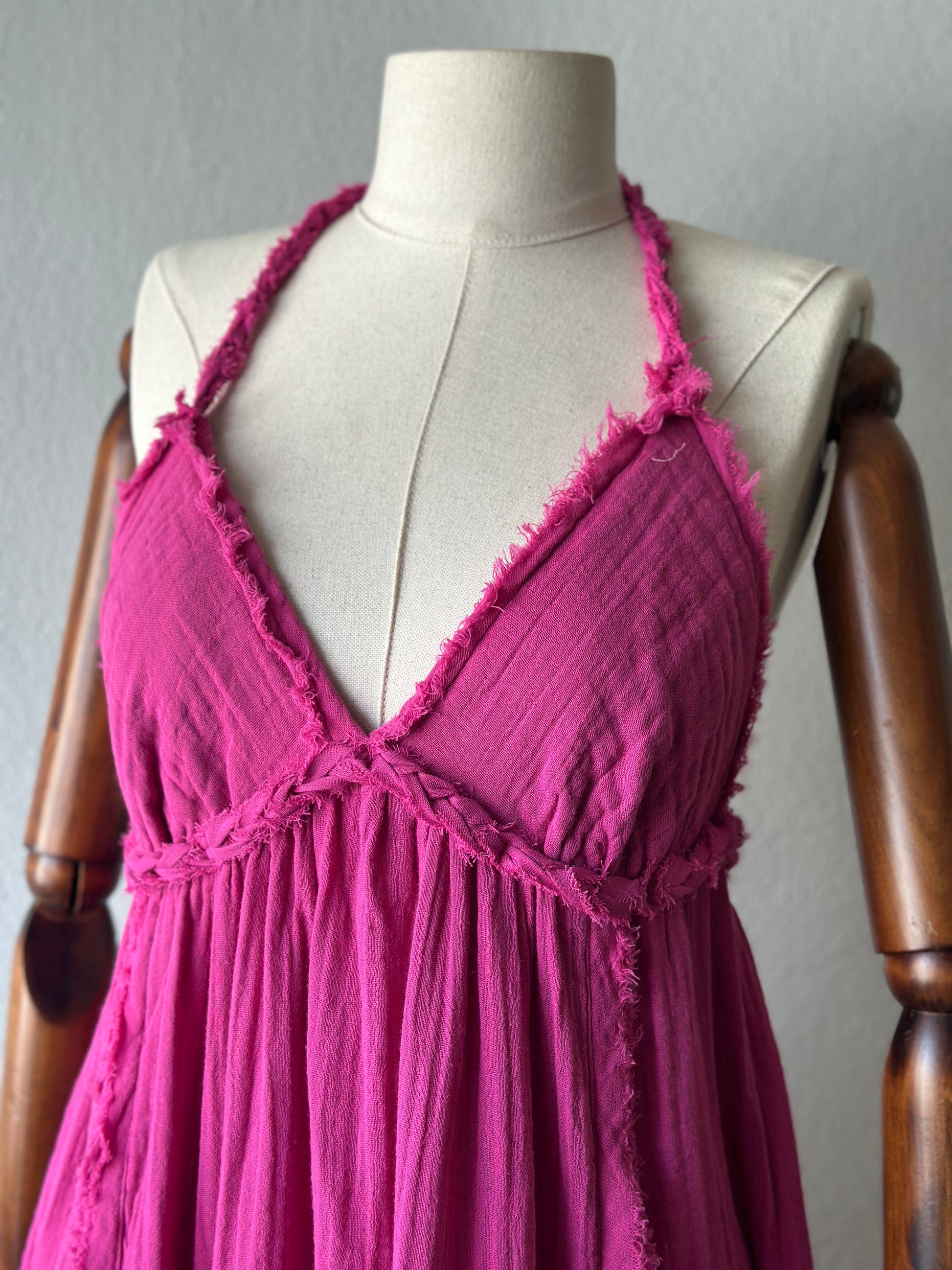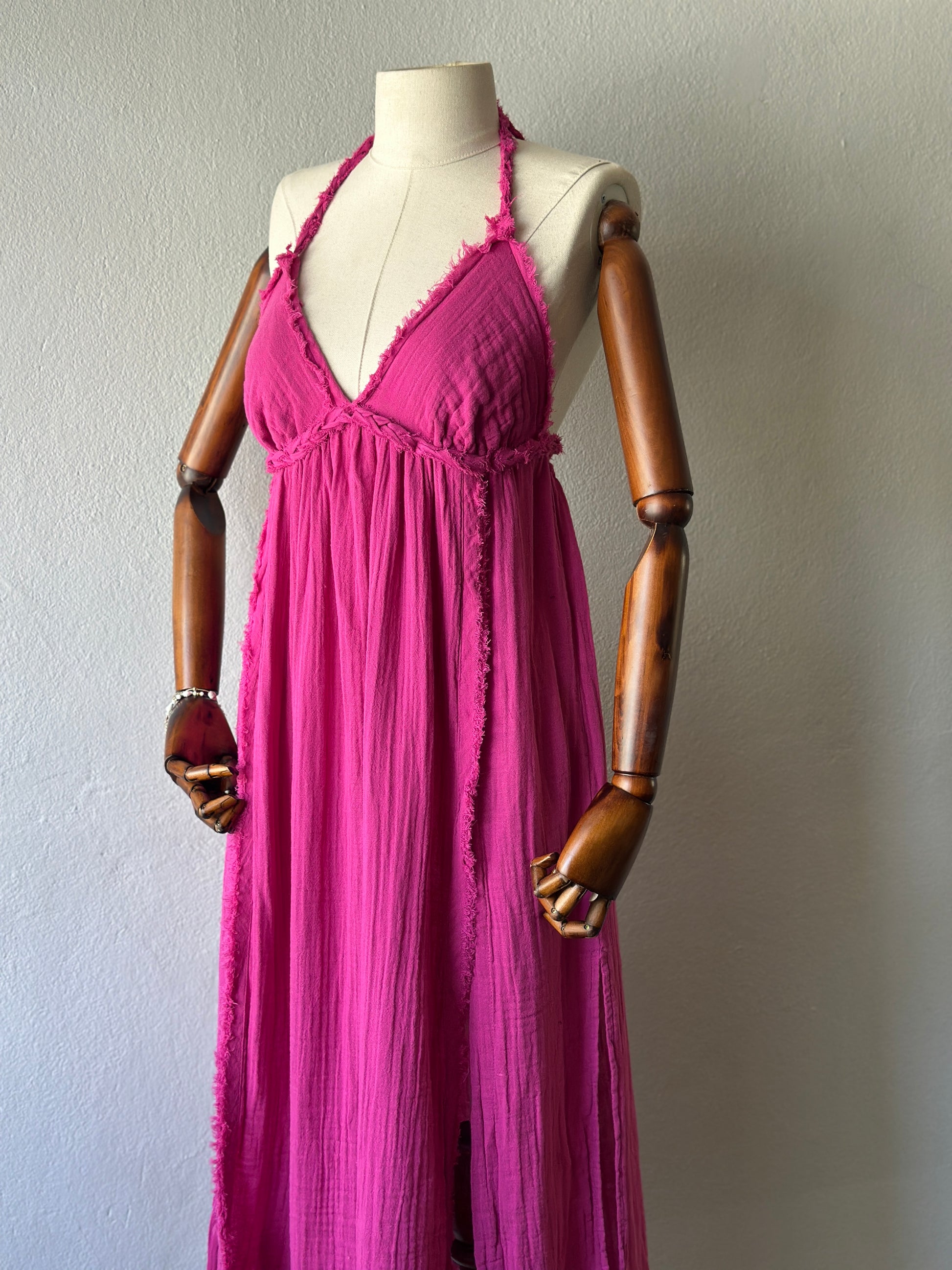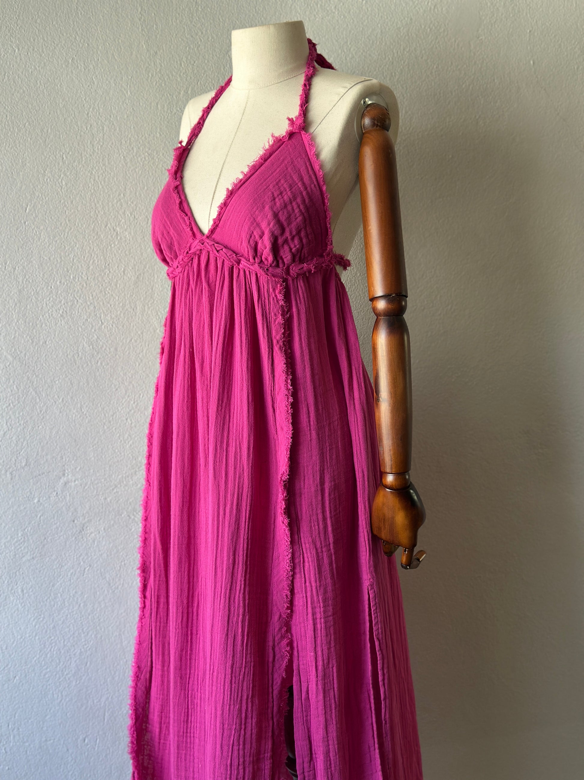 Yazın enerjisini yansıtan bu fuşya elbise, hafif ve rahat dokusuyla öne çıkar. Boyundan ve sırttan bağlamalı modeli sayesinde bedene göre ayarlanabilir, sırt dekoltesiyle dikkat çeker.